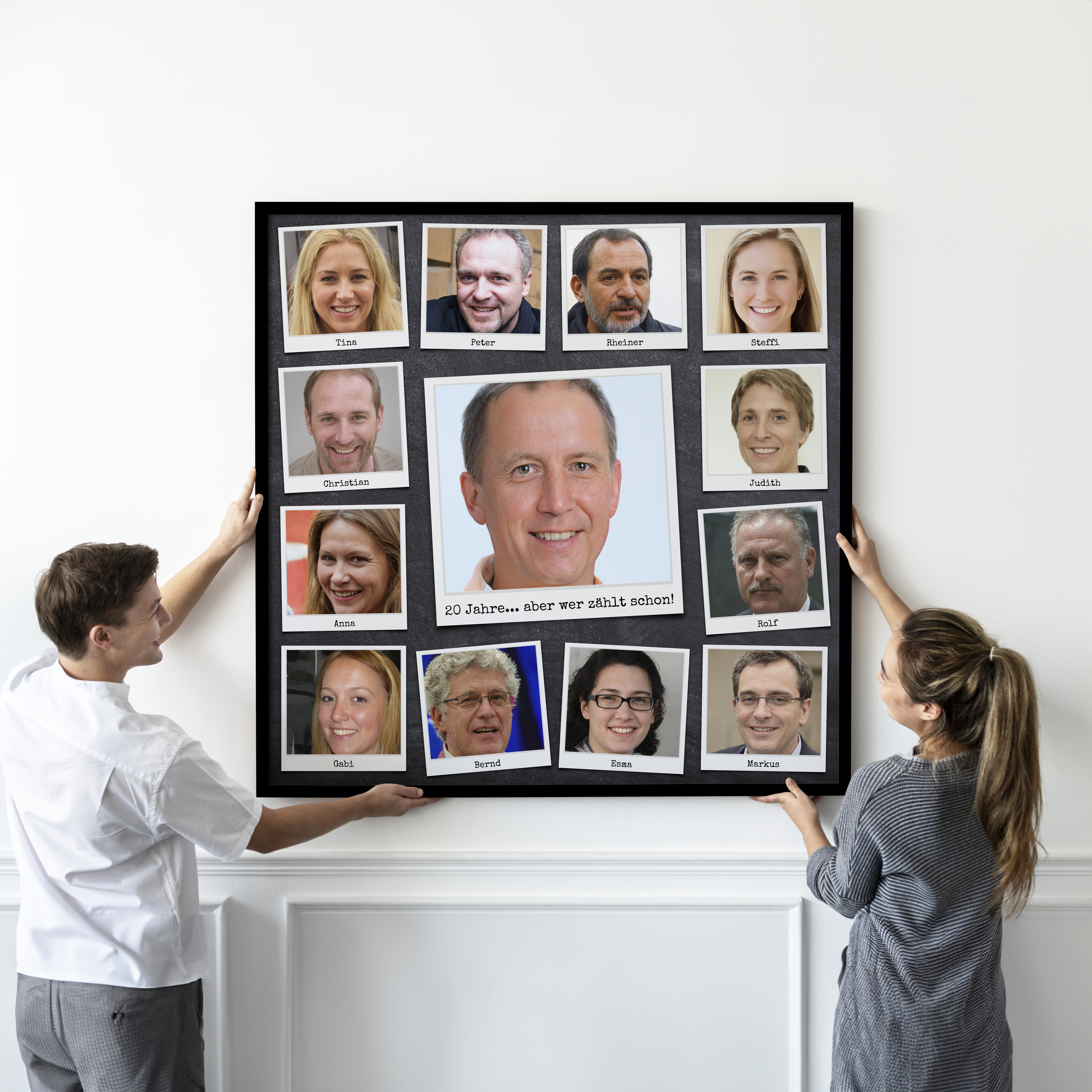 Mache den Abschied unvergesslich! Erstelle eine einzigartige Fotocollage als Abschiedsgeschenk zum Ruhestand. Gestalte eine Collage im Polaroidstil, mit individueller Beschriftung für jedes Foto – mit Bildern der Kollegen und einem persönlichen Abschiedsgruss.