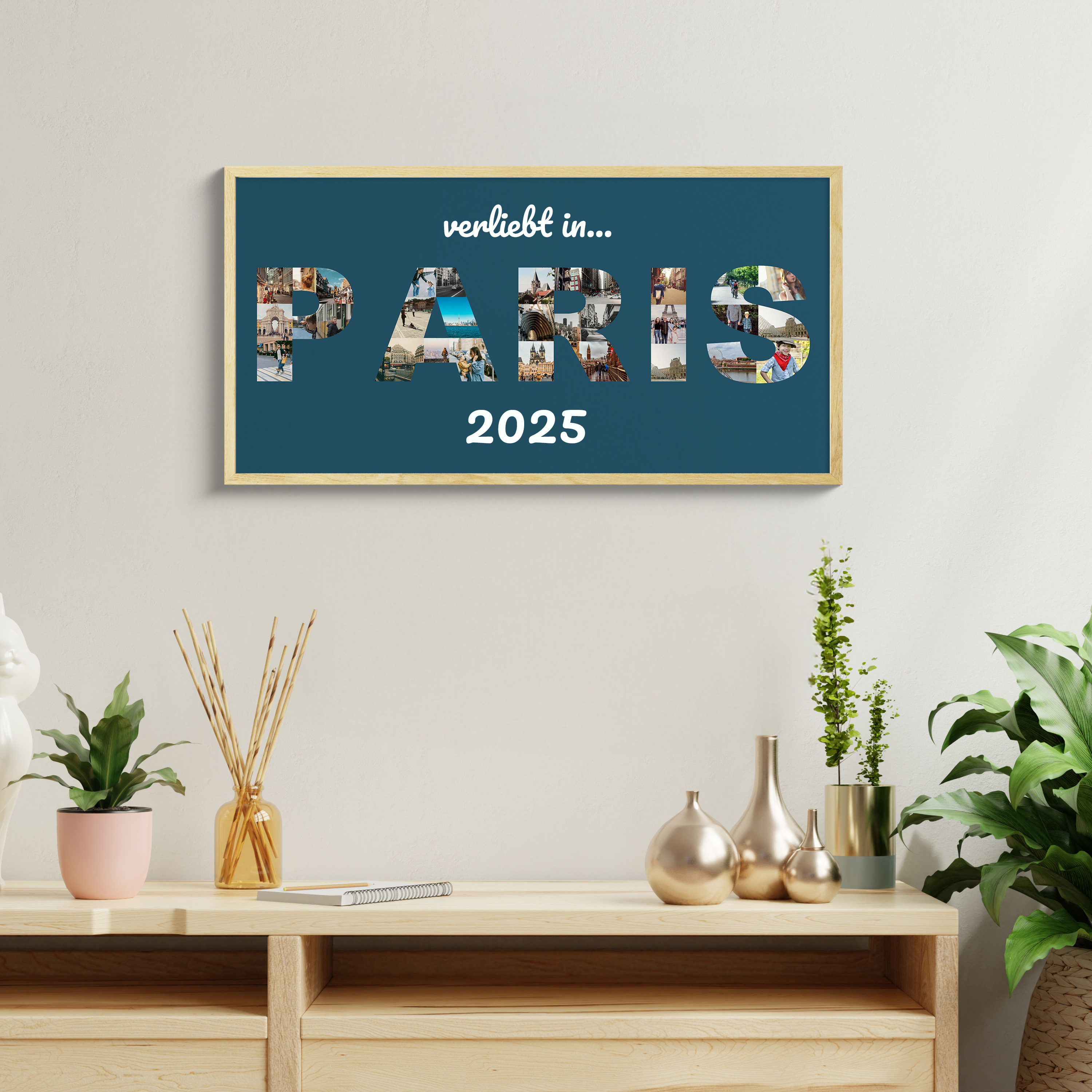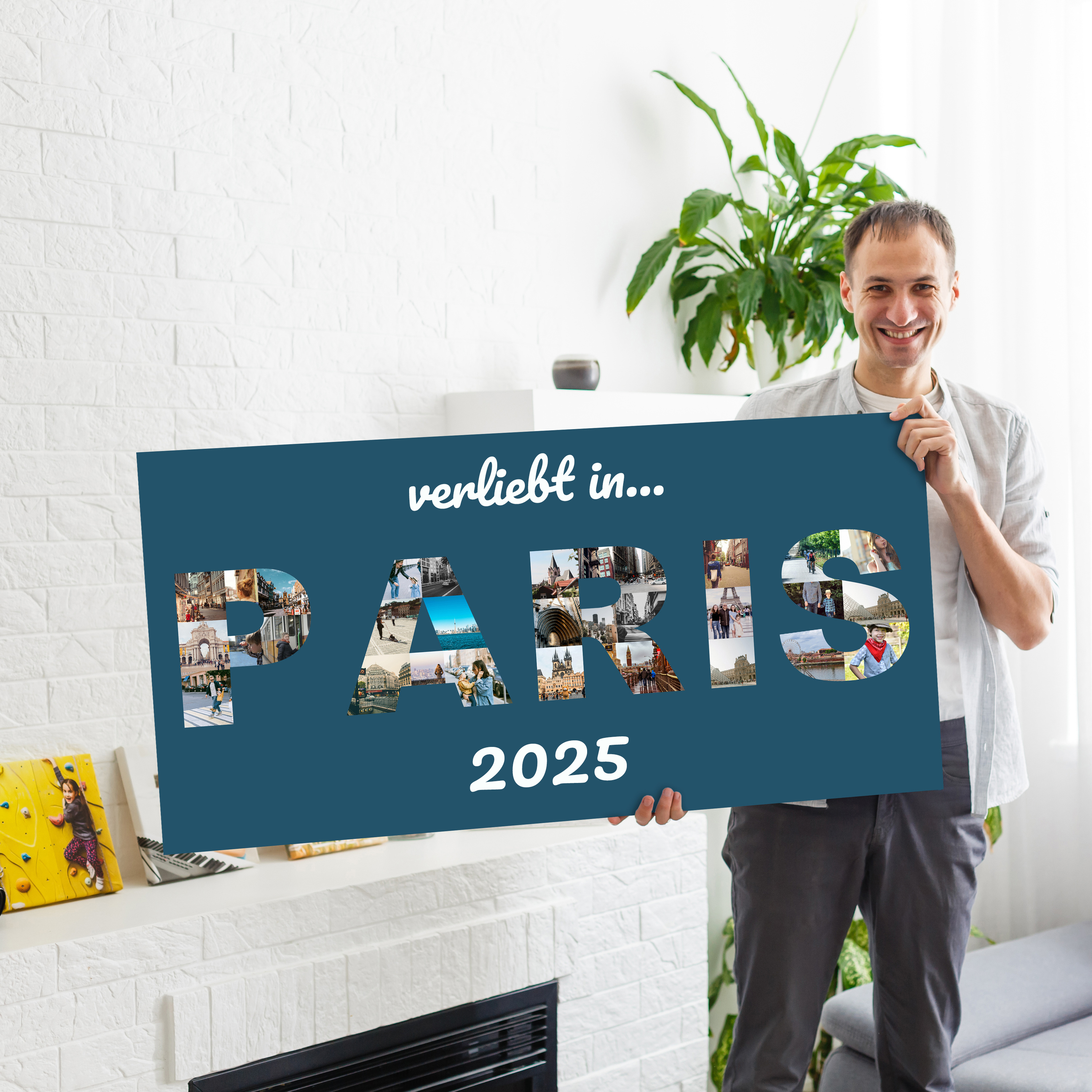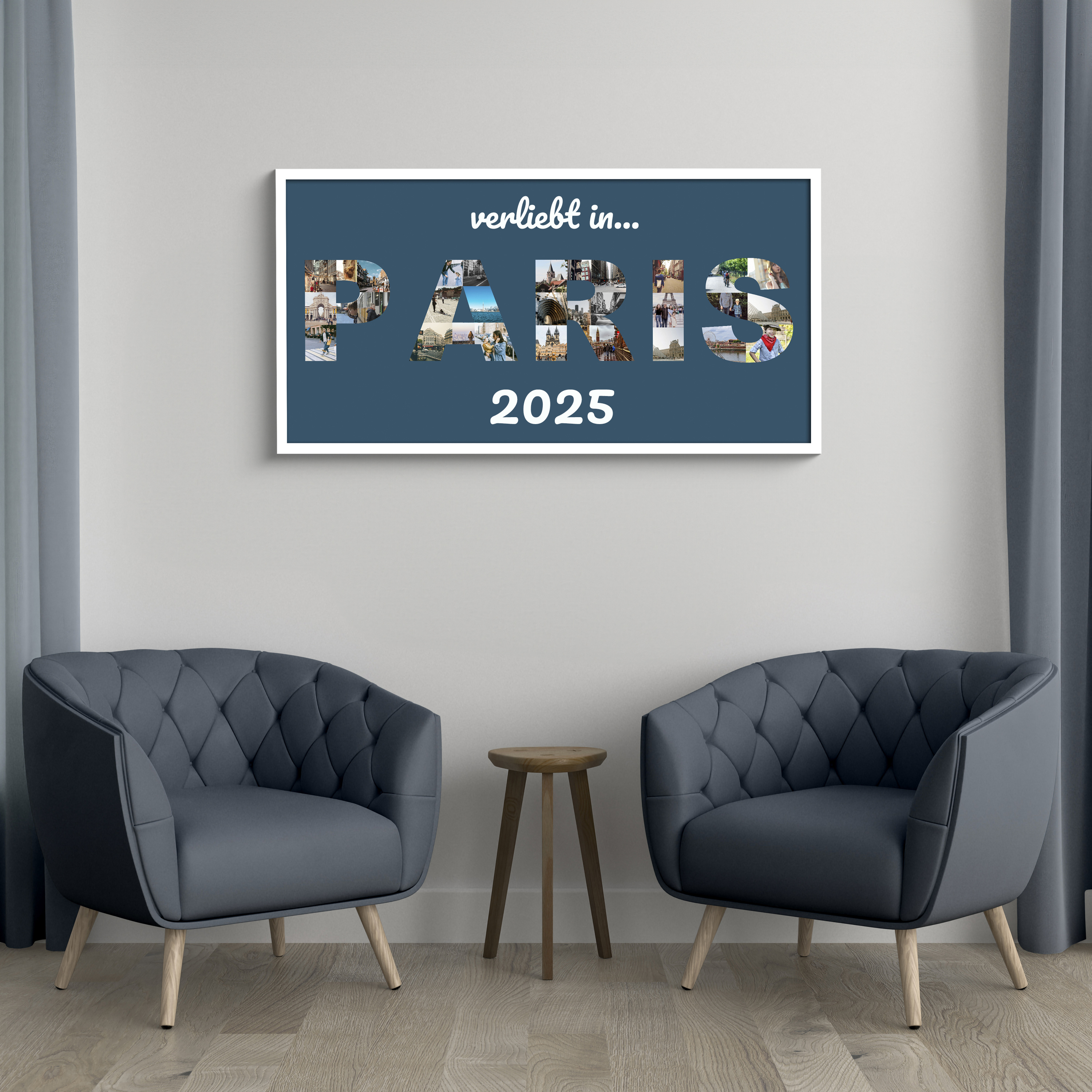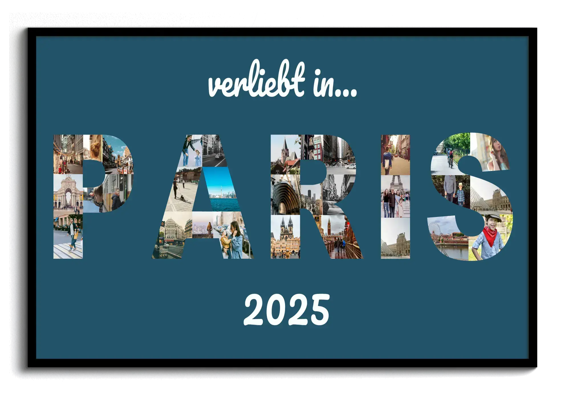 Jetzt gestalten und deine Reise festhalten: Diese Buchstabencollage zeigt den Ortsnamen Paris als Textform, gefüllt mit Urlaubsfotos, auf Leinwand mit dunkelblauem Hintergrund. Ergänze den Zusatz verliebt in und die Jahreszahl – ideal für Reisefans, Paare oder Familien und als stilvolles Wohn-Highlight.