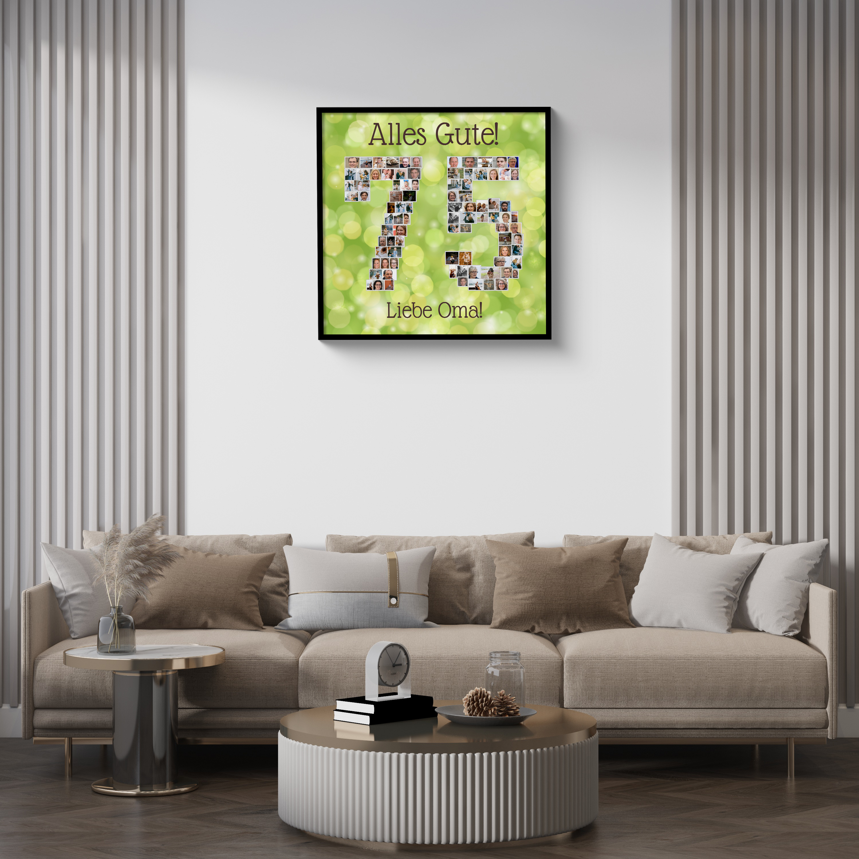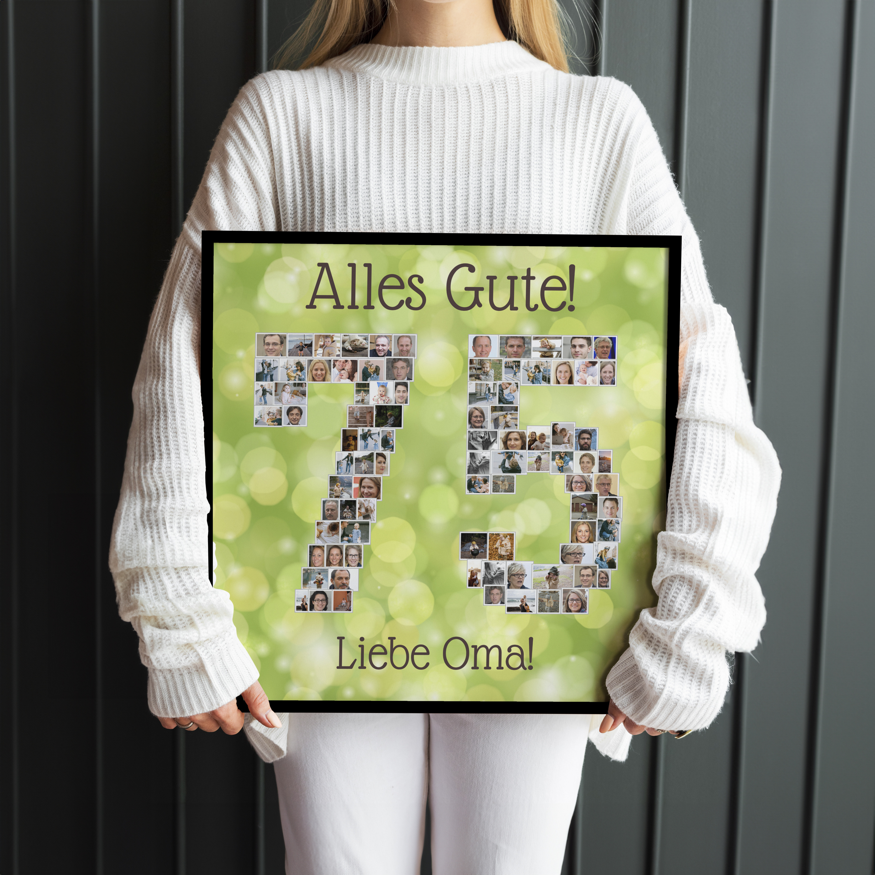Erstelle jetzt dein persönliches Geschenk. Beispiel: Eine individuelle Collage in der Zahl 75 für Oma, auf einem frischen, fetzigen Grün. Viele kleine Fotos formen die Jubiläumszahl, ergänzt durch den Spruch Alles Gute, liebe Oma. Perfekt als liebevolle Überraschung von der Familie und als Hingucker auf der Geburtstagsfeier.