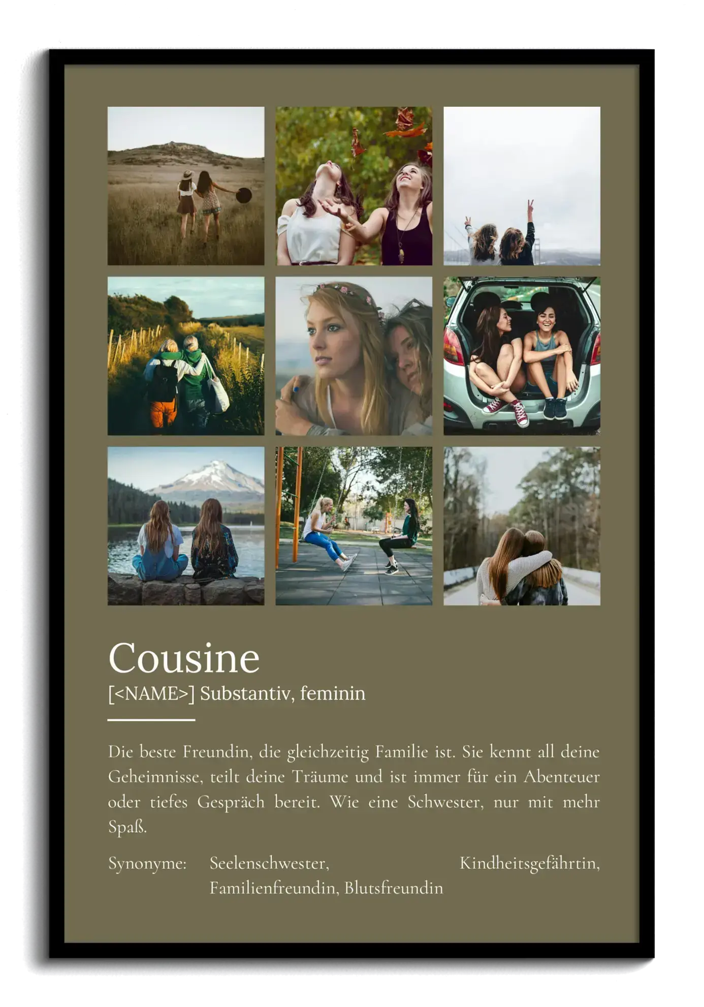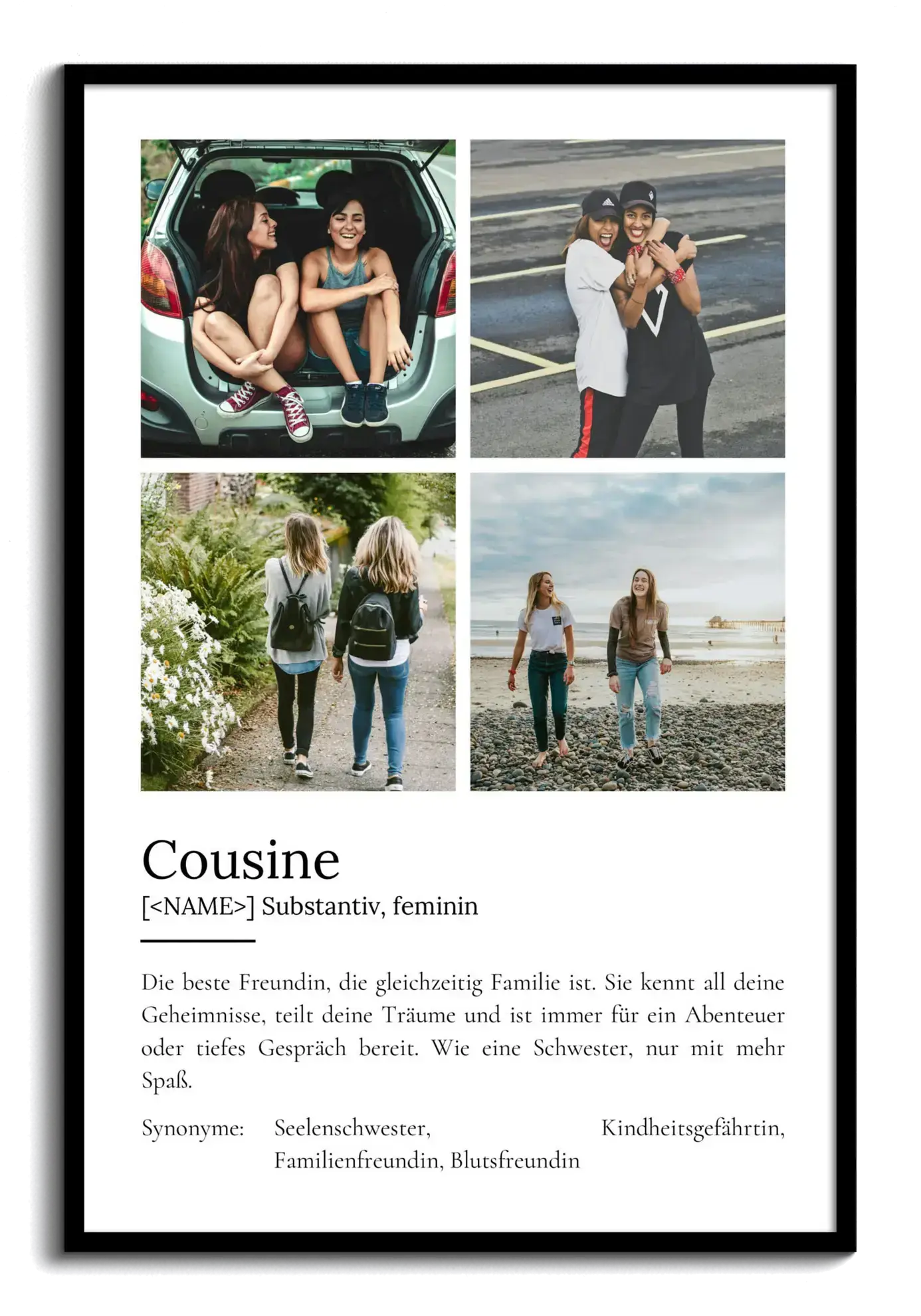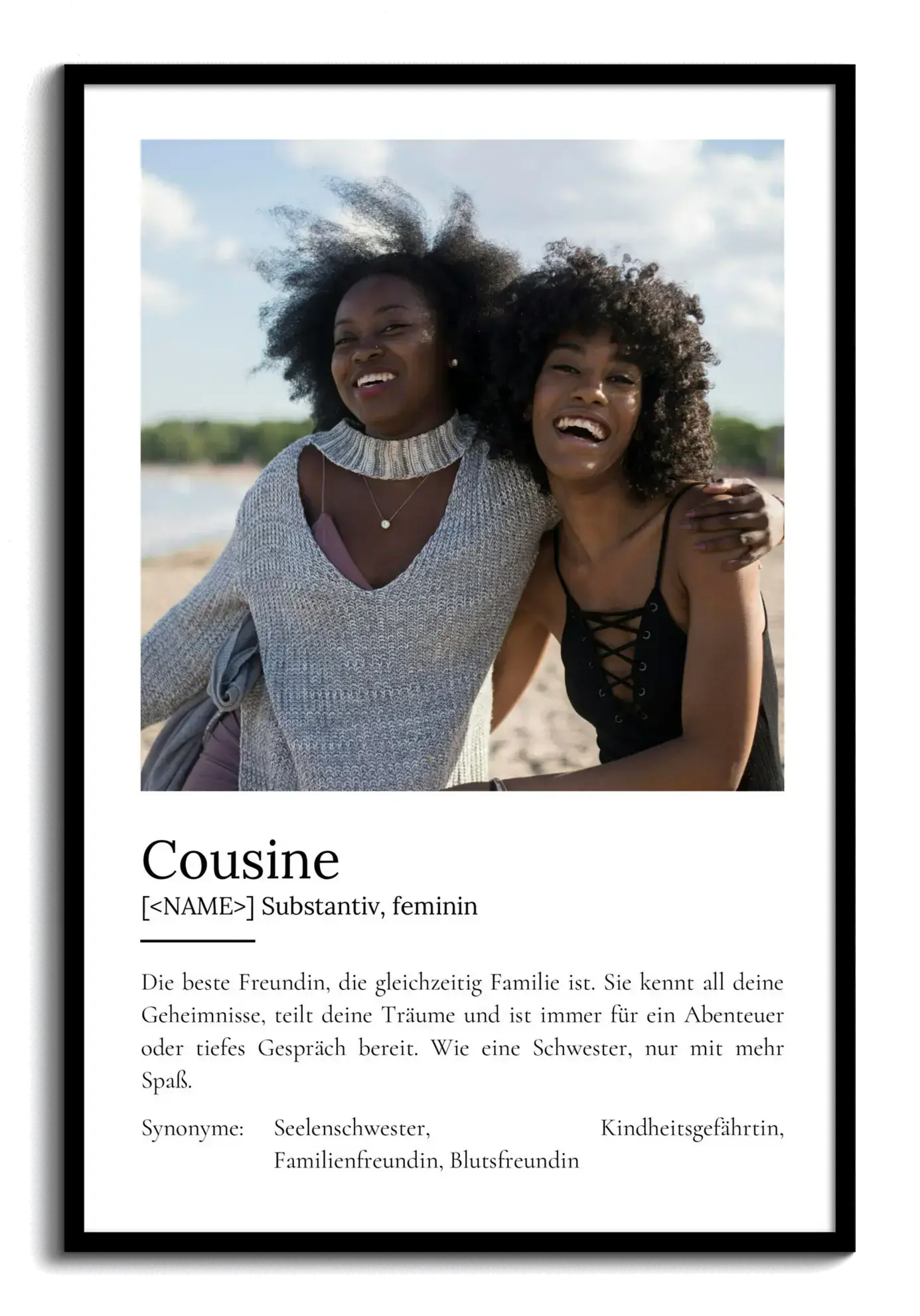 Mach dein Geschenk unvergesslich! Gestalte ein persönliches Definitionsposter für deine Cousine im klassischen Duden-Stil. Mit deinem eigenen Foto und einem charmanten Definitionstext wird es zum Highlight auf jeder Wand.