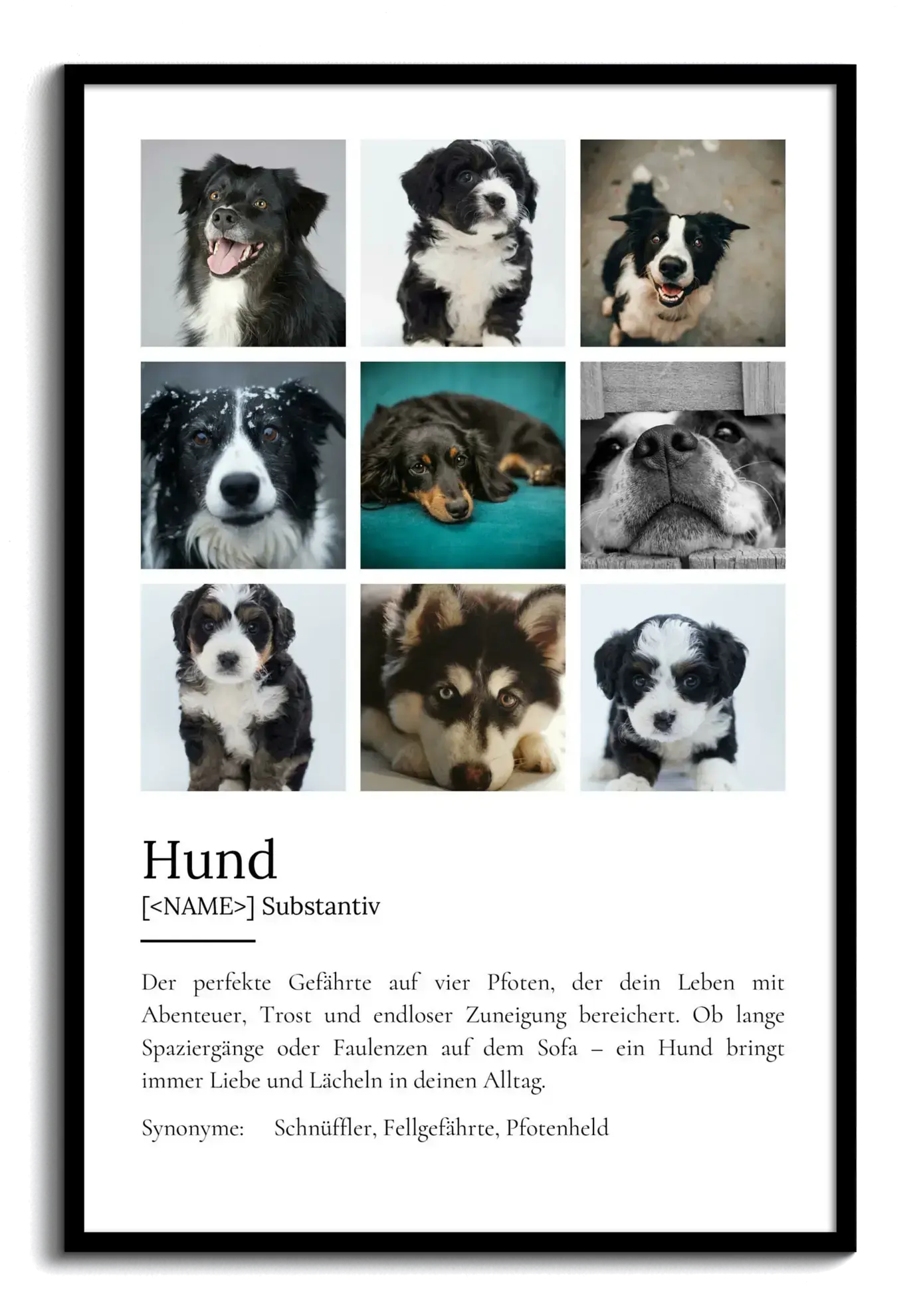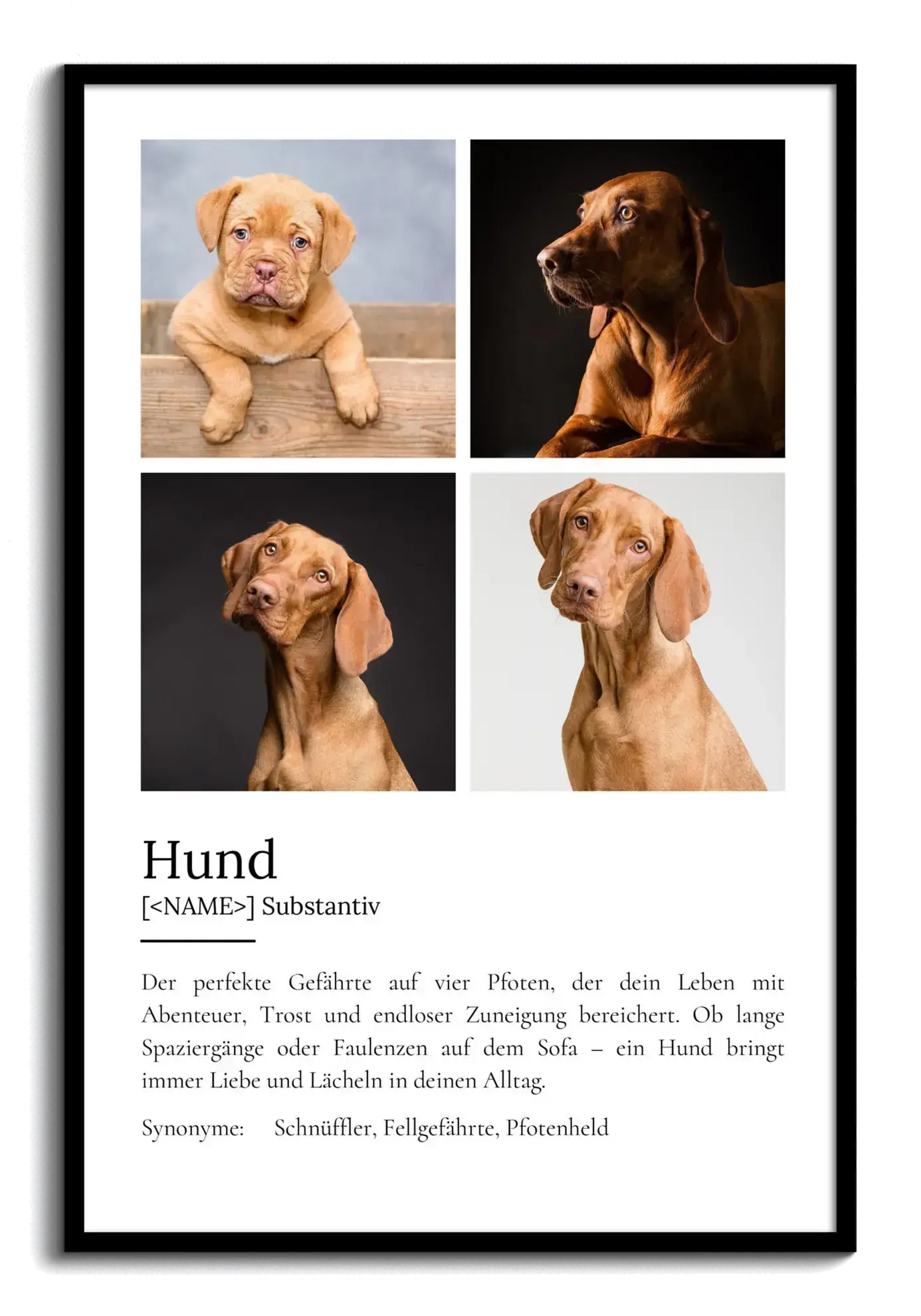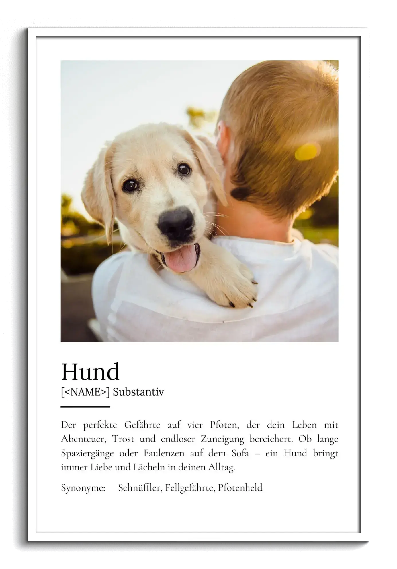 Gestalte Dein eigenes personalisiertes Definitionsposter im Duden-Stil für Hunde! Füge Dein Lieblingsfoto ein und passe den Definitionstext individuell an. So erhältst Du ein einzigartiges Unikat!