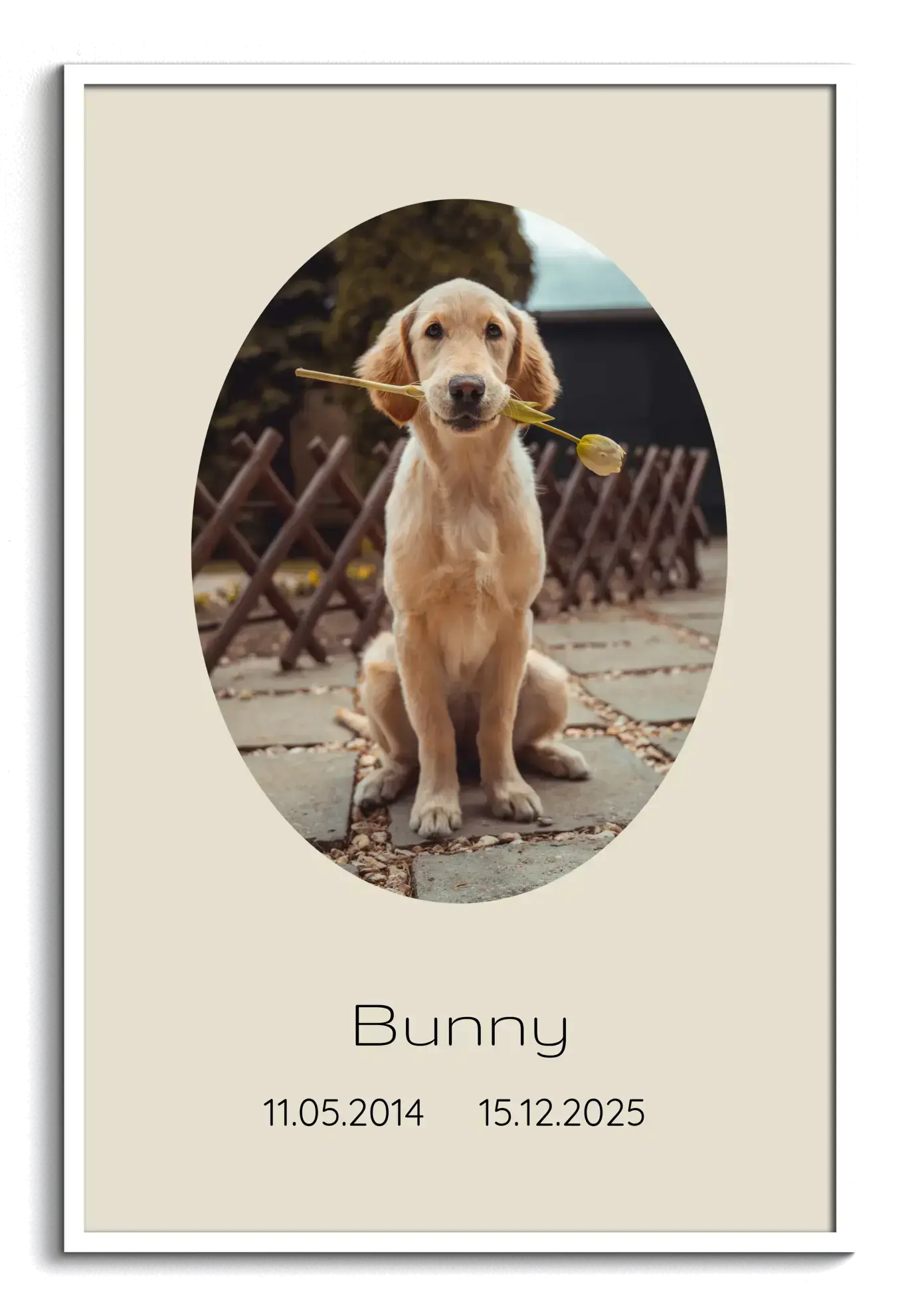 Gestalte jetzt ein würdiges Andenken: eine Einzelbild-Collage für dein verstorbenes Haustier (Hund). Die Trauer-Vorlage zeigt dein Foto im ovalen Rahmen auf dezentem Hintergrund; darunter stehen Name sowie Geburts- und Sterbedatum. Optional passt ein Spruch wie Für immer im Herzen.