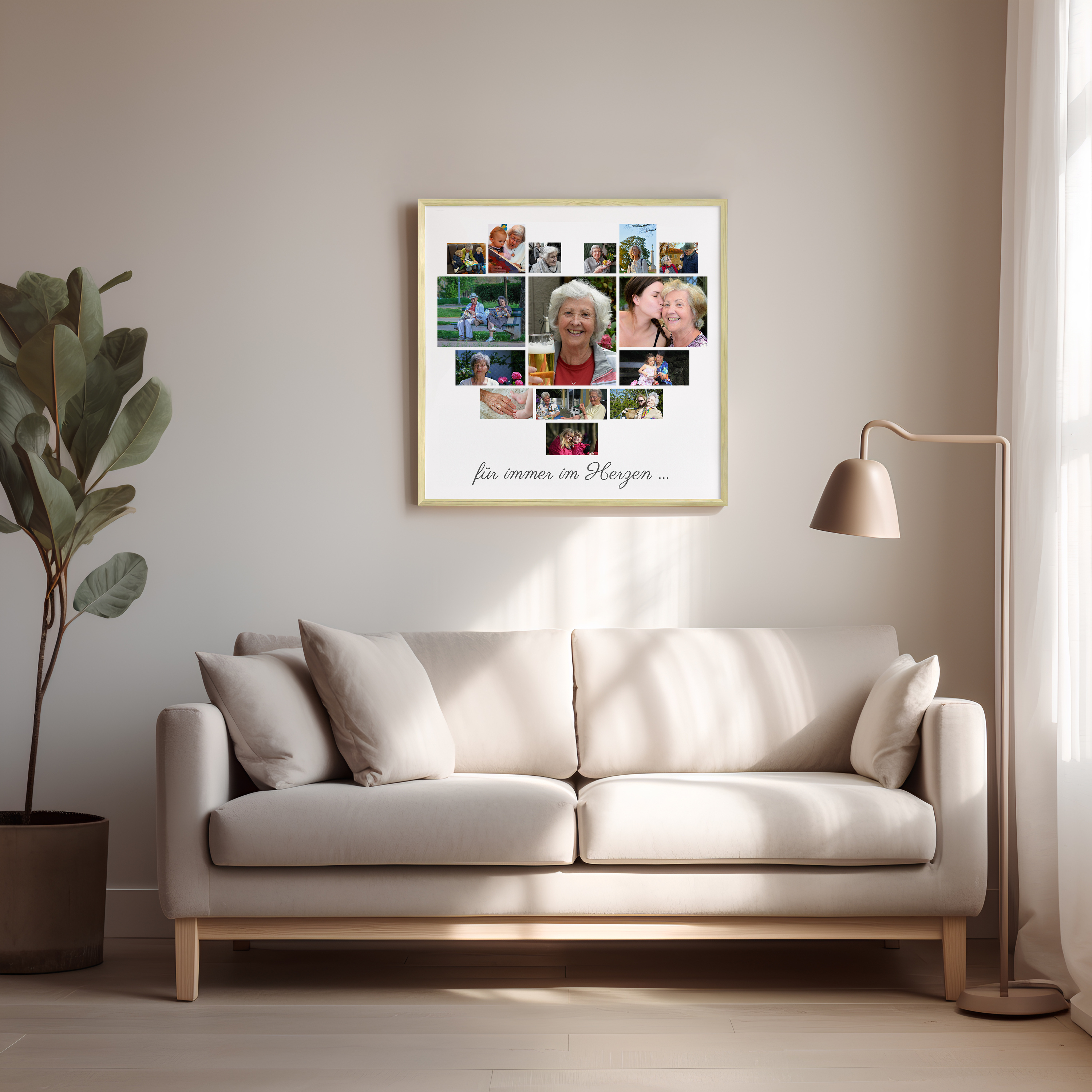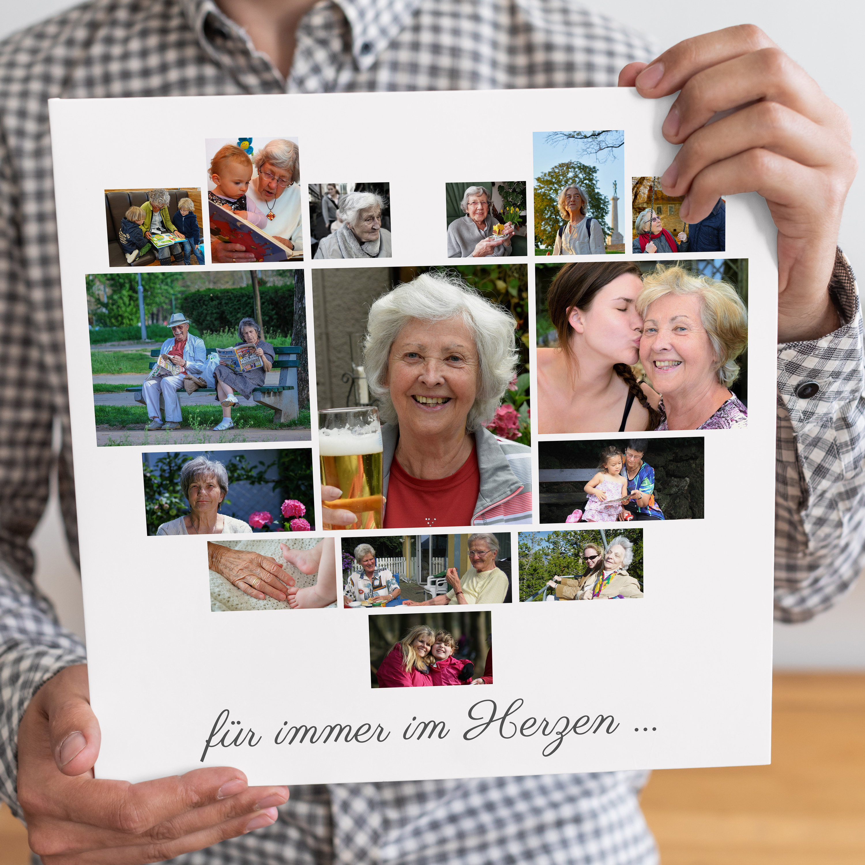 Gestalte jetzt deine persönliche Fotocollage, um Erinnerungen auf eine einzigartige Weise festzuhalten. Unser Beispiel zeigt eine Fotocollage in Herzform mit 15 Fotos und einem liebevollen Text: für immer im Herzen. Diese Collage ist ideal als Erinnerung für Trauerfälle und kann auf weissem Hintergrund individuell angepasst werden. Ob bei der Trauerfeier oder Zuhause aufgestellt, sie bietet einen würdevollen Rahmen für unvergessliche Momente.