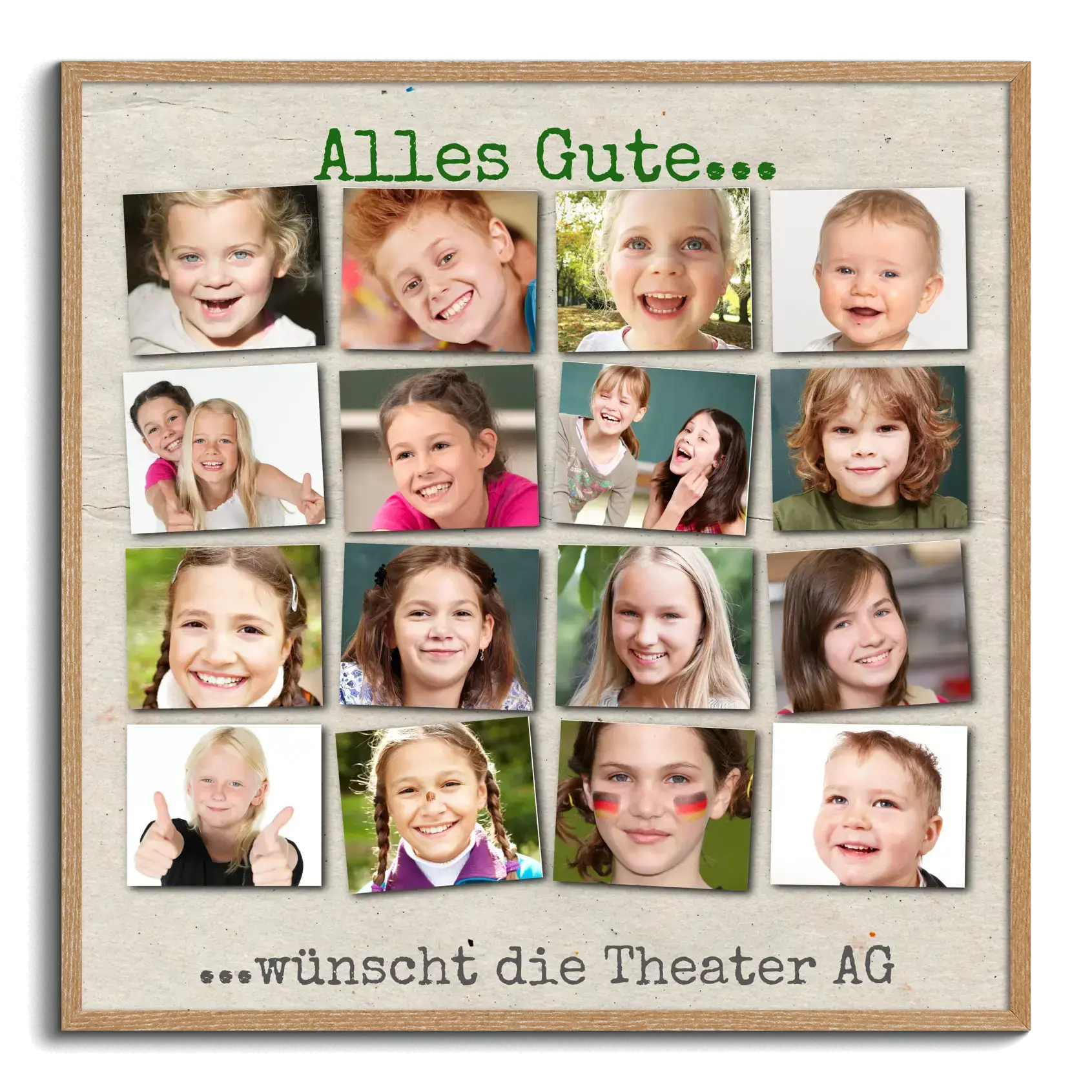 Erwecke deine schönsten Erinnerungen zum Leben und gestalte eine einzigartige Fotocollage deiner Wahl. Ob als persönliches Geschenk oder zur dekorativen Wandverschönerung – du entscheidest, wie deine Erinnerungen präsentiert werden. In unserem Beispiel siehst du eine Fotocollage für die Schule, perfekt als Geschenk oder Erinnerung: 16 Fotos der Kinder sind im Raster angeordnet, begleitet von einem herzlichen Spruch von der Theater-AG. Jede Komponente, sei es Foto, Farbe, Spruch oder Layout, ist individuell anpassbar, um das perfekte Andenken für Kinder, Eltern und Lehrkräfte zu schaffen.