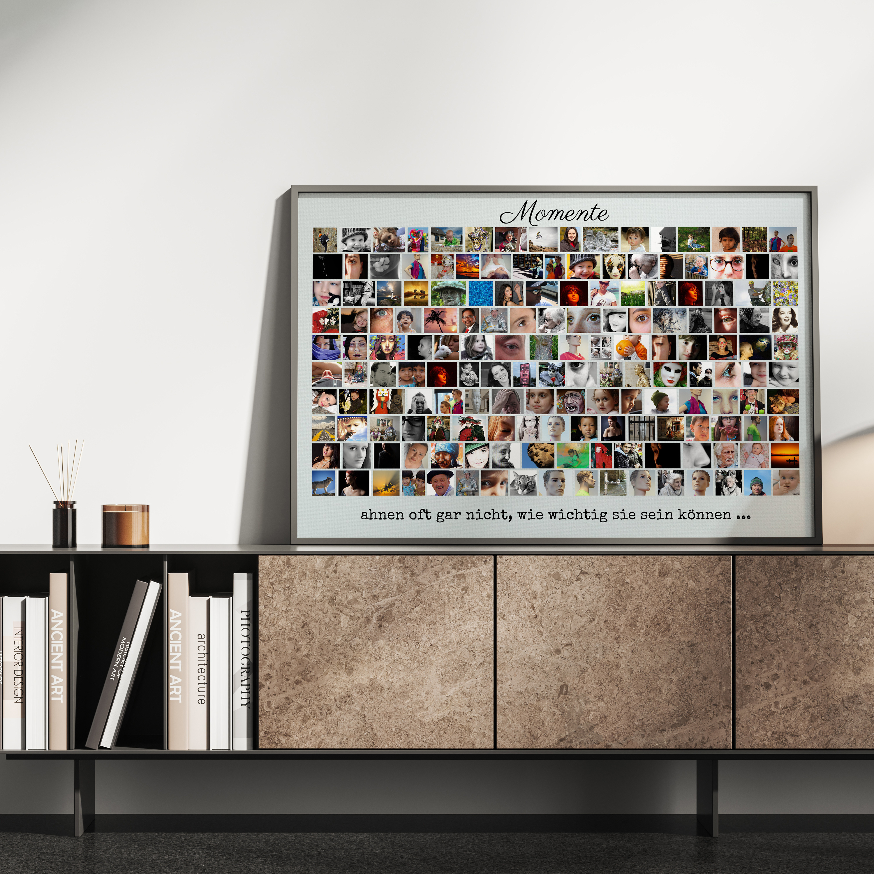 Unsere Fotocollage kann auf verschiedenen Premium-Materialien gedruckt werden. Entscheide dich für ein seidenmattes Poster, ein stilvolles gerahmtes Bild in deinem Wunschrahmen, eine klassische Leinwand mit stabiler Holzrahmung, ein hochwertiges Acrylglasbild oder ein langlebiges Alu-Dibond-Produkt. Alternativ steht dir auch ein Download der hochauflösenden Druckdatei zur Verfügung.