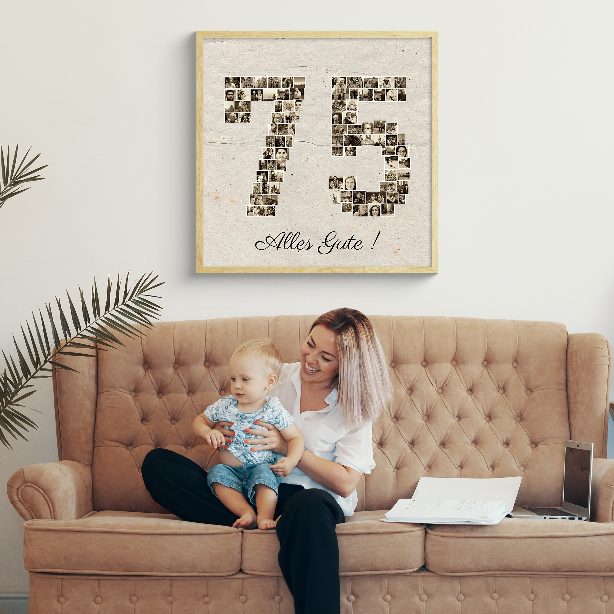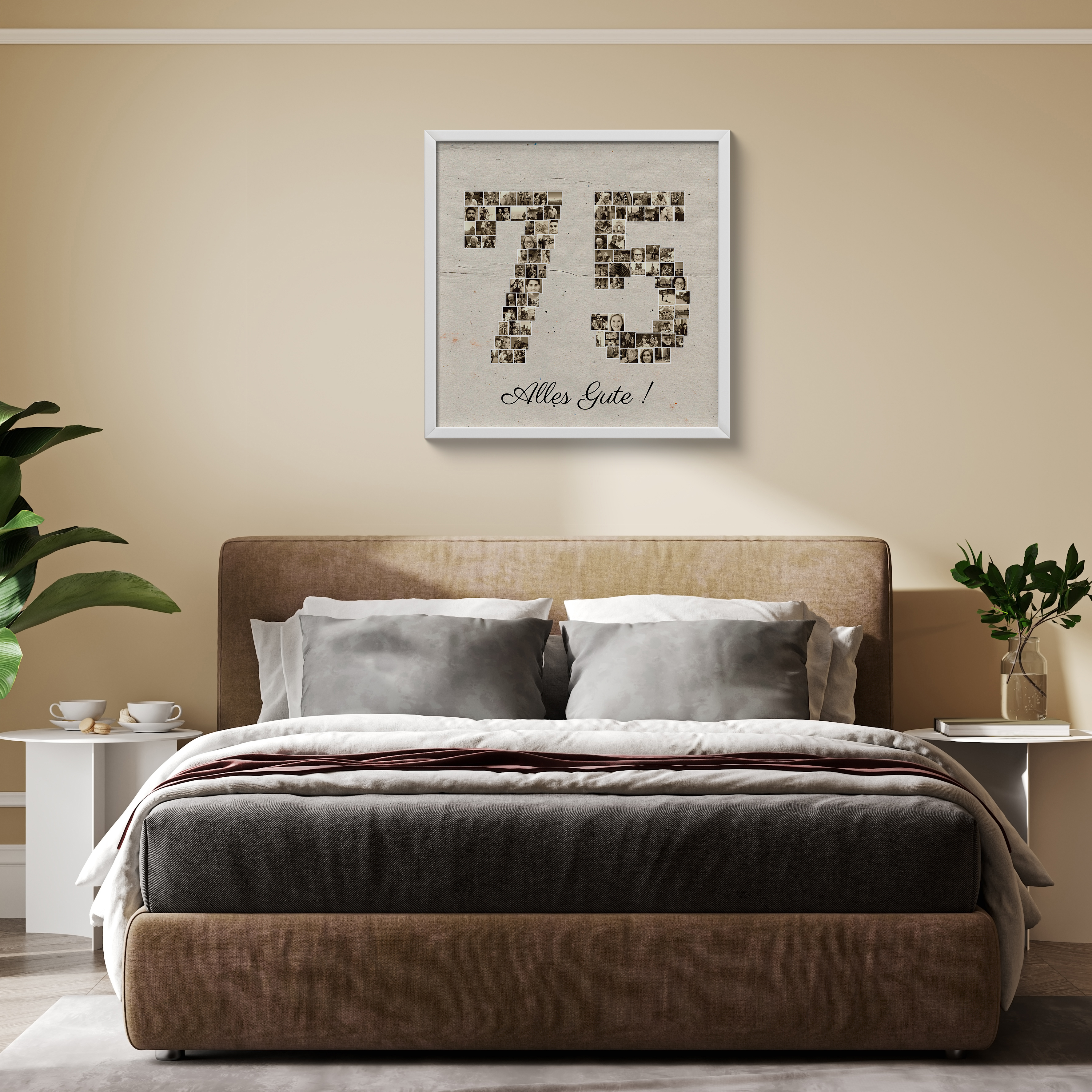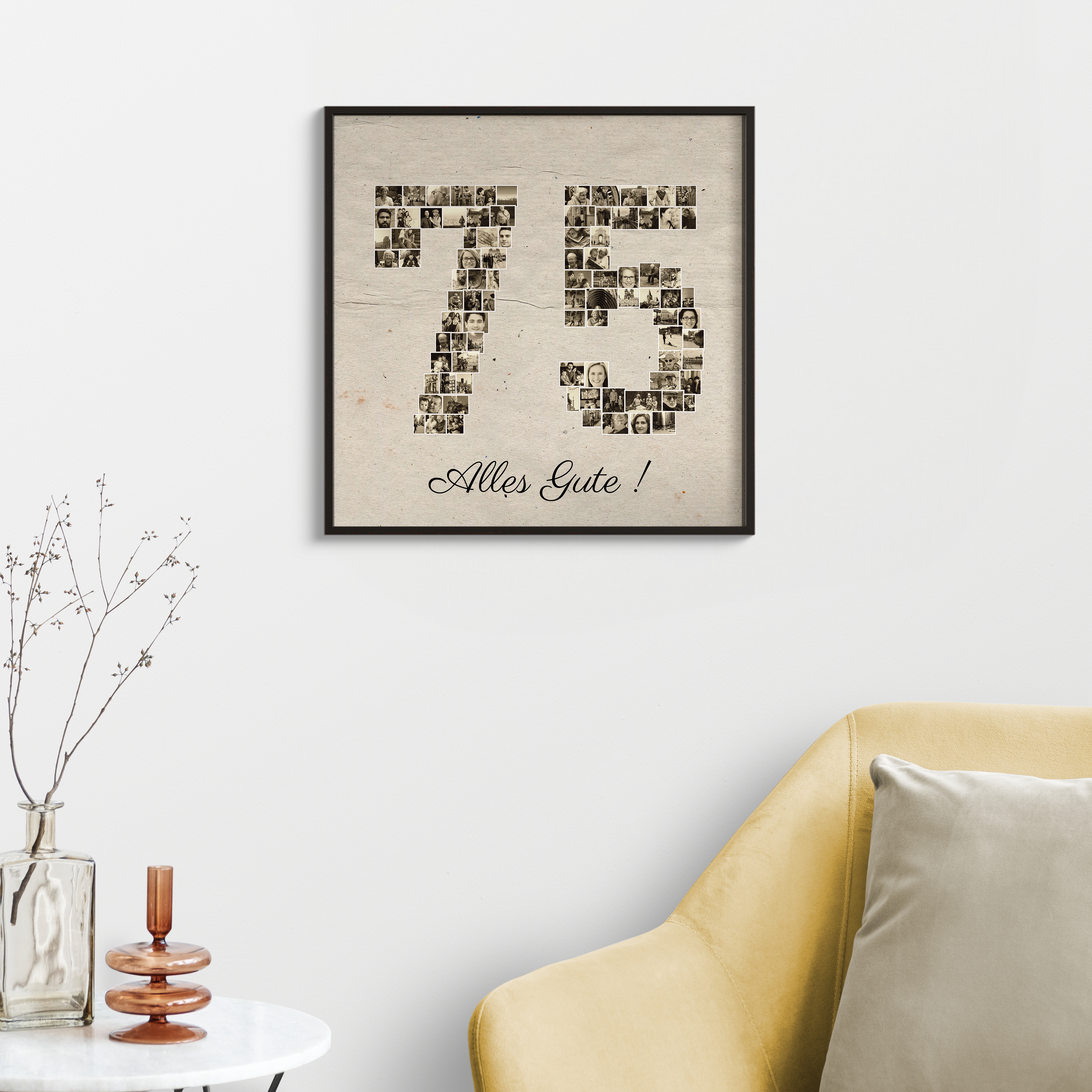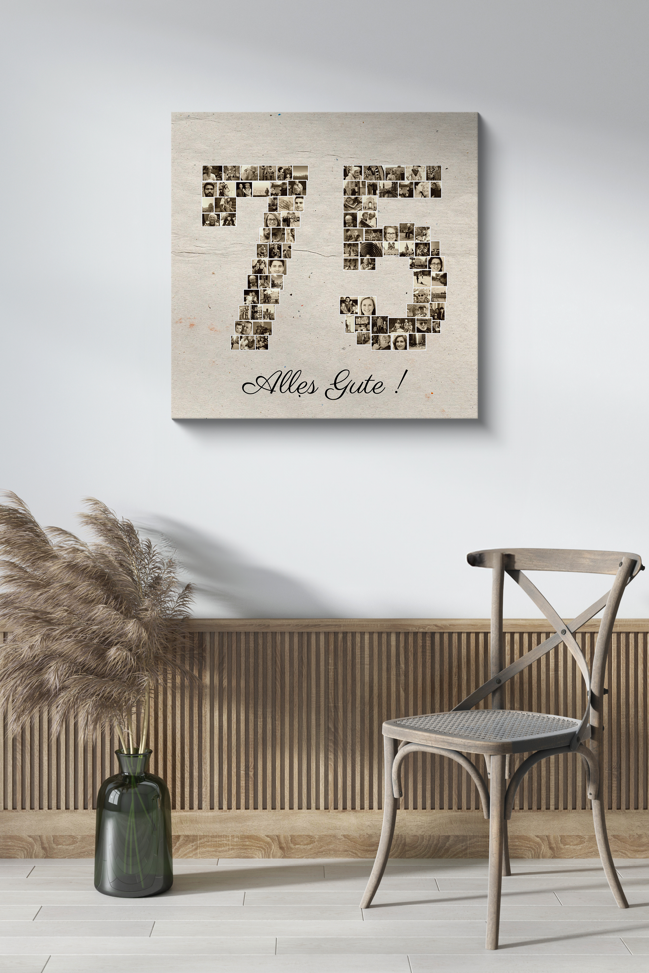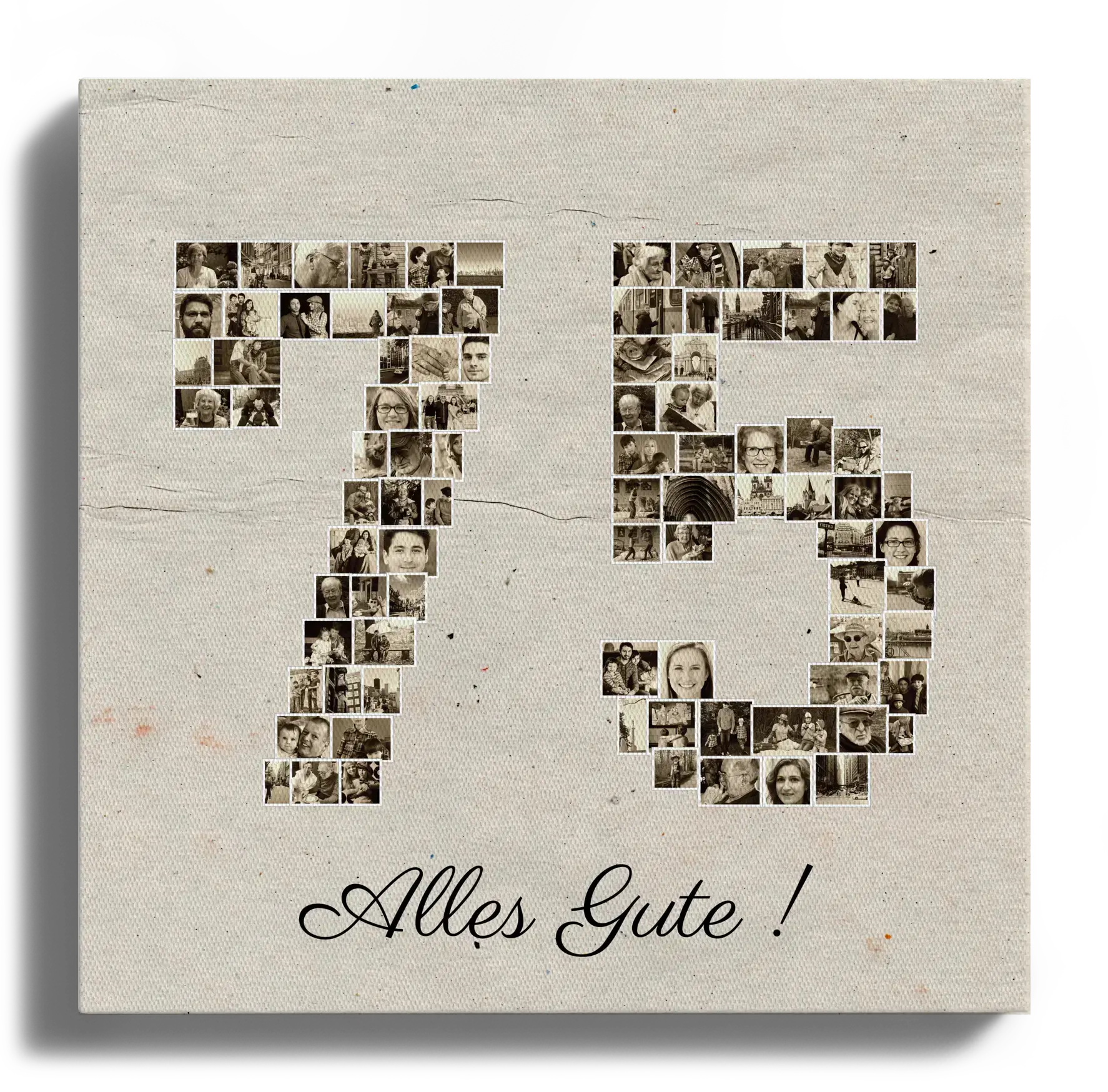 Gestalte deine ganz persönliche Fotocollage in Form der Zahl „75“! Unvergessliche Momente in einem einzigartigen Format. Dieses example zeigt, wie du dein eigenes, bedeutungsvolles Fotogeschenk kreieren kannst, perfekt für einen besonderen Anlass wie einen runden Geburtstag.