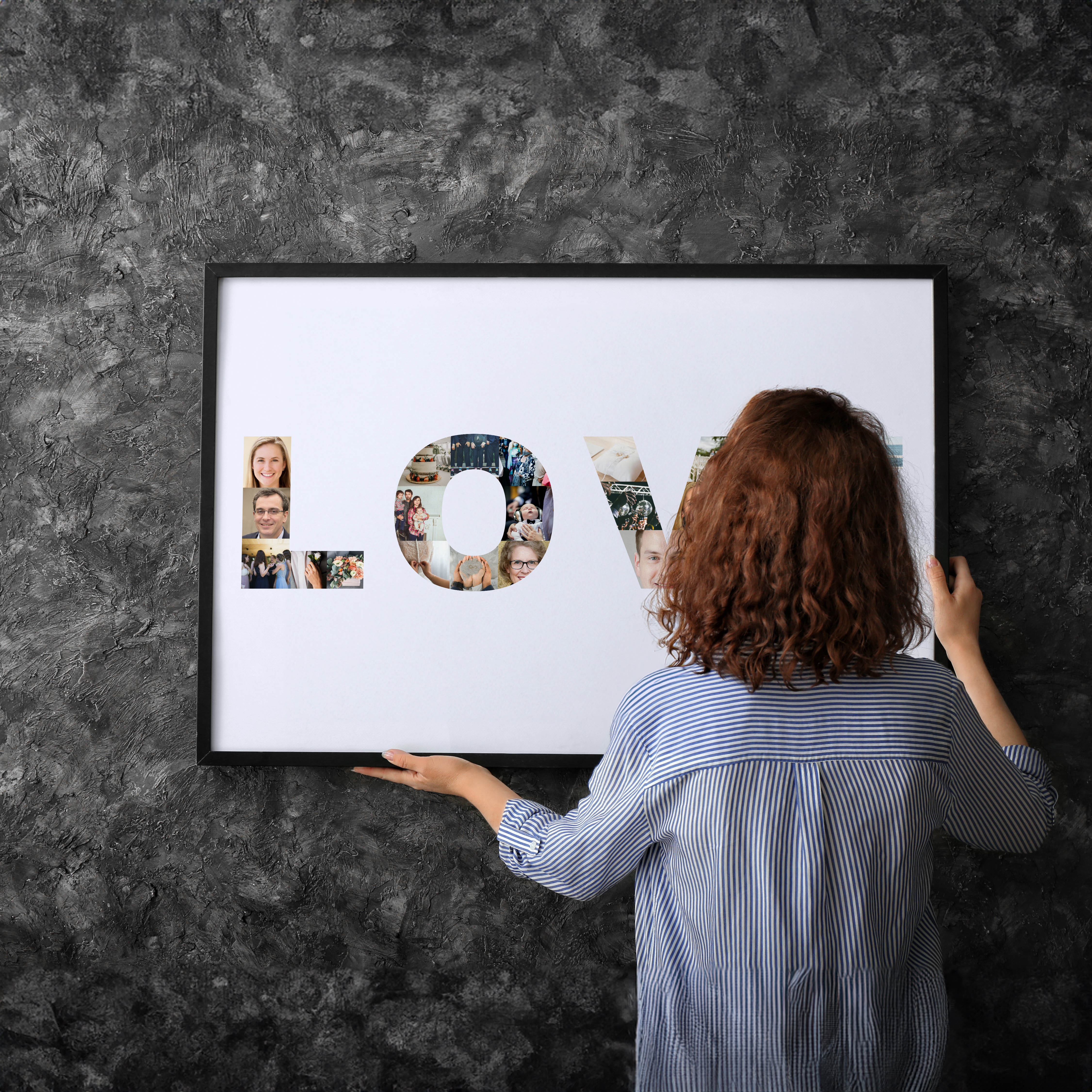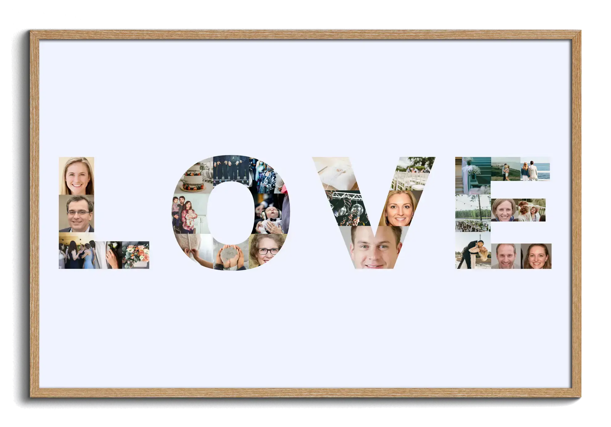 Unsere personalisierten Collagen sind nicht nur eine wundervolle Möglichkeit, um Deine eigenen besonderen Momente zu verewigen, sie sind auch das perfekte Geschenk für verschiedenste Anlässe. Ob Hochzeiten, Jahrestage, Geburtstage oder einfach nur, weil du jemandem eine Freude machen möchtest - mit unseren individuell gestaltbaren Collagen kannst Du immer ein einzigartiges und persönliches Geschenk überreichen. Gestalte jetzt Deine "LOVE" Collage und teile Deine Liebe mit der Welt.