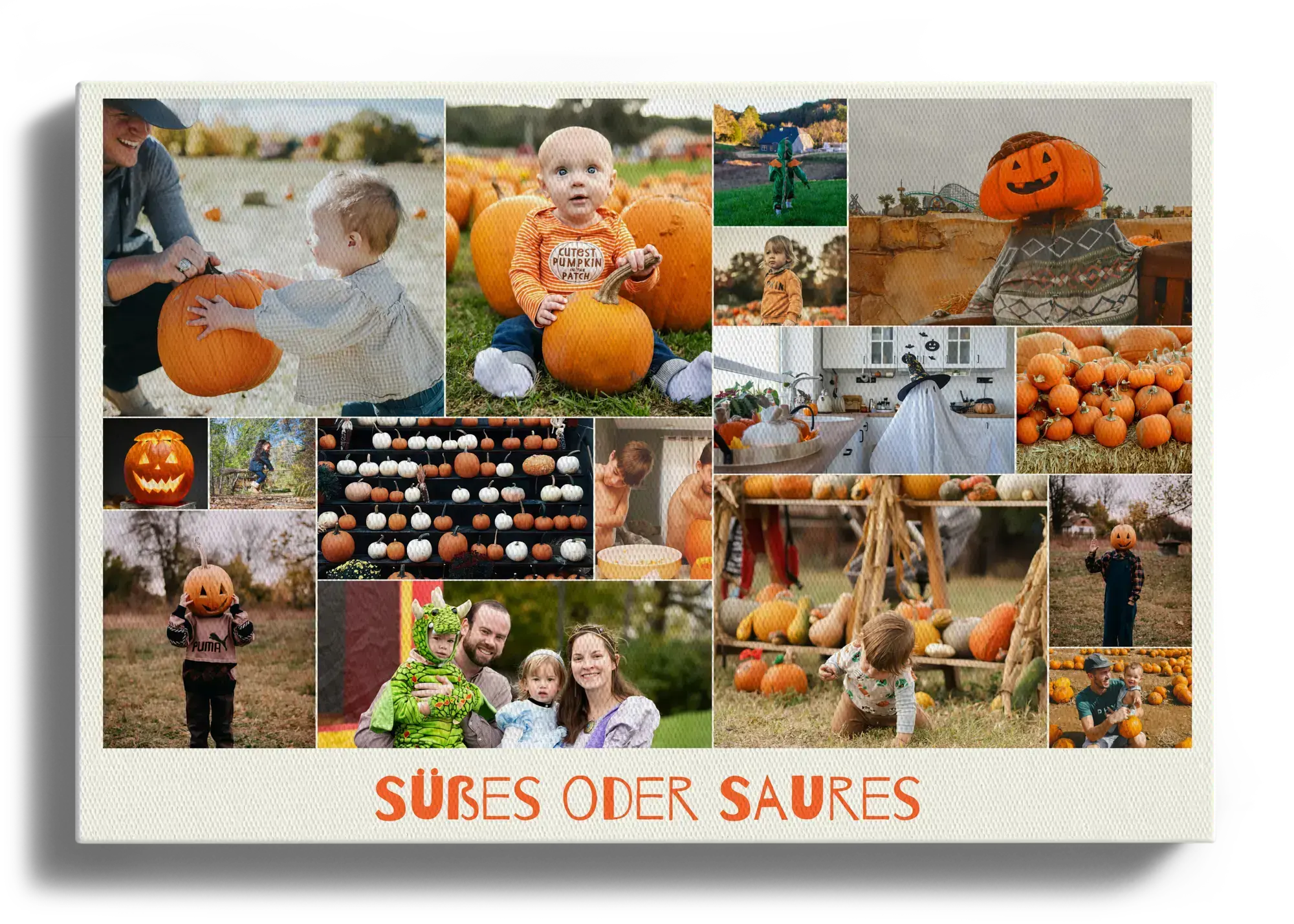 Gestalte deine persönliche Halloween-Fotocollage mit nur wenigen Klicks! Sammle zauberhafte Momente deiner Familie und Freunde, die in schaurigen Kostümen für unvergessliche Erinnerungen sorgen. Verleihe deiner Collage eine persönliche Note mit witzigen oder gruseligen Texten, wie zum Beispiel Süsses oder Saures. Deine Collage wird zum Blickfang in jedem Raum und sorgt garantiert für gute Laune.