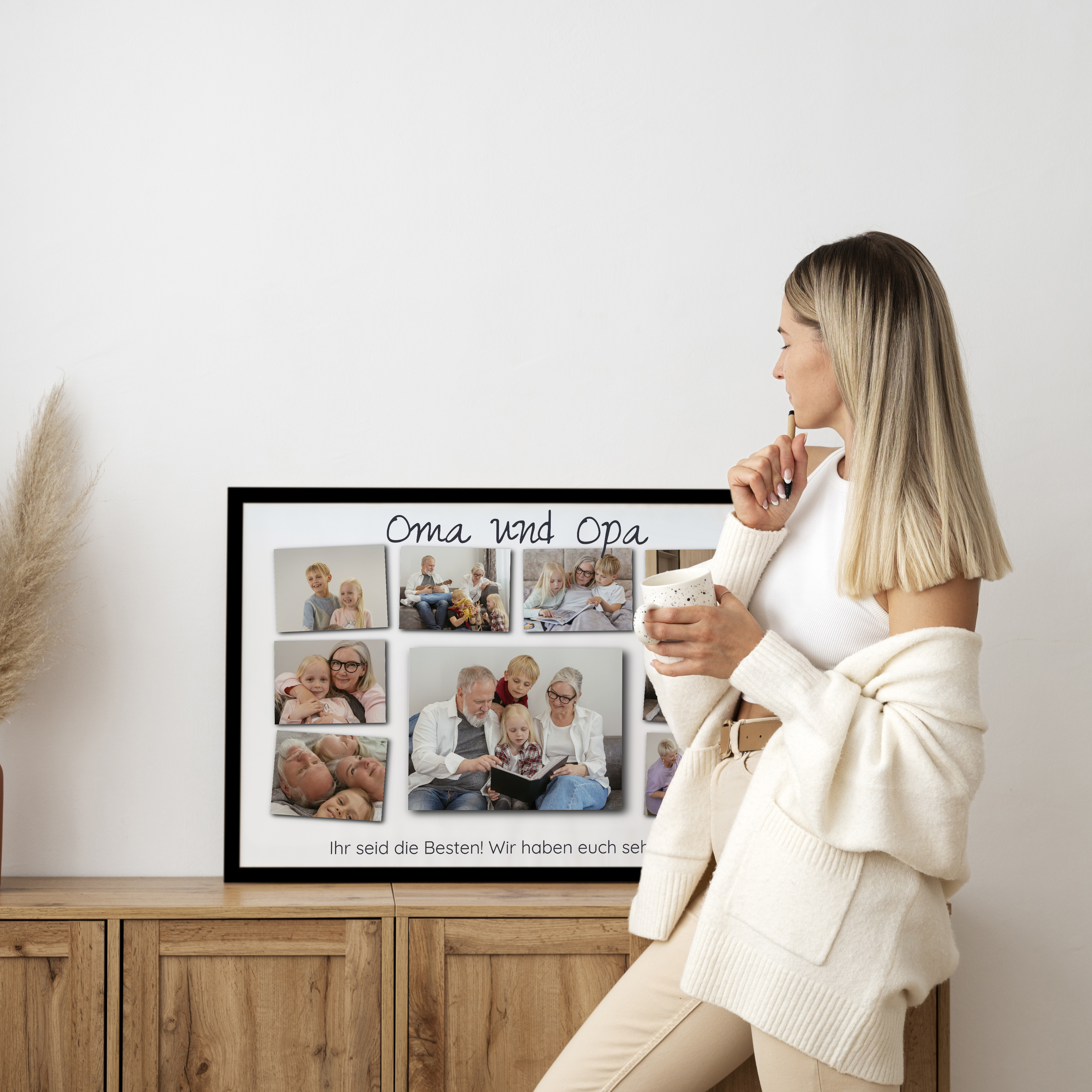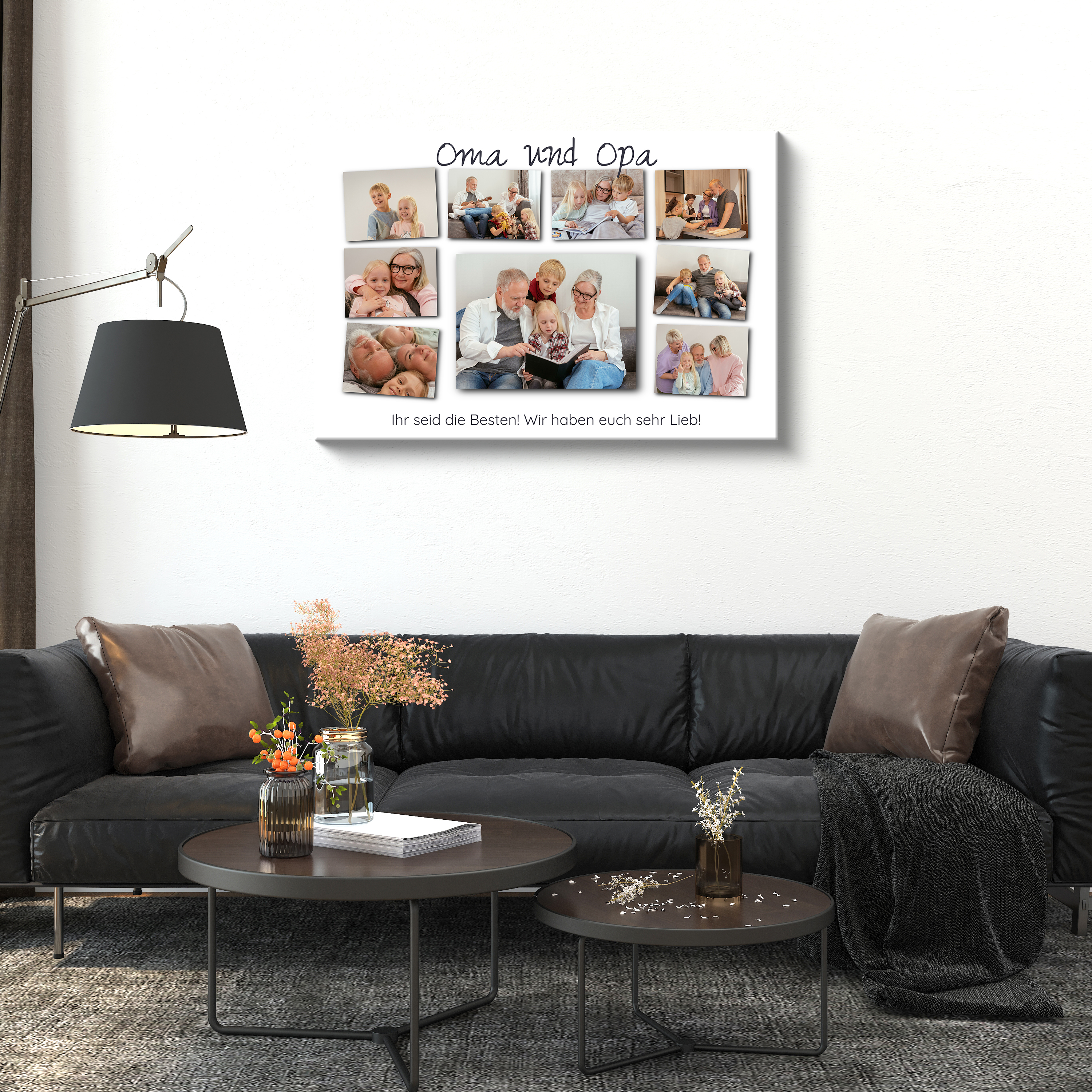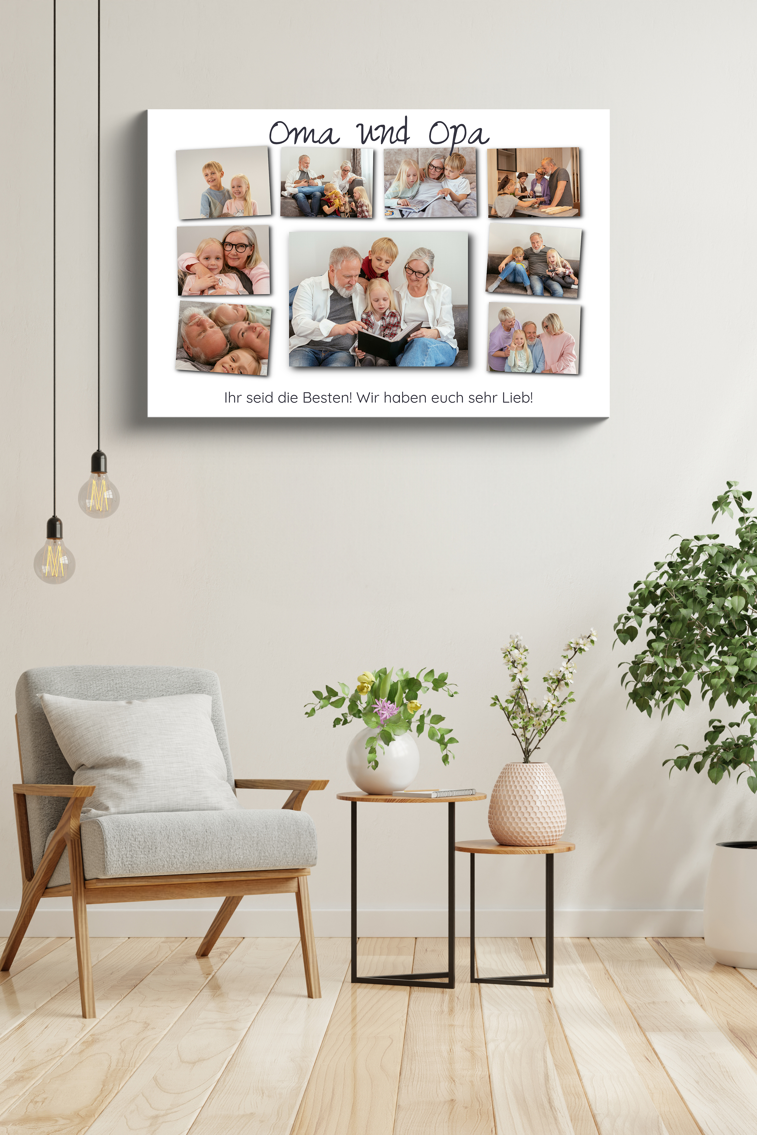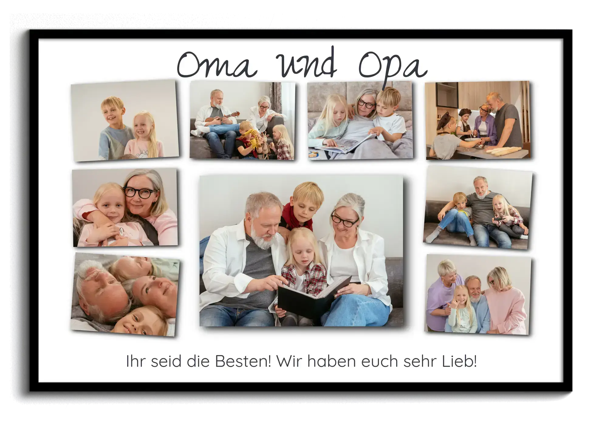 Erstelle jetzt deine persönliche Fotocollage und verschenke Erinnerungen. Beispiel: ein Geschenk für Oma und Opa mit 9 Fotos von Grosseltern und Enkeln, mittig ein grösseres Bild, dazu der Spruch Oma und Opa. Ihr seid die Besten! Wir haben euch sehr lieb! Perfekt für Geburtstag, Jubiläum oder Feiertage.