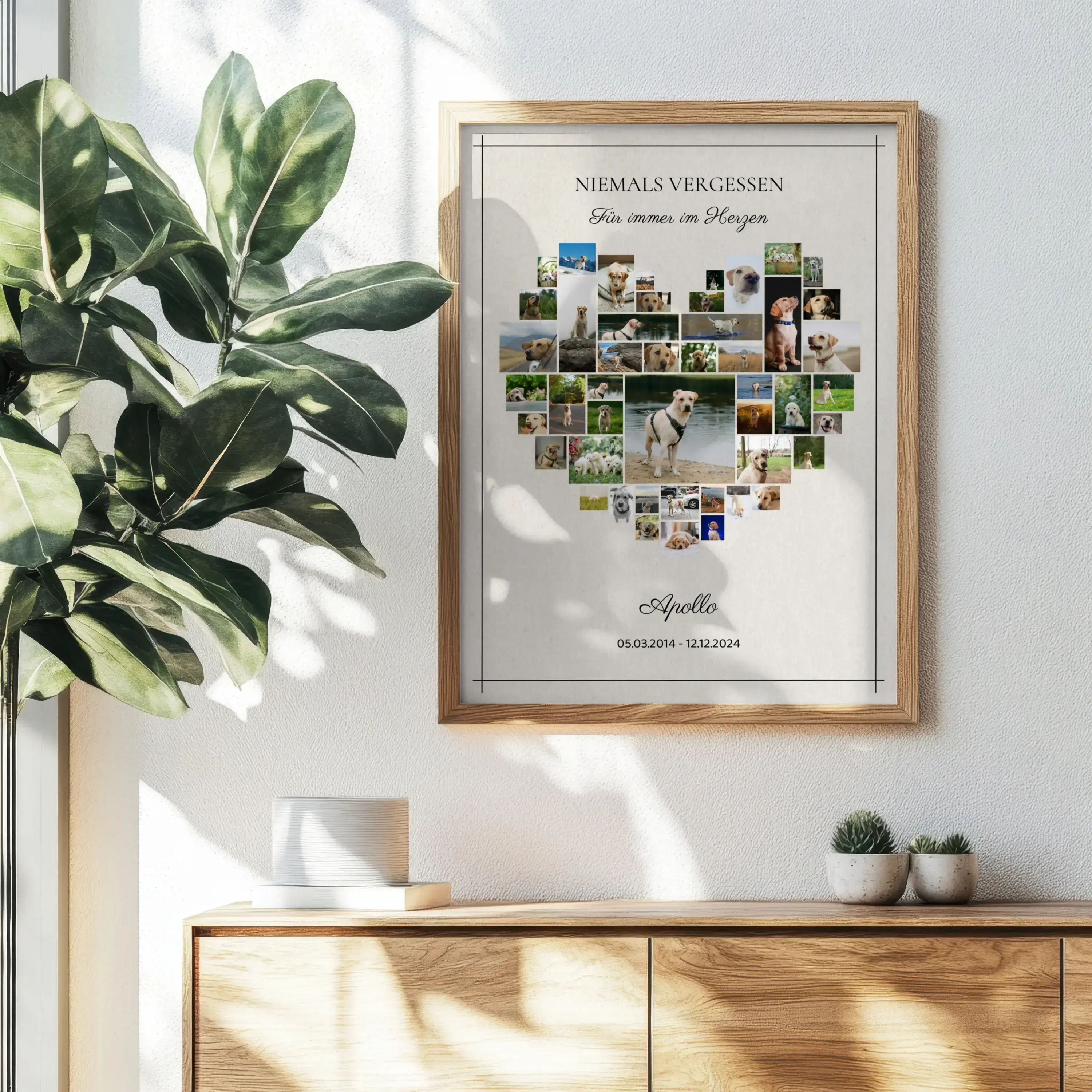 Fotocollage in Hunde-Silhouette zum Gedenken – mit Fotos, Name, Jahren und optionalem Text.