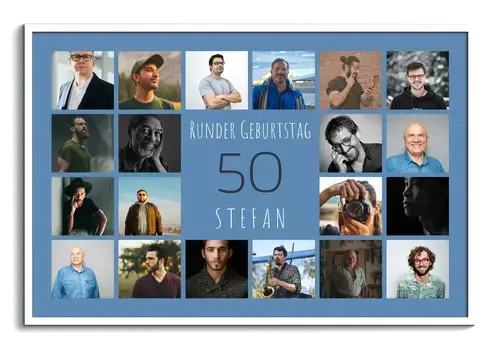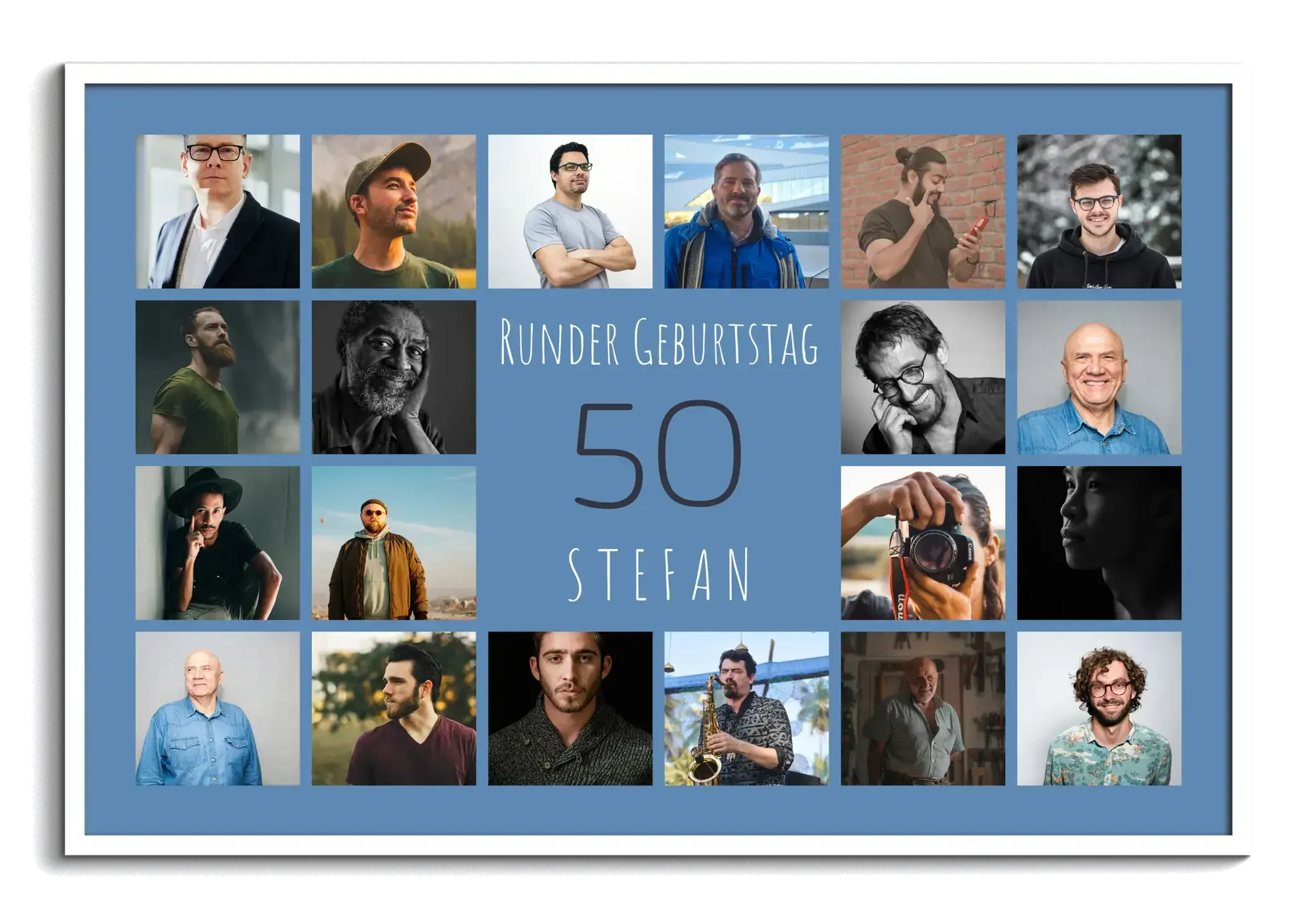 Gestalte jetzt deine Jubiläums-Zahl Collage 50. Im Mittelpunkt steht eine grosse 50, oben platzierst du den Namen, unten einen kurzen Gruss. 20–80 deiner Fotos rahmen die Zahl in einem klaren Raster ein. Zahl, Name, Farben, Hintergrund sowie Hoch- oder Querformat lassen sich frei anpassen.