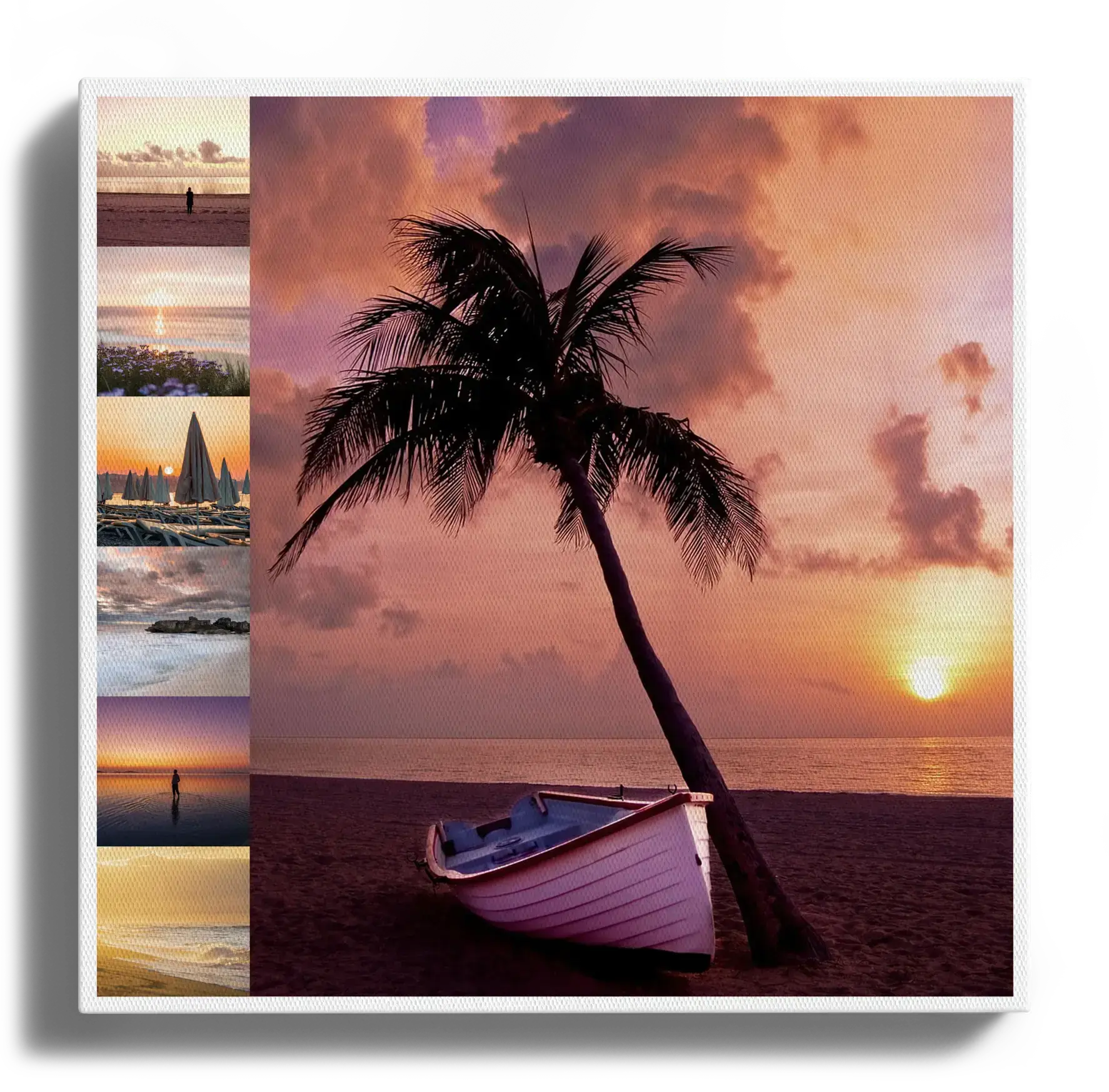 Strände mit Sonnenuntergang, Palmen und Booten; Seen mit Bergspiegelung als Collage im Premiumdruck