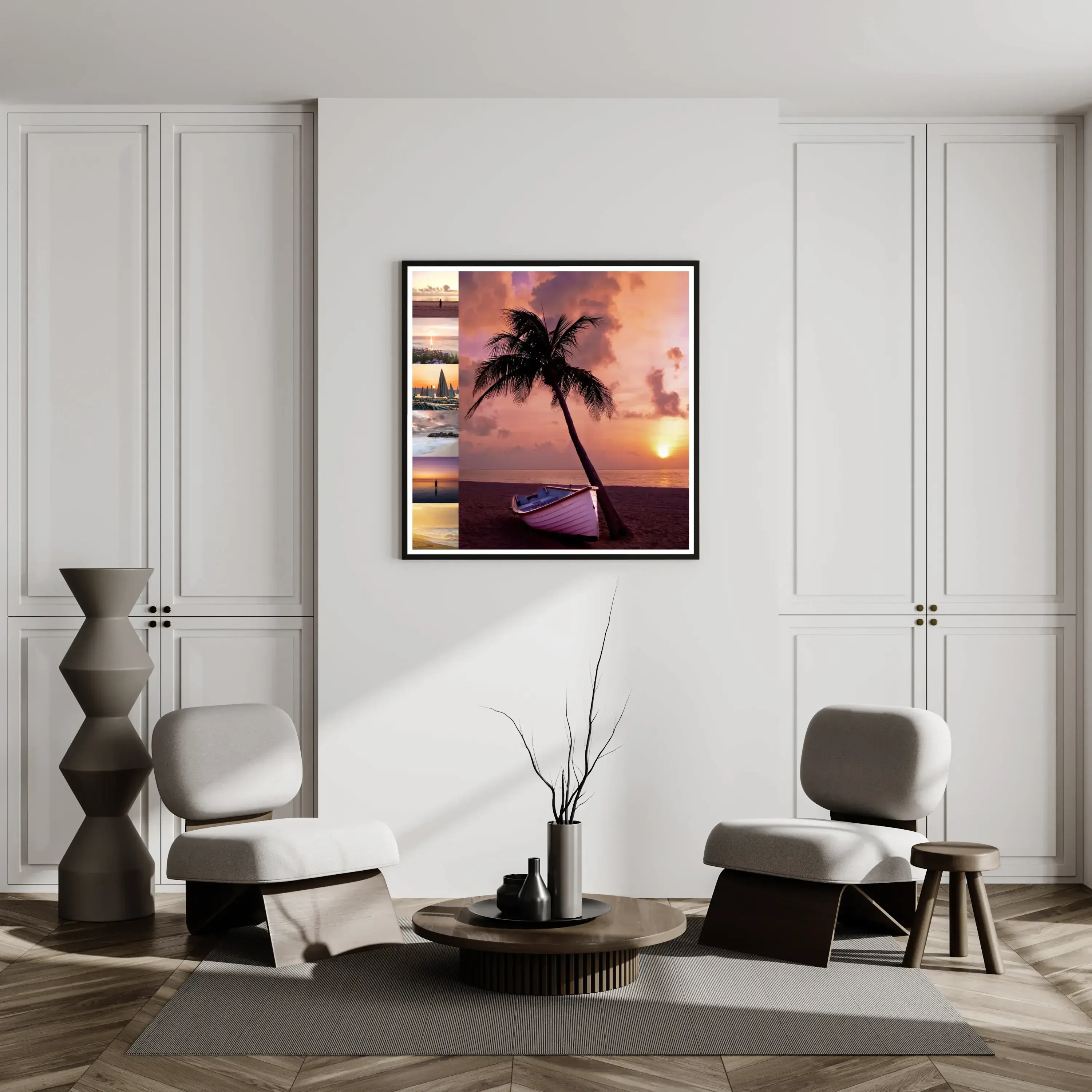 Strände mit Sonnenuntergang, Palmen und Booten; Seen mit Bergspiegelung als Collage im Premiumdruck