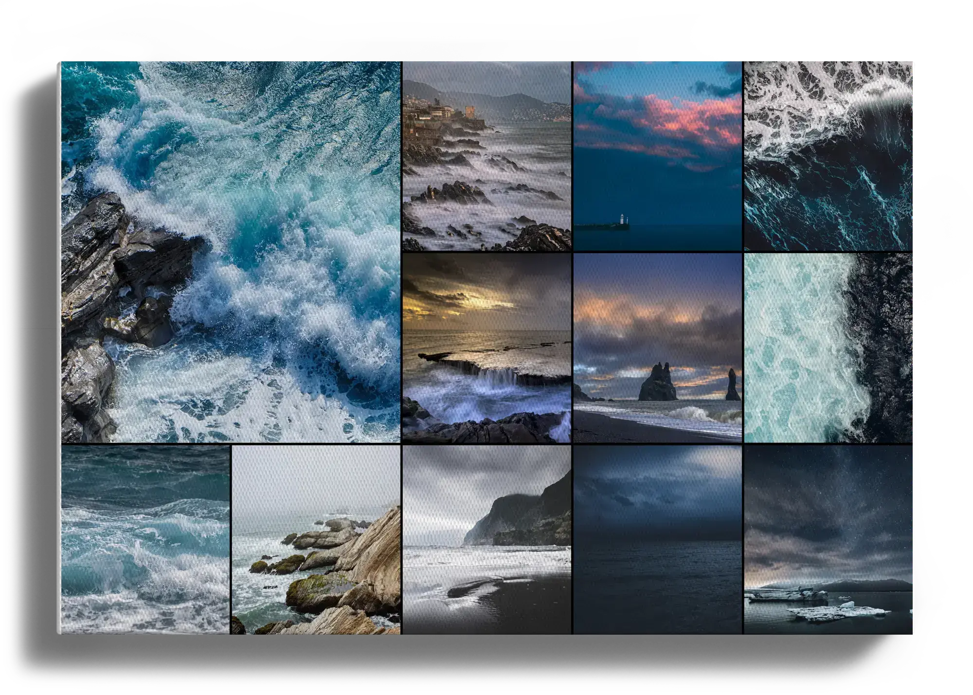 Nebel, Küste, Wälder, Berge und Gewitter: Wettermotive als Collage im Premiumdruck.