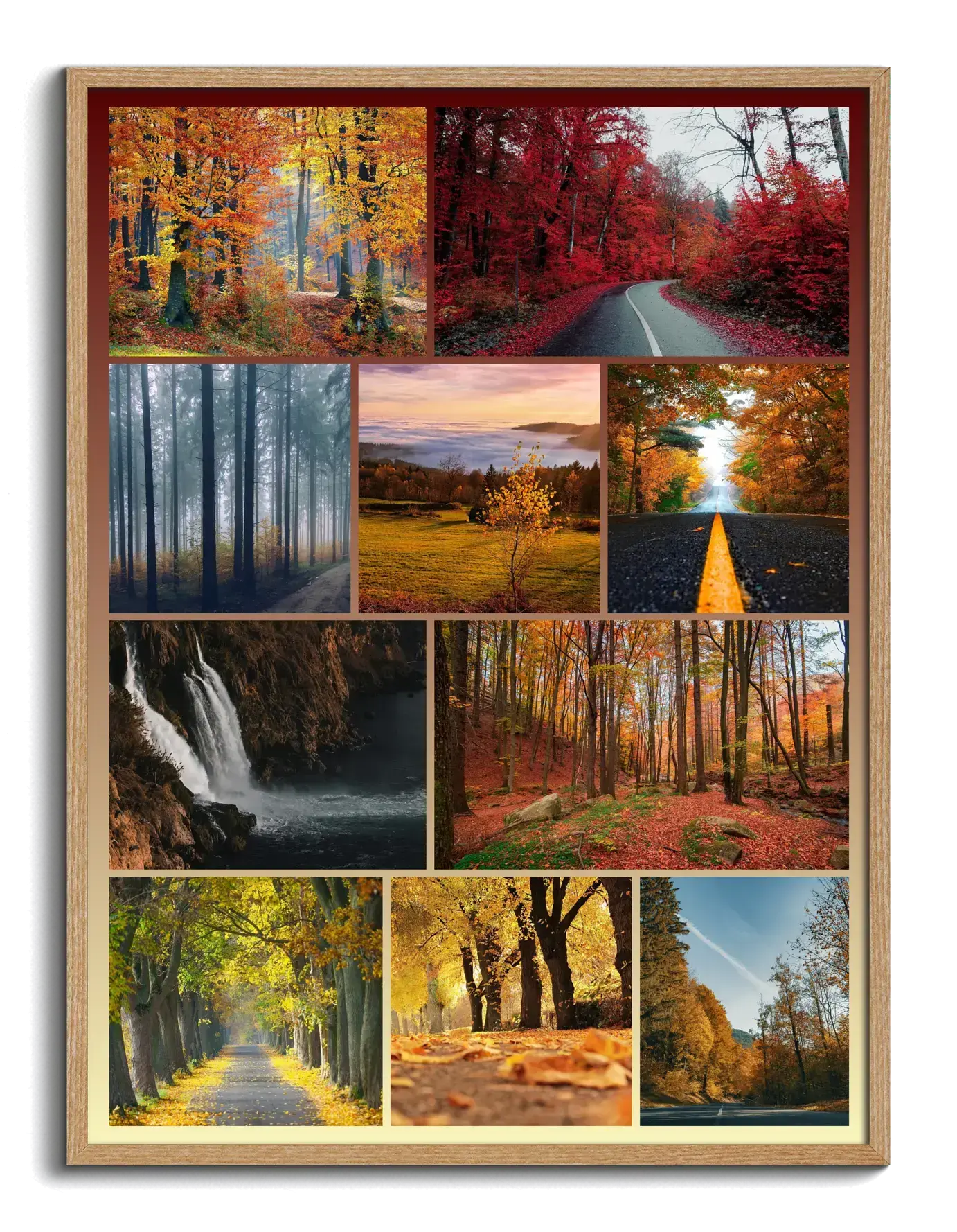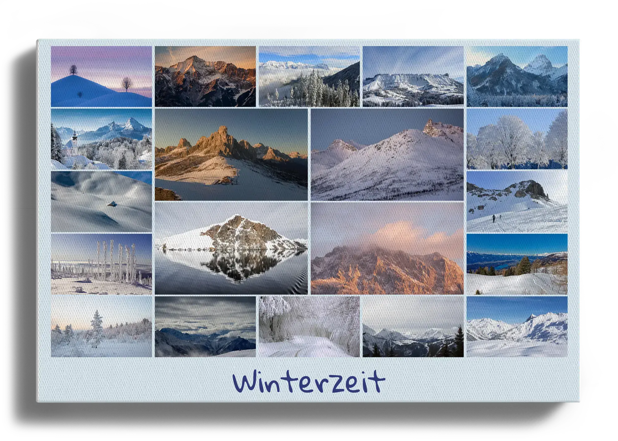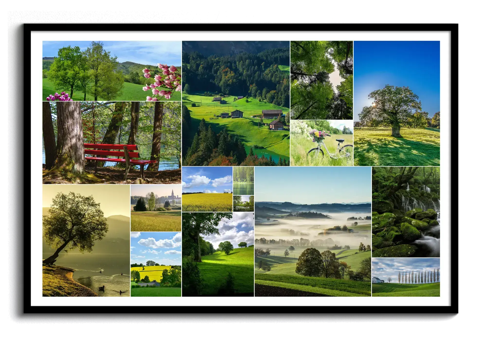 Starte jetzt und gestalte deine persönliche Landschafts-Collage: sammle Wälder in Sommer, Frühling, Herbst und Winter, goldene Herbststrassen, blühende Sommerwiesen, Berge mit schneebedeckten Gipfeln und stimmungsvolle Winterzeit in einem Premiumdruck. In wenigen Minuten entsteht dein Natur-Highlight für die Wand.