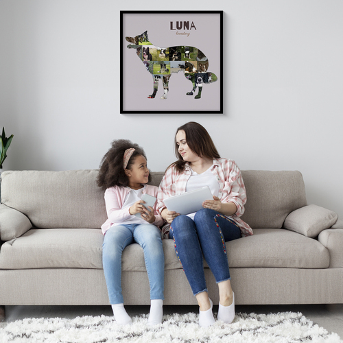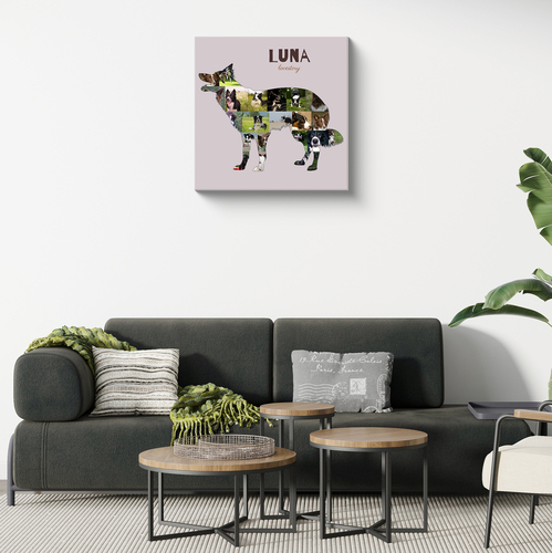 Verwandle Erinnerungen mit deinem treuen Vierbeiner in ein einzigartiges Kunstwerk. Mit unserer Fotocollage kannst du die einzigartige Silhouette eines Border Collies mit ungefähr 20 deiner liebsten Fotos ausfüllen. Füge deinen eigenen Text hinzu und mache es zu einem ganz persönlichen Kunstwerk.