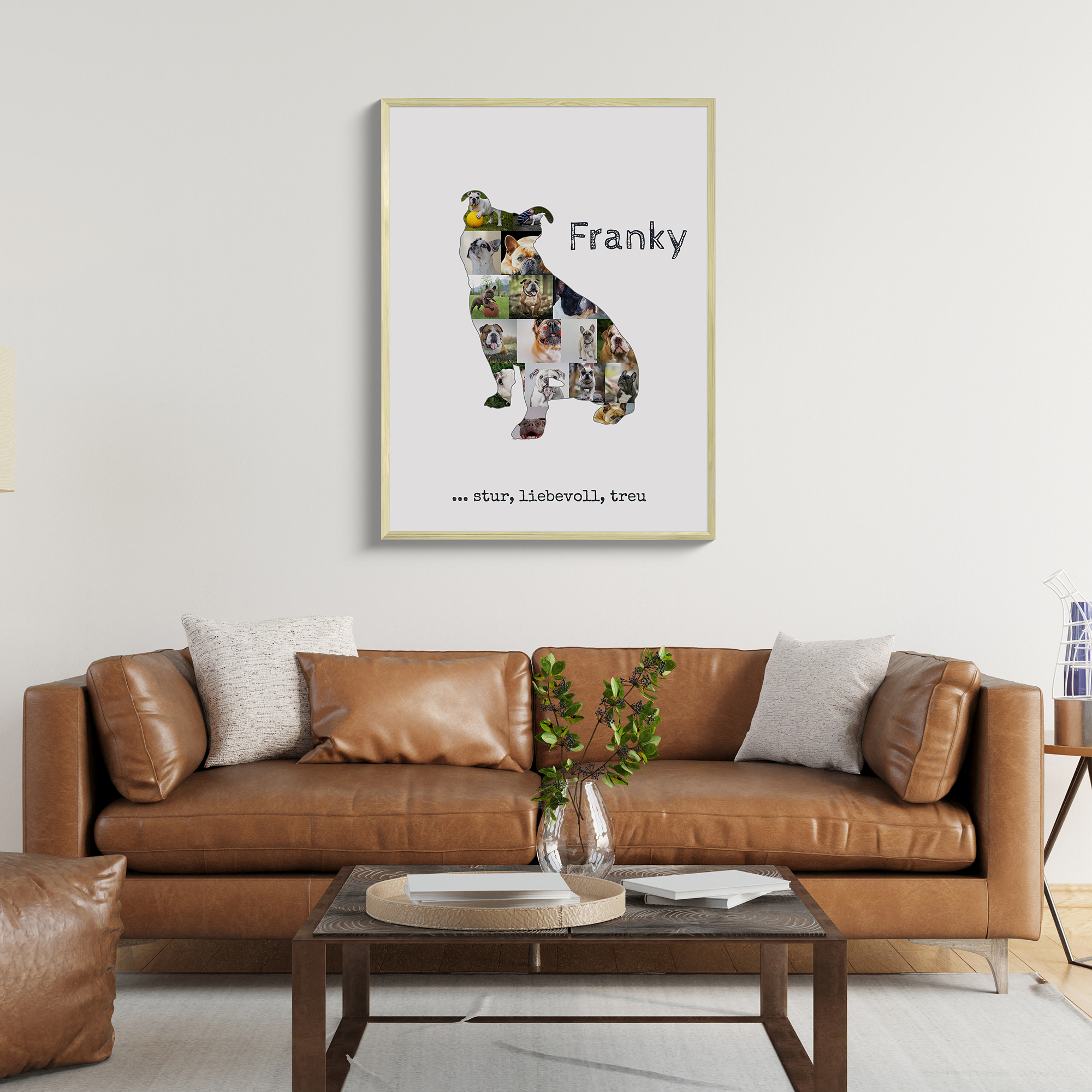 Die Erstellung deiner Fotocollage ist kinderleicht. Lade einfach 15-20 deiner Lieblingsfotos hoch, ordne sie innerhalb der vorgegebenen Silhouette an und verleihe deiner Collage mit individuell hinzugefügtem Text die persönliche Note. Mit nur wenigen Klicks erstellst du ein einzigartiges Kunstwerk, das die besondere Bindung zwischen dir und deinem Hund widerspiegelt.