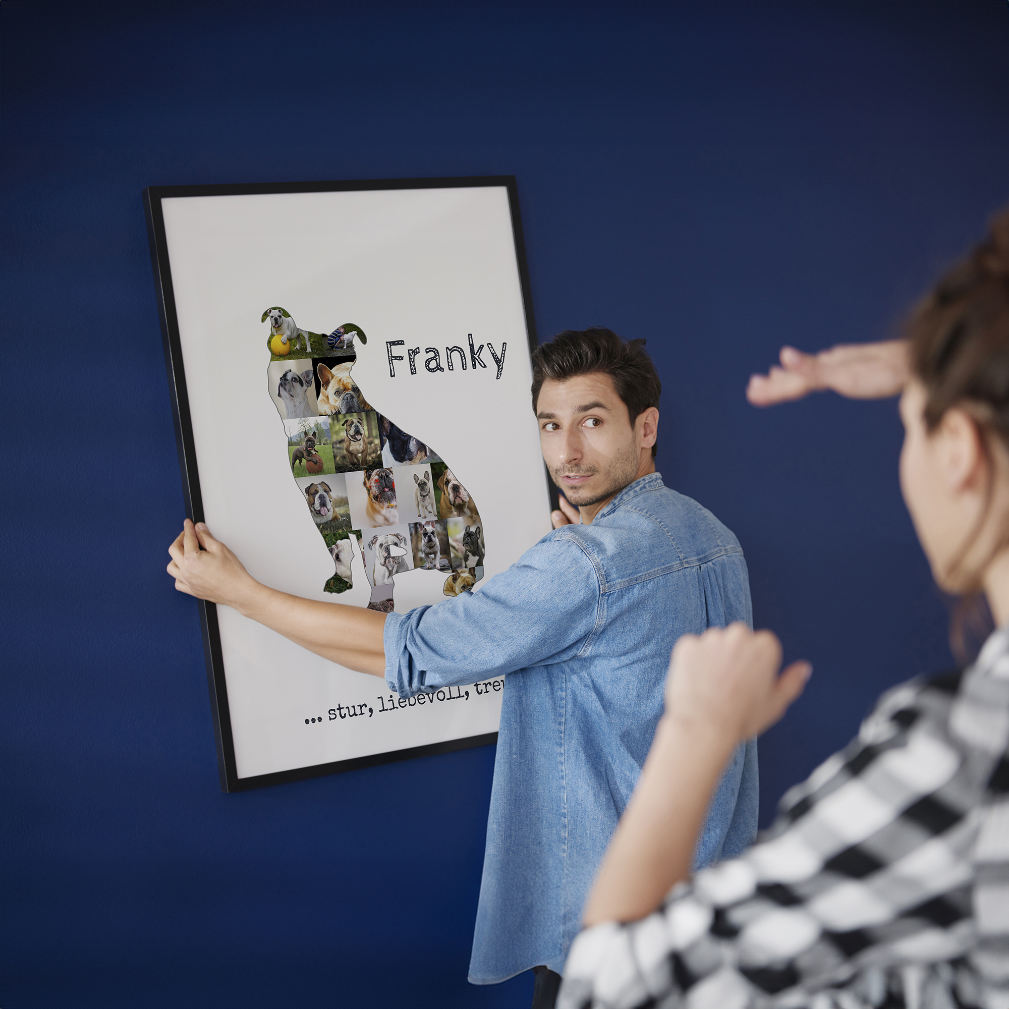 Bist du bereit, deinen treuen Gefährten auf eine ganz besondere Weise zu würdigen? Mit unserer Fotocollage im Old English Bulldog-Design schenkst du deinen liebsten Momenten mit deinem Vierbeiner einen passenden Rahmen. Fülle die einzigartige Silhouette mit deinen persönlichen Fotos und gib deiner Collage mit individuell hinzugefügtem Text eine persönliche Note.