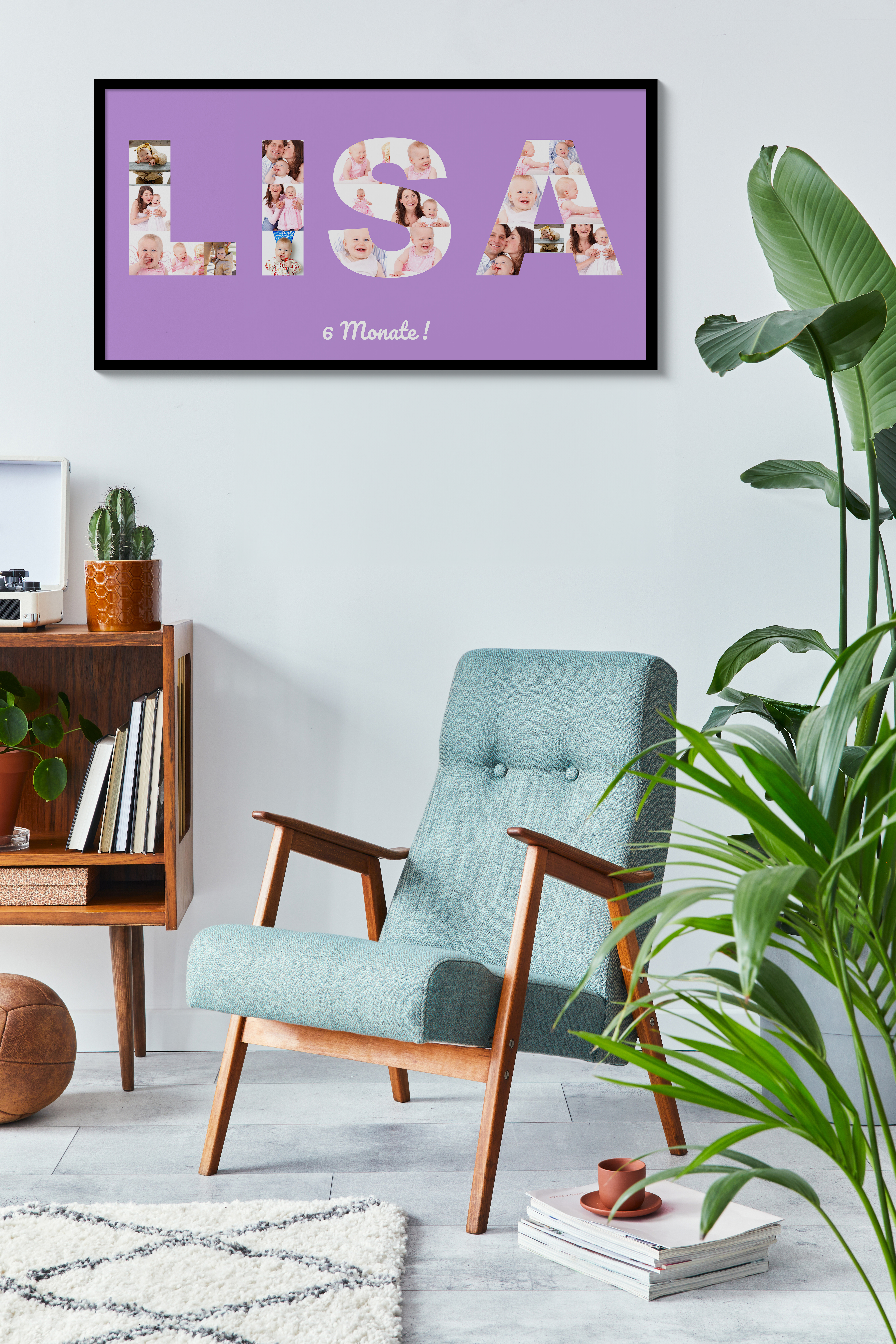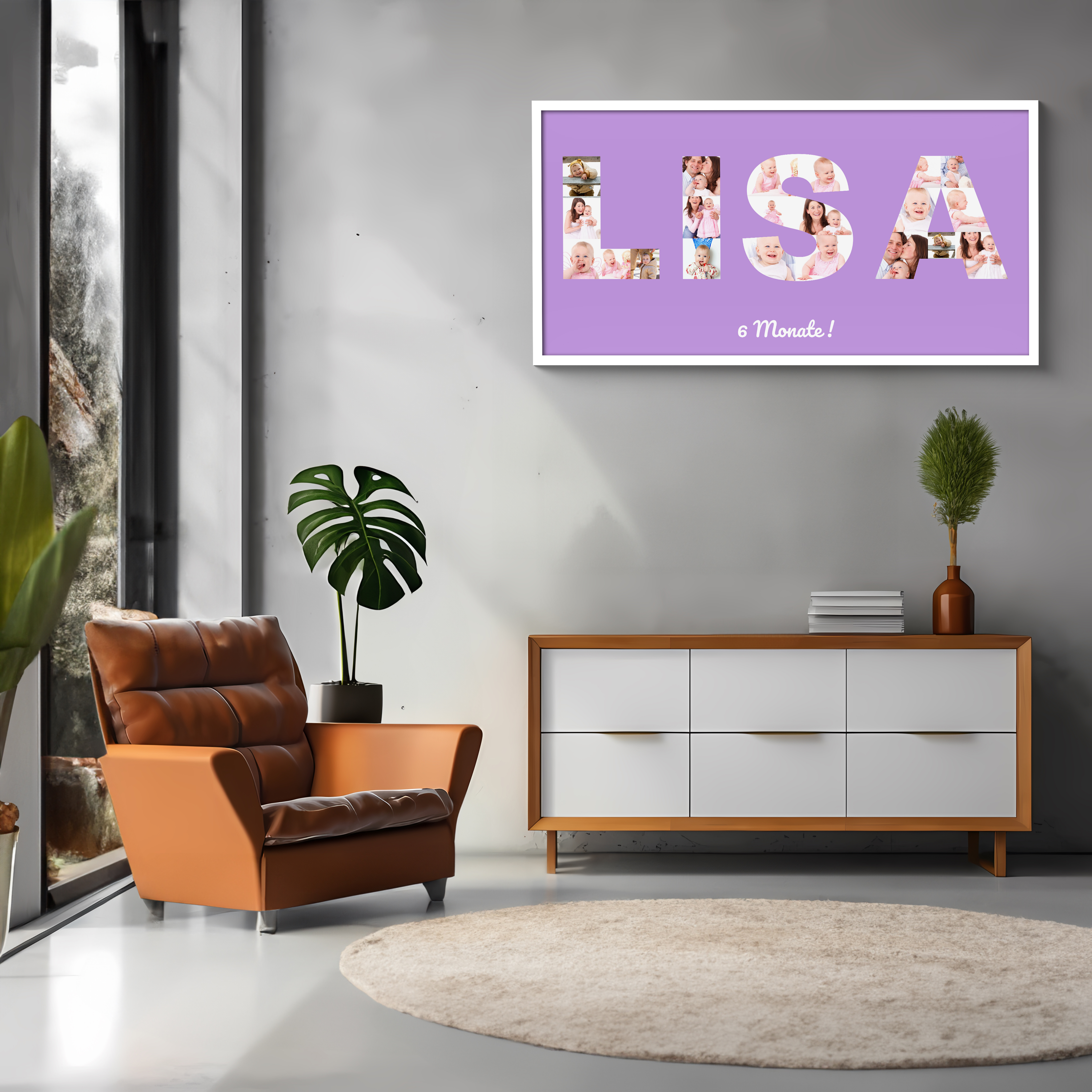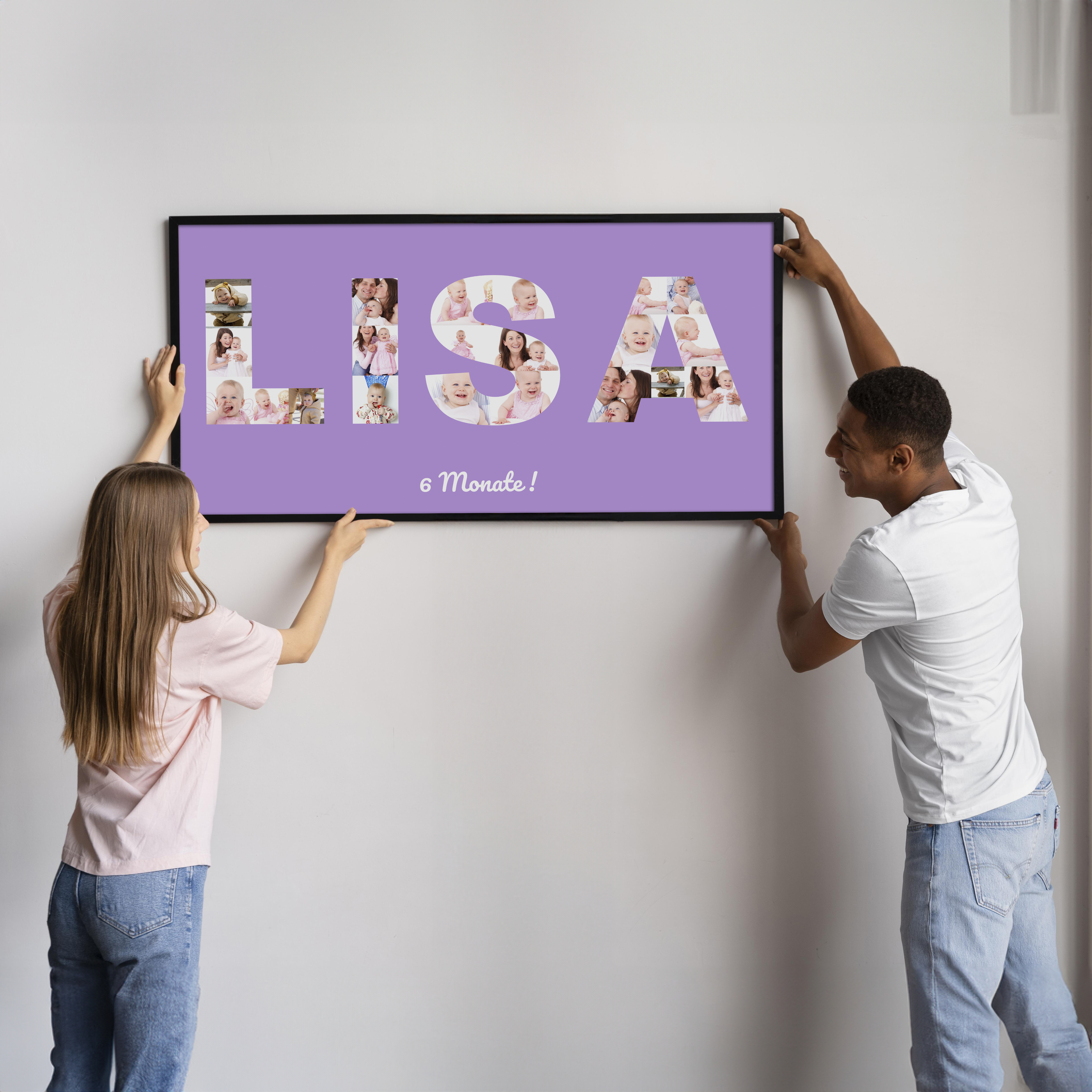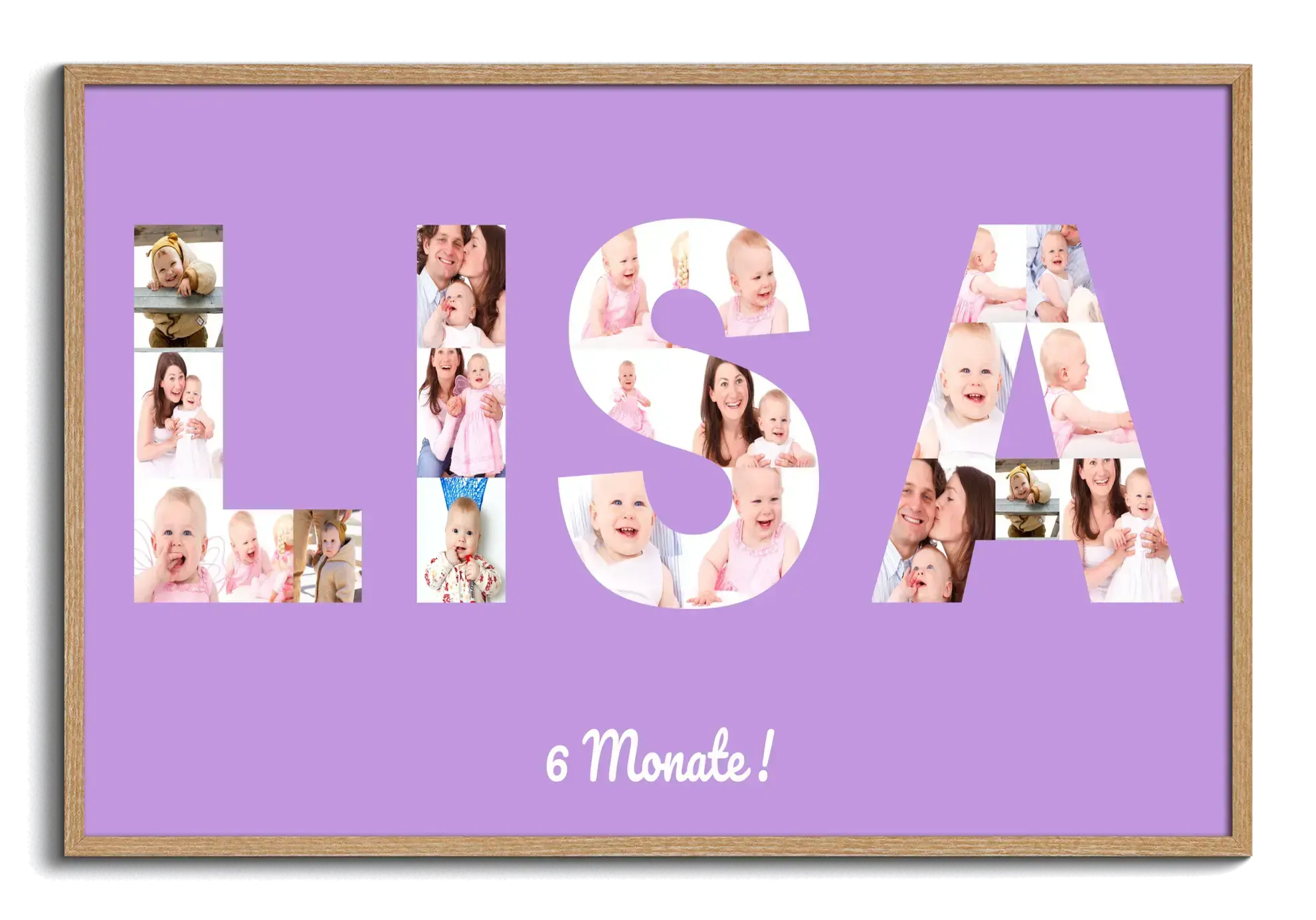 Fotocollage mit Namen: Das ideale Geburtsgeschenk in verschiedenen Formaten.