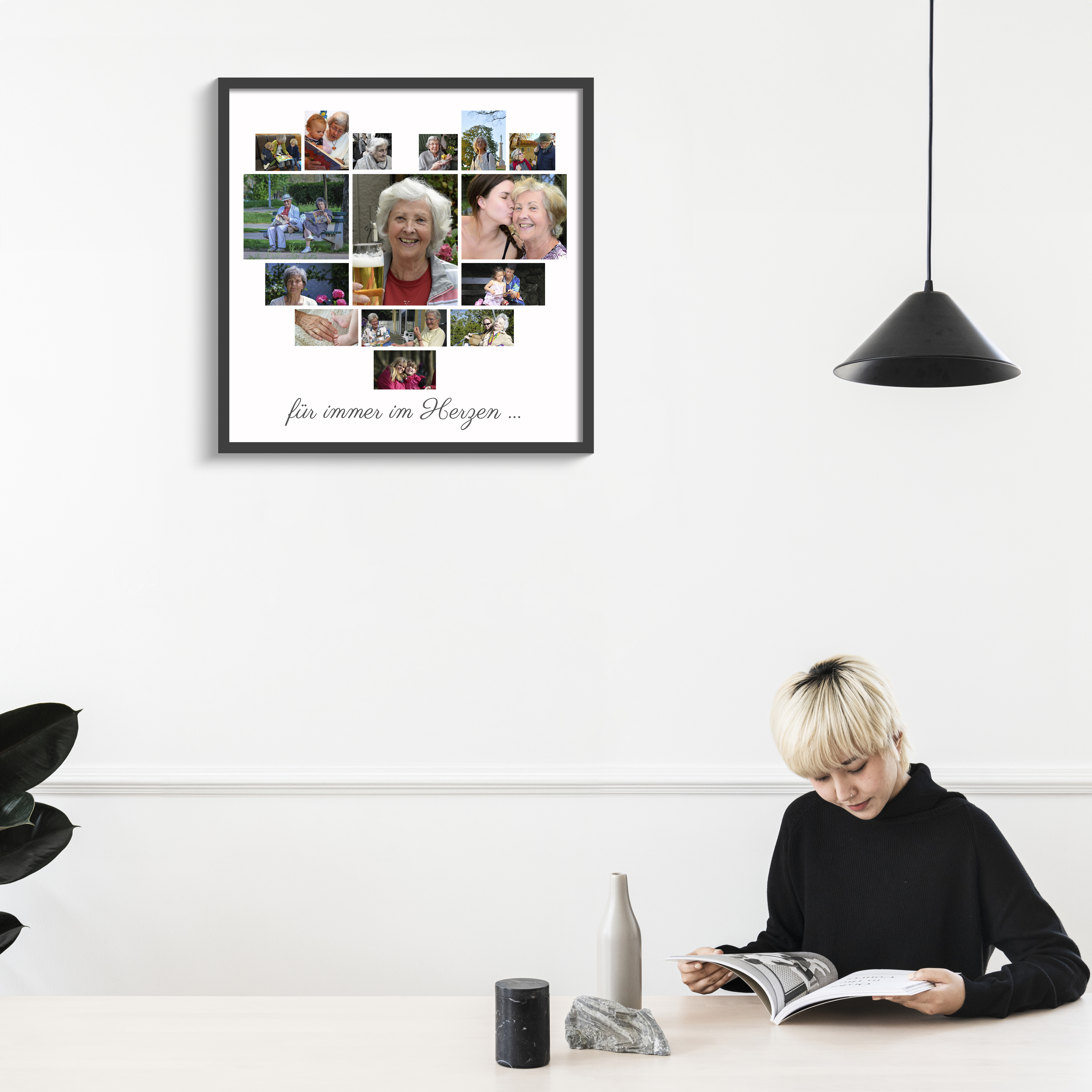 Hol dir deinen persönlichen und einzigartigen Wandschmuck! Nutze unseren intuitiven Web-Designer und gestalte selbst eine atemberaubende "Für immer im Herzen" Fotocollage in Herzform. In einem quadratischen Poster mit den Massen 30x30cm kannst du 15 besondere Bilder festhalten und jederzeit in Erinnerung rufen.