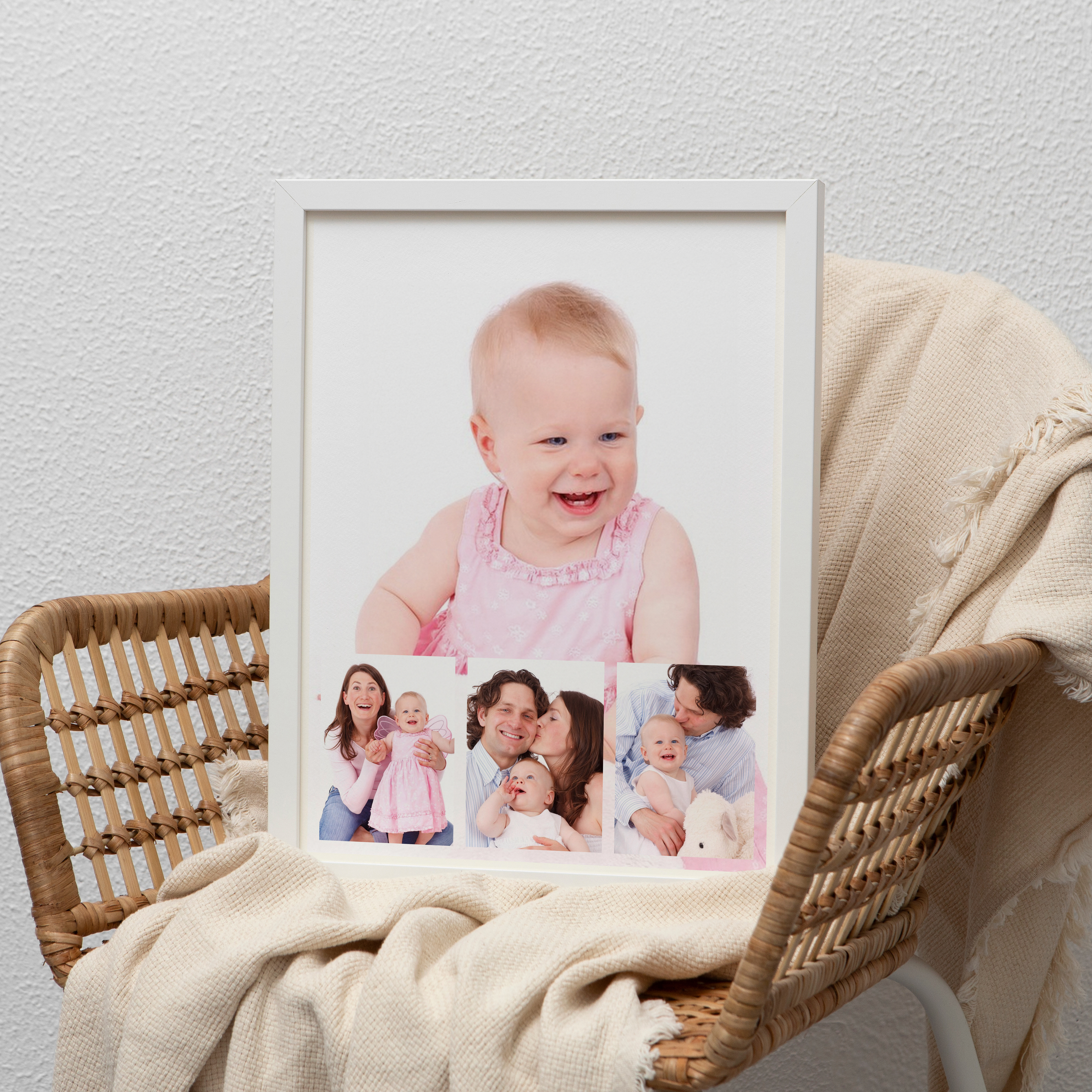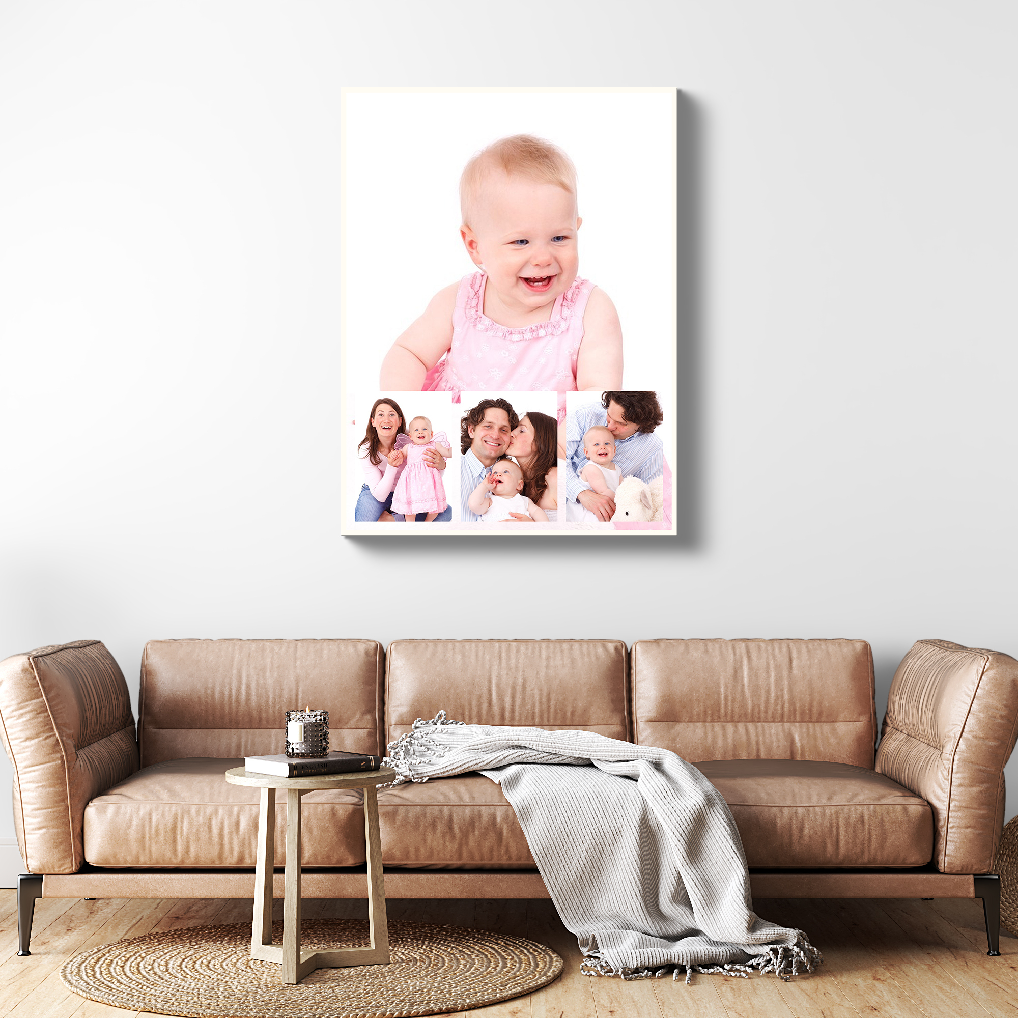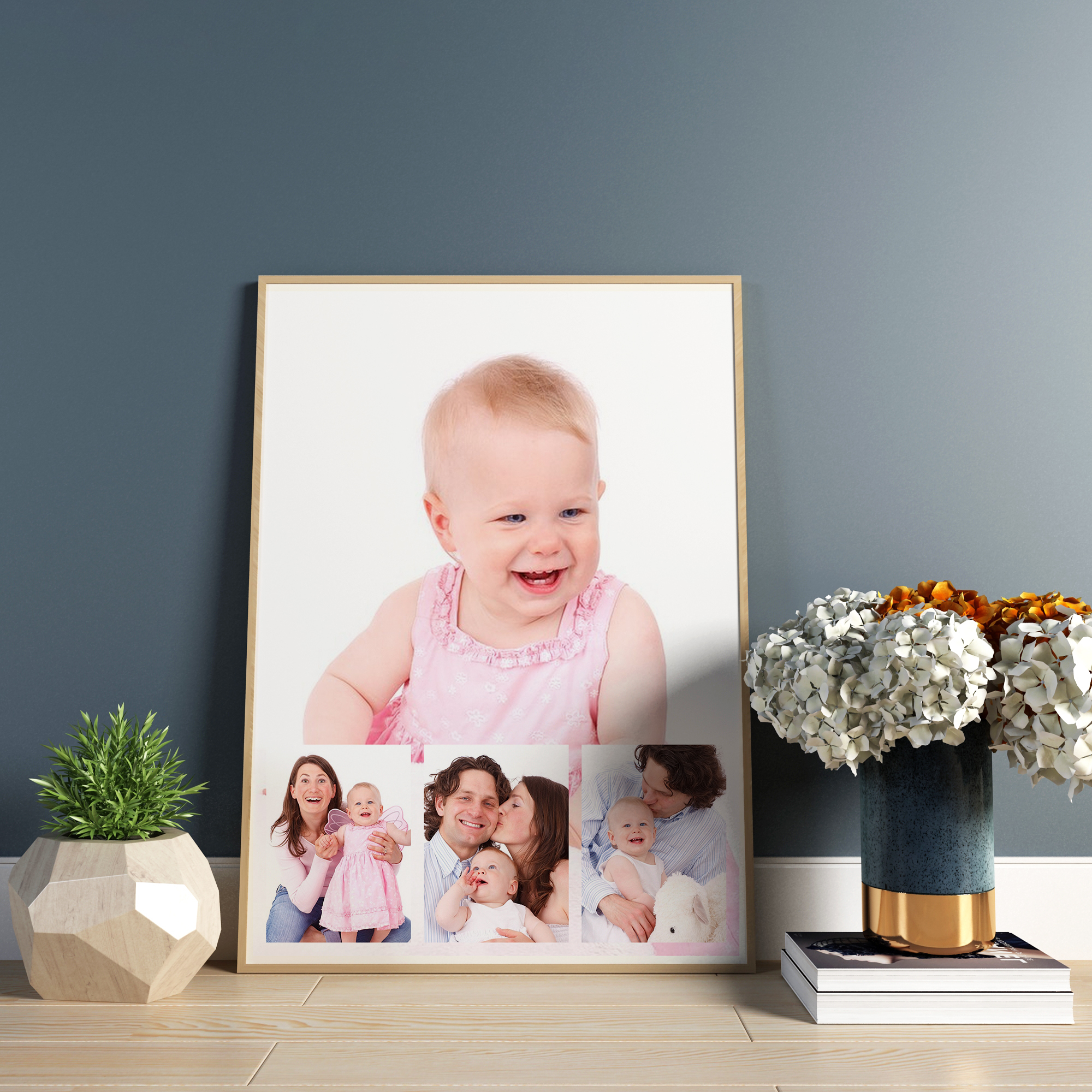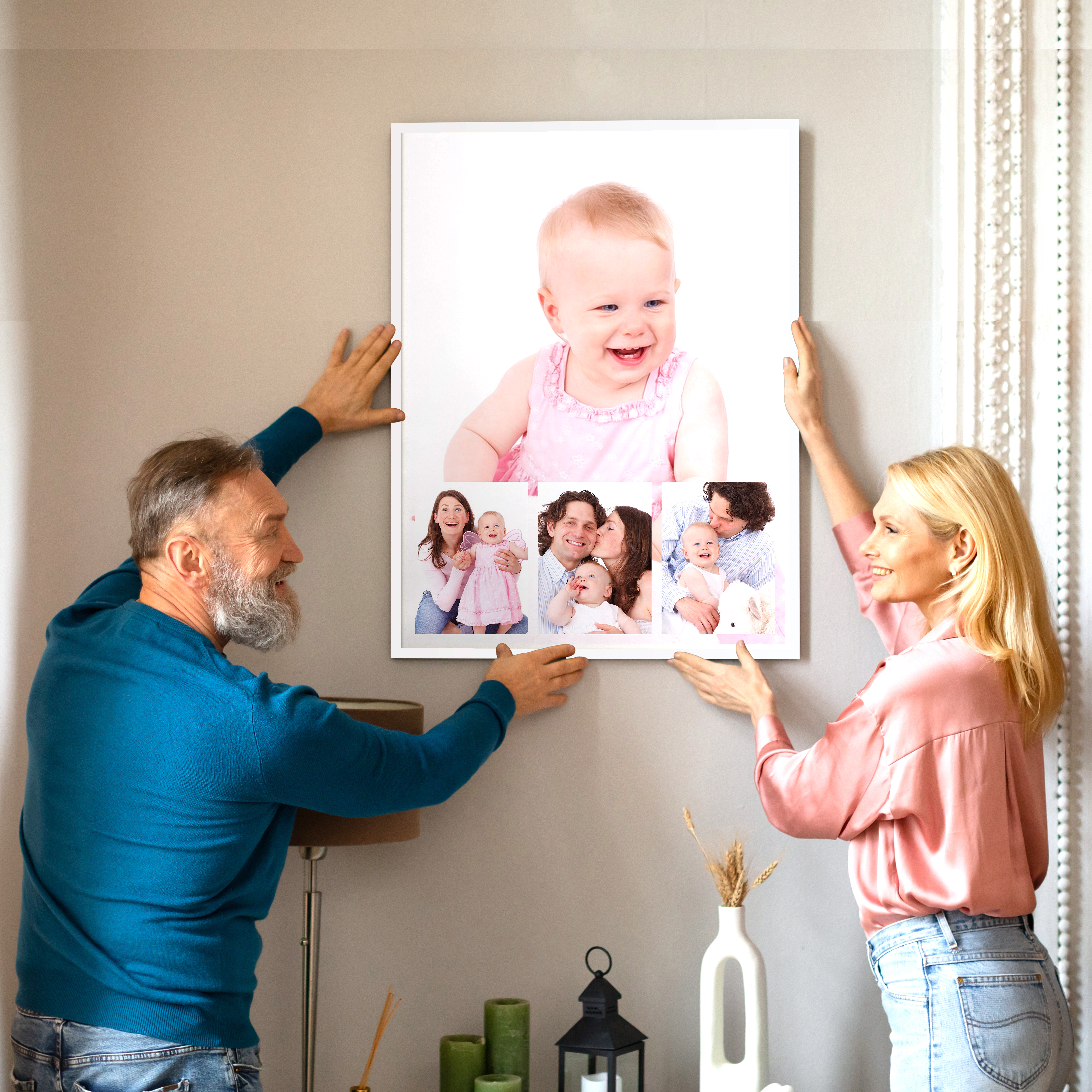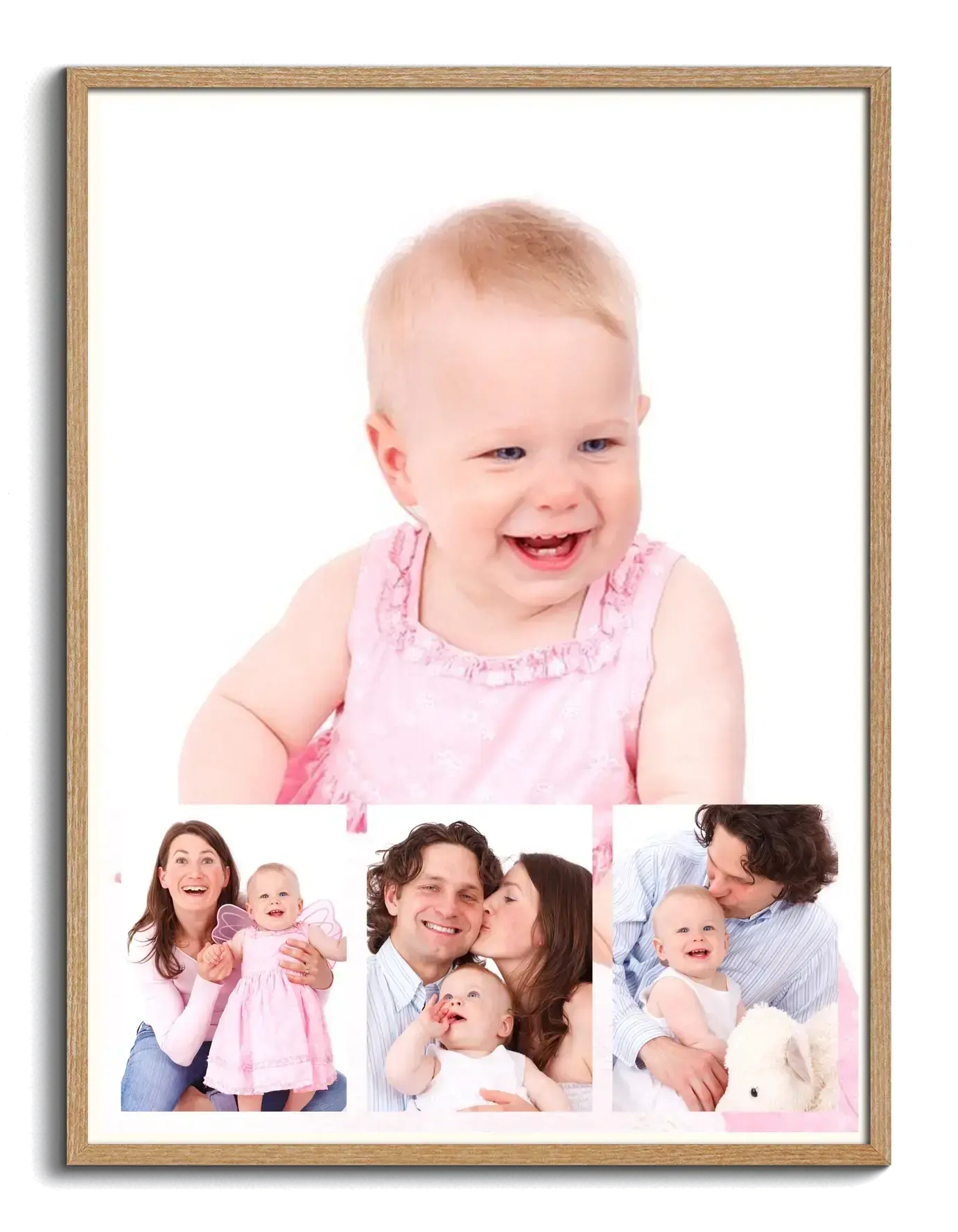 Gestalte jetzt deine persönliche Familien-Collage. Dieses Beispiel zeigt ein grosses Hintergrundfoto deiner Familie, ergänzt durch drei kleinere Bilder unten – ideal, um Highlights der Kinder oder gemeinsame Momente zu zeigen. Ein herzliches Geschenk für Eltern und Grosseltern oder als Blickfang für dein Zuhause.