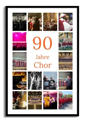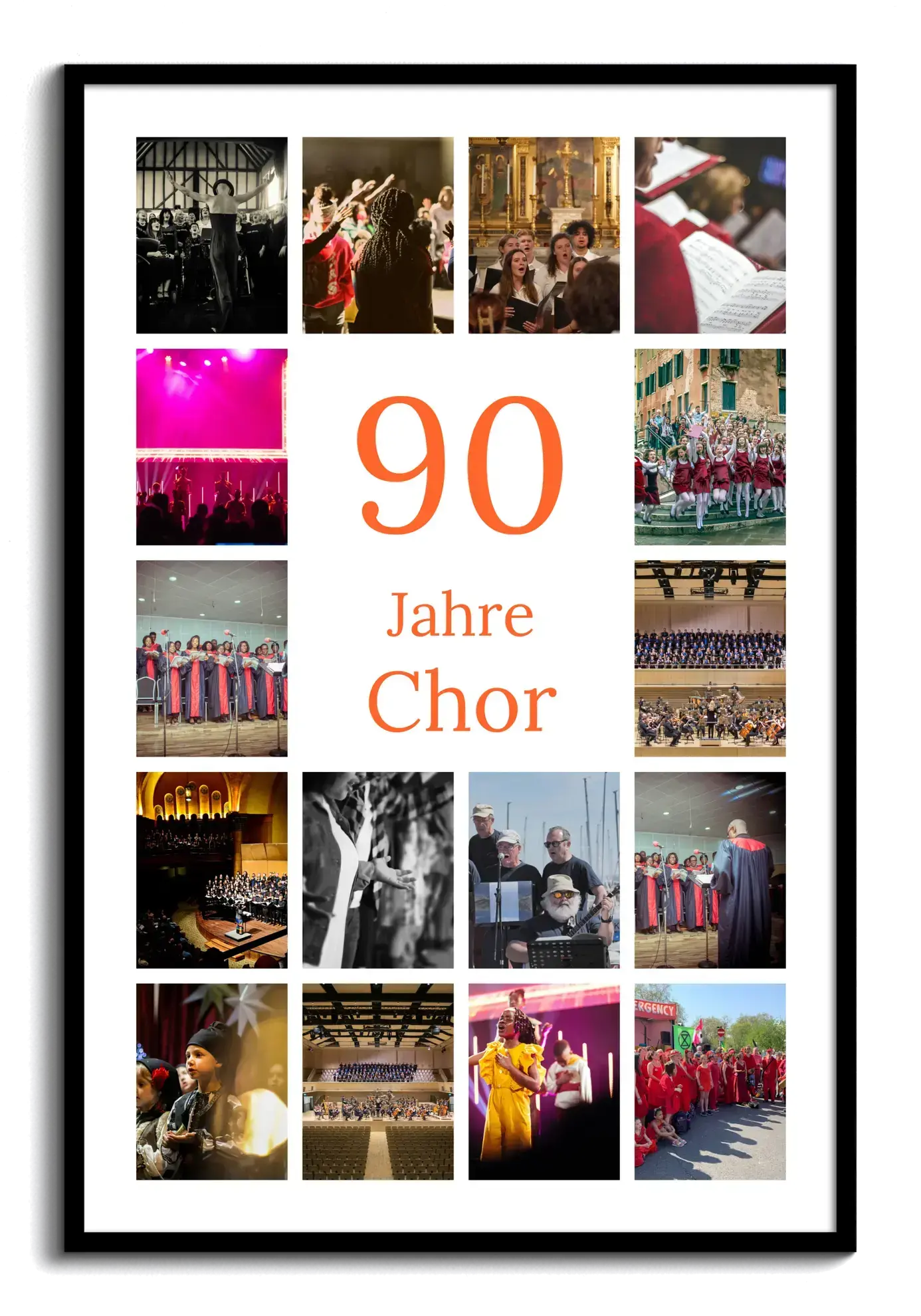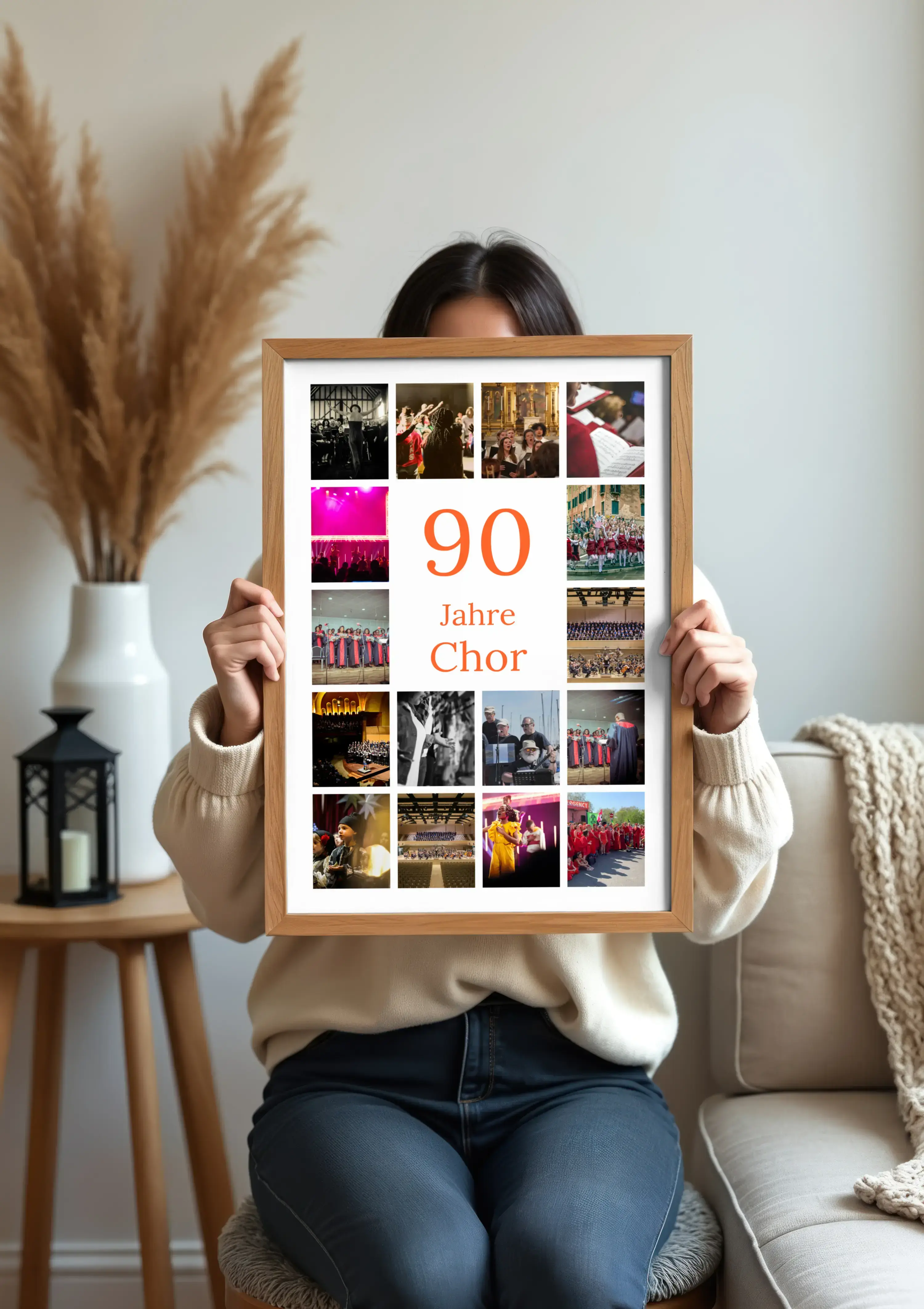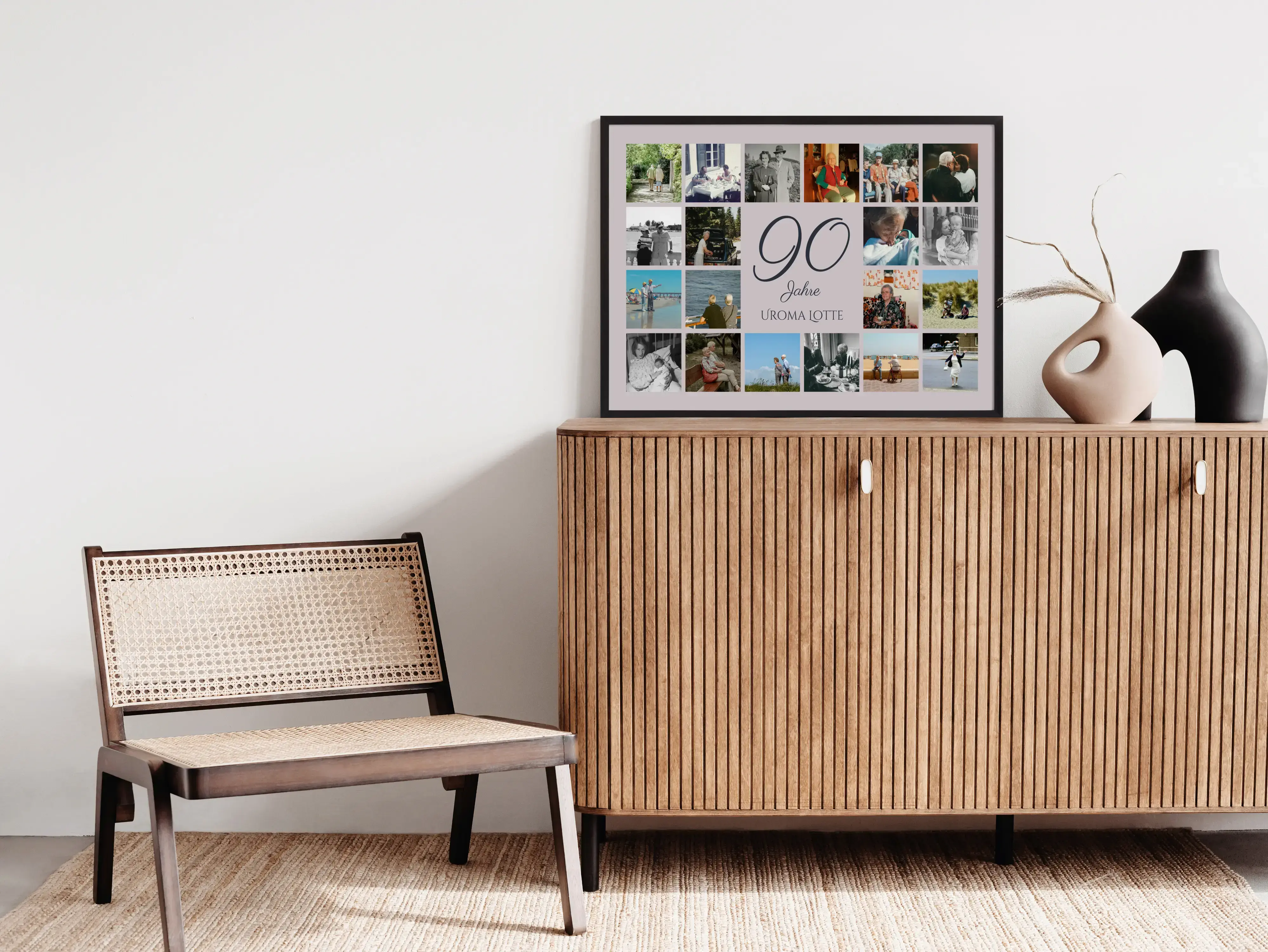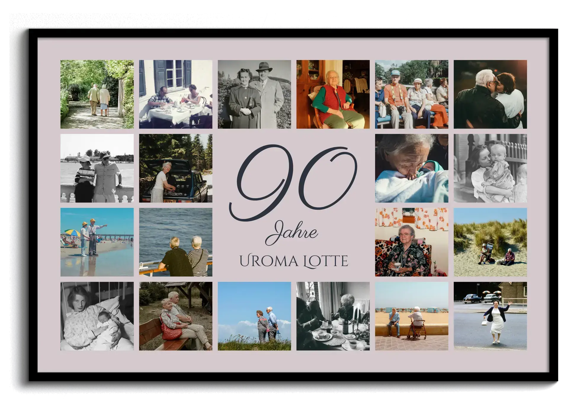 Collage 90: Zahl im Zentrum, Name/Gruss, 20–80 Fotos. Für 90. Geburtstag, Firmen-/Vereinsjubiläum.