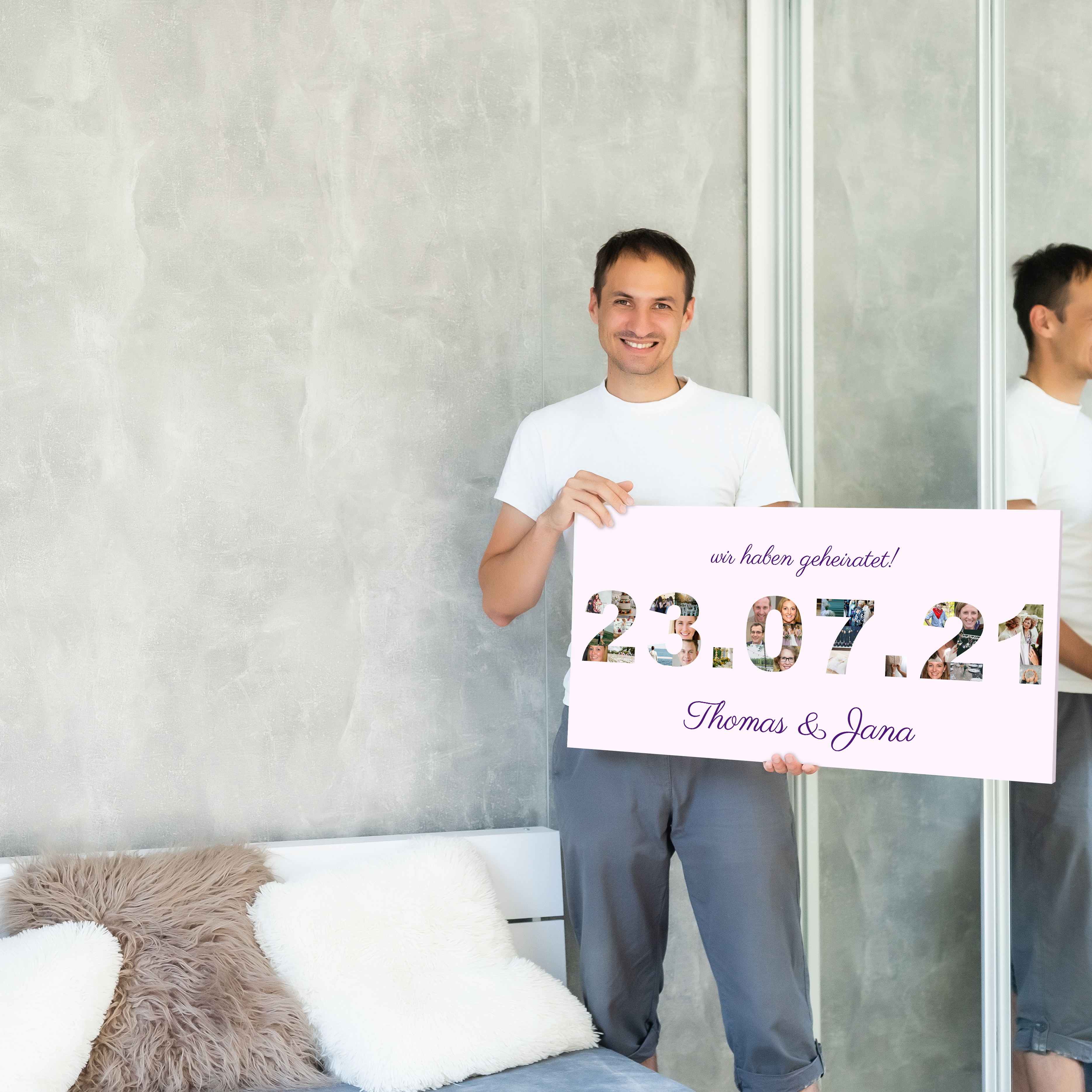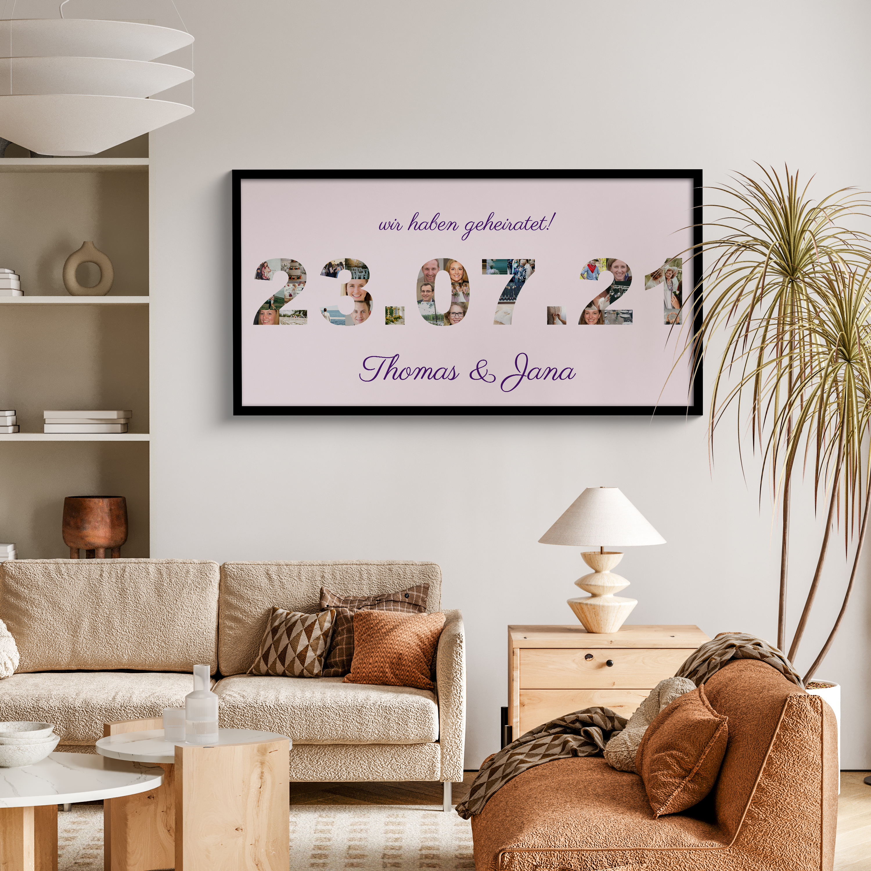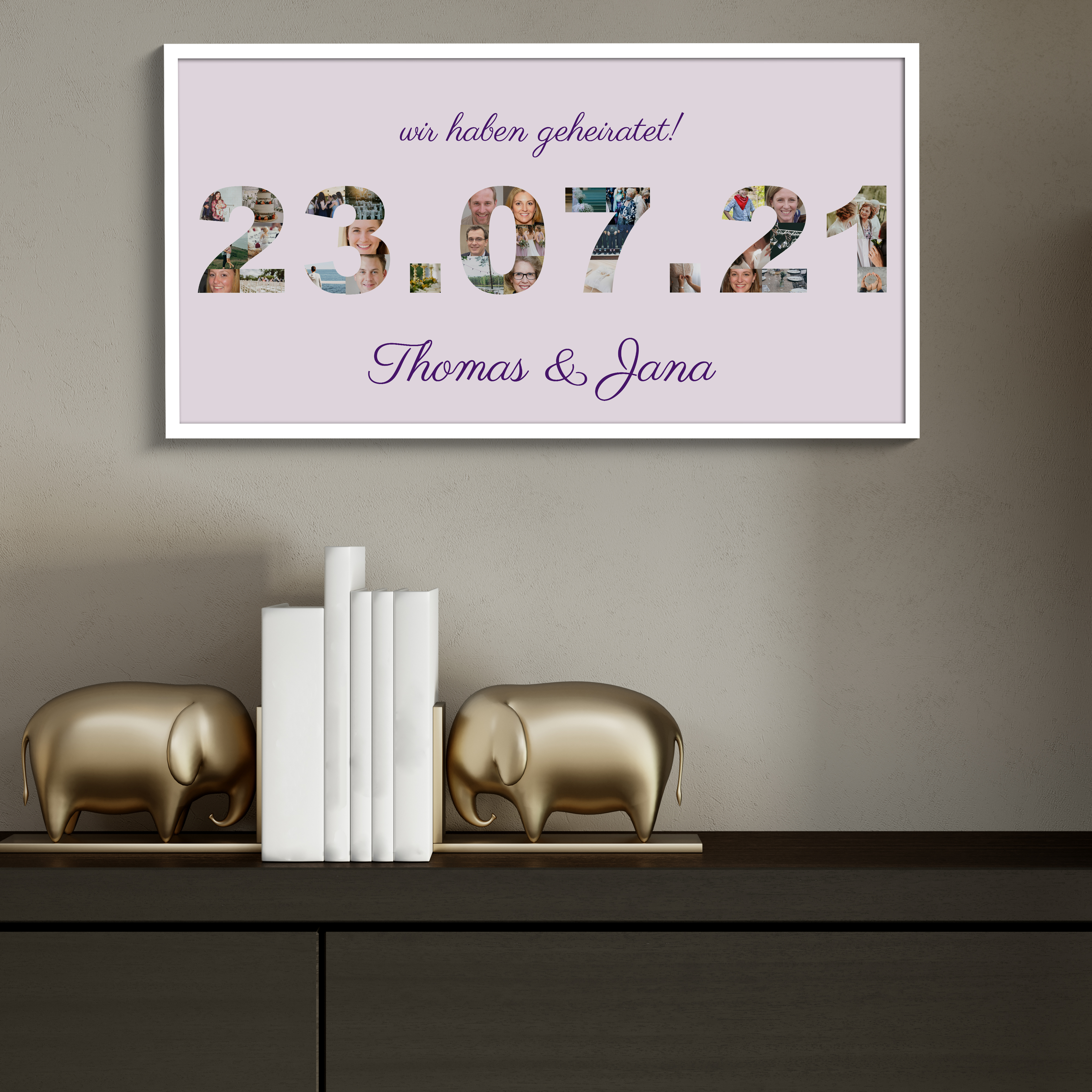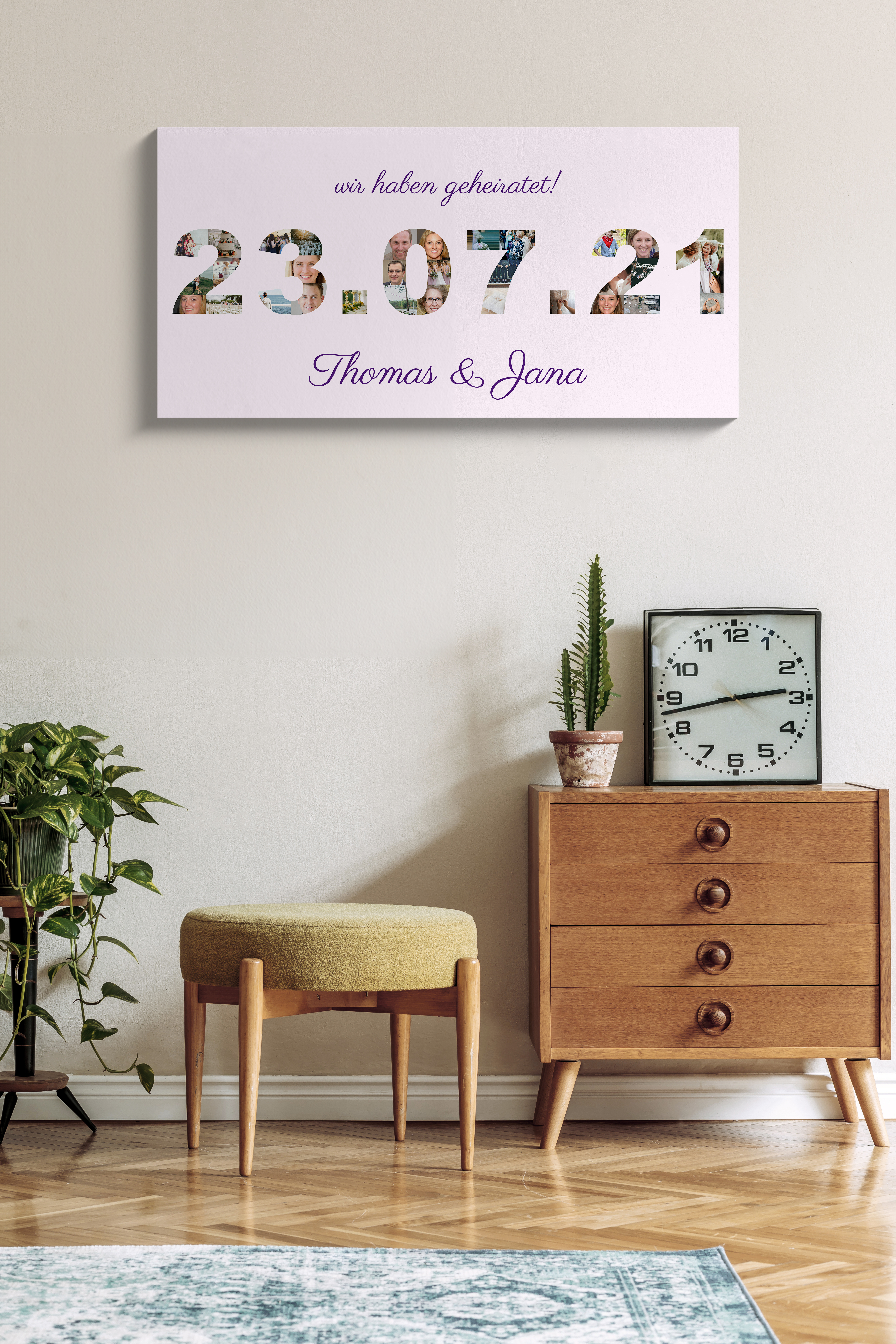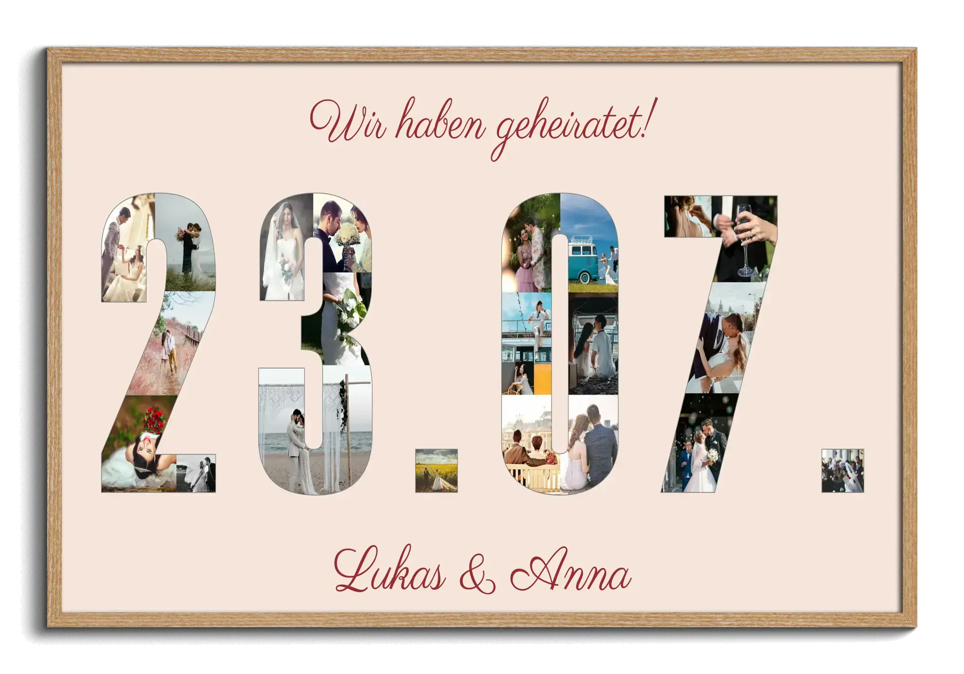 Gestalte jetzt deine persönliche Hochzeitsdatum-Collage! Das Datum eurer Trauung entsteht aus vielen kleinen Lieblingsfotos, ergänzt um den Spruch wir haben geheiratet und eure Namen darunter. Als Leinwand oder Qualitätsdruck personalisierbar – ein besonderes Geschenk und eine stilvolle Erinnerung.