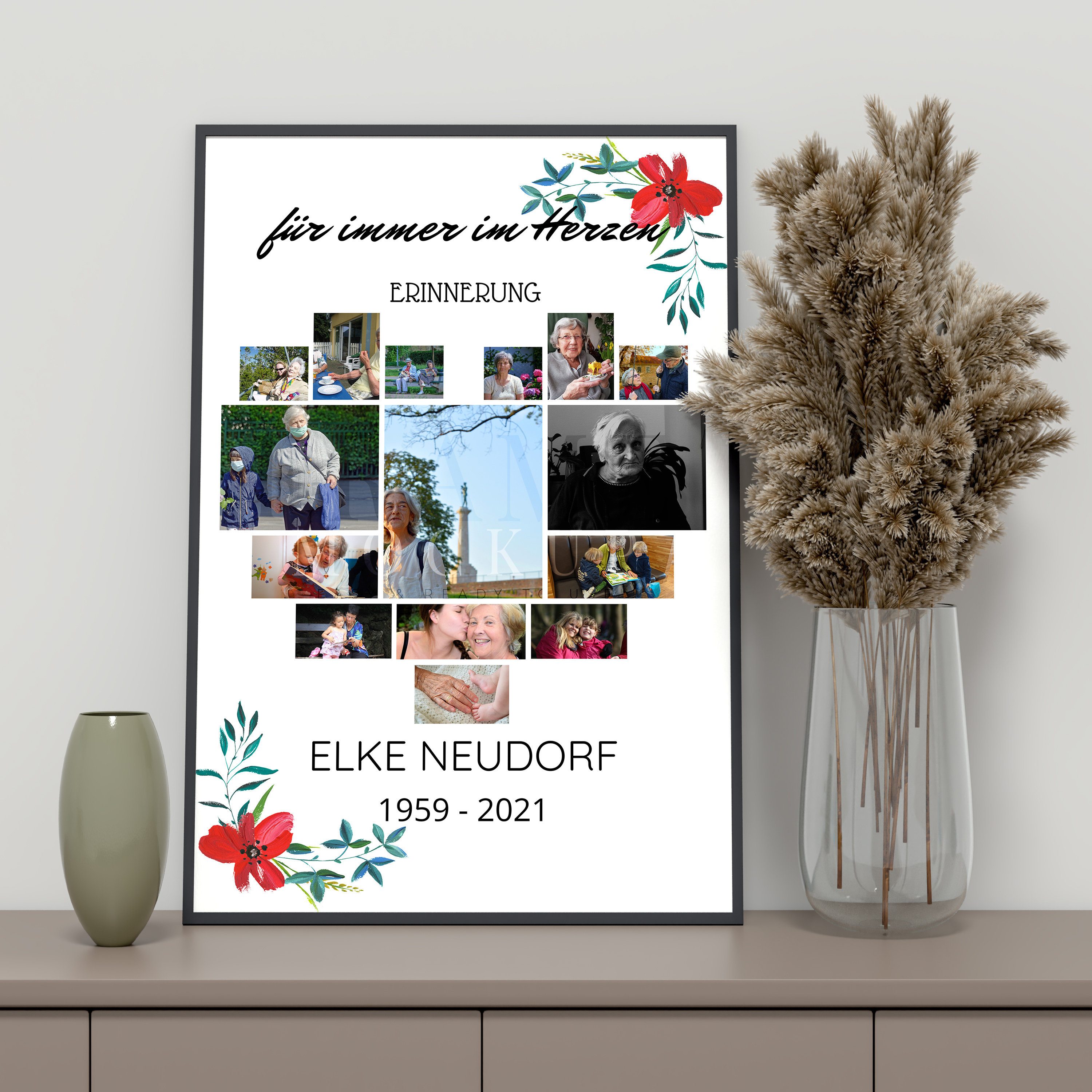 Diese besondere Fotocollage eignet sich nicht nur als liebevolle Erinnerung bei Trauerfeiern oder im Zuhause, sondern auch als einzigartiges Geschenk zu verschiedenen Anlässen. Egal, ob Geburtstage, Jubiläen oder als Dankesgeschenk, die gestaltbare Collage bietet eine ganz persönliche Note.