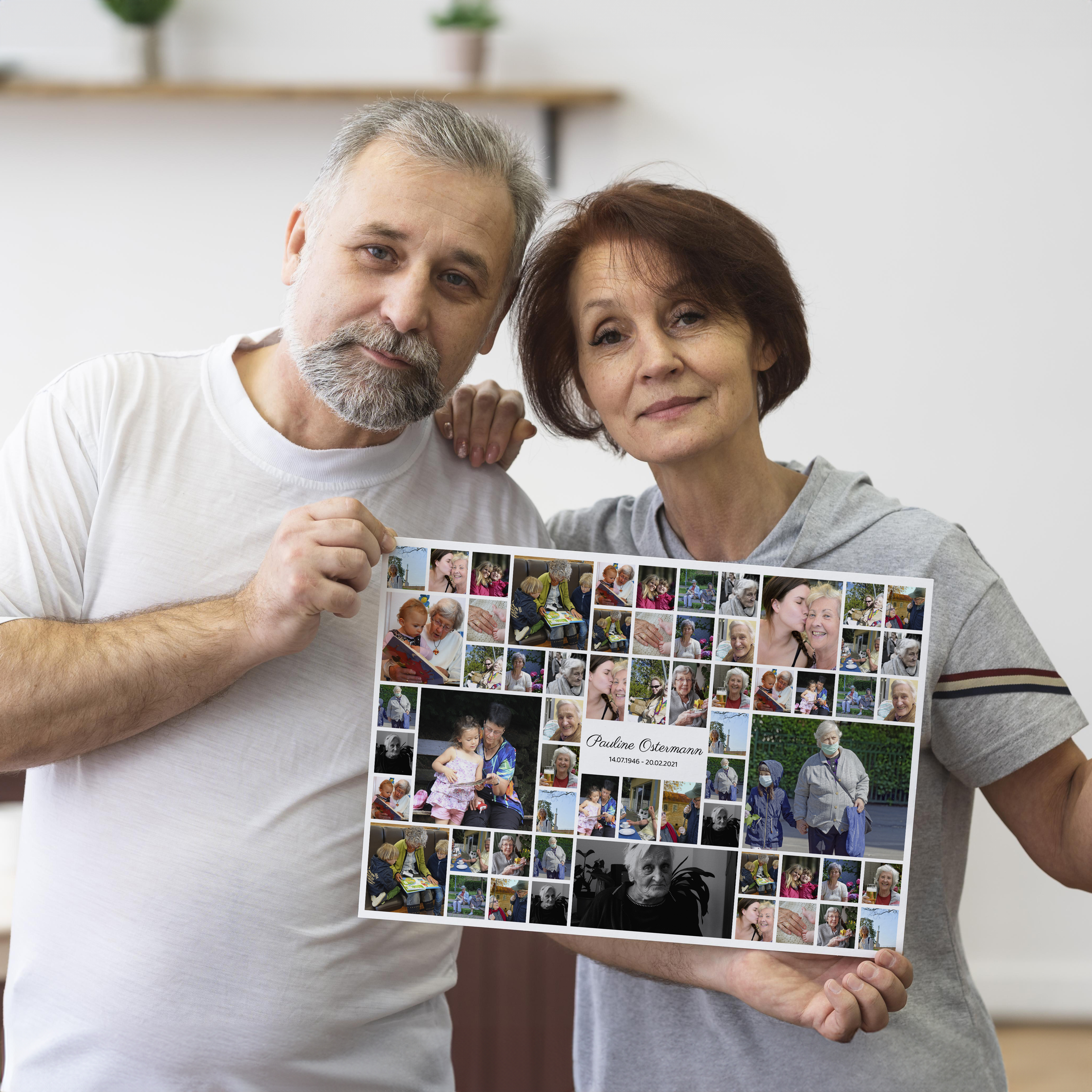 Gestalte eine einzigartige und persönliche Trauercollage für einen ganz besonderen Menschen. Dieses Produkt bietet dir die Möglichkeit, 60 Fotos liebevoll in einem Raster anzuordnen und mit persönlichen Texten wie Namen und Gedenkdaten zu ergänzen. Wähle den hochwertigen Premiumdruck auf Leinwand und erschaffe ein schönes Erinnerungsstück für die Trauerfeier oder dein Zuhause.