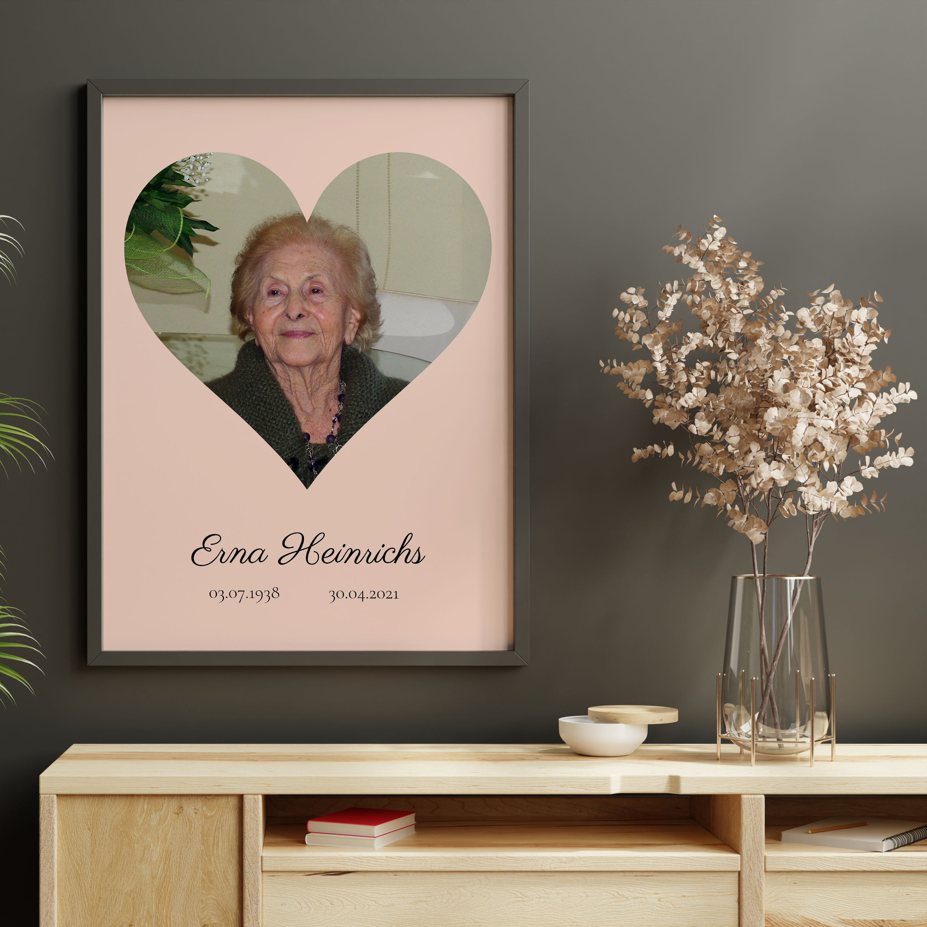 Erinnerung bewahren: Trauerfoto in Herzform, vielfältig personalisierbar, auf Poster gedruckt.