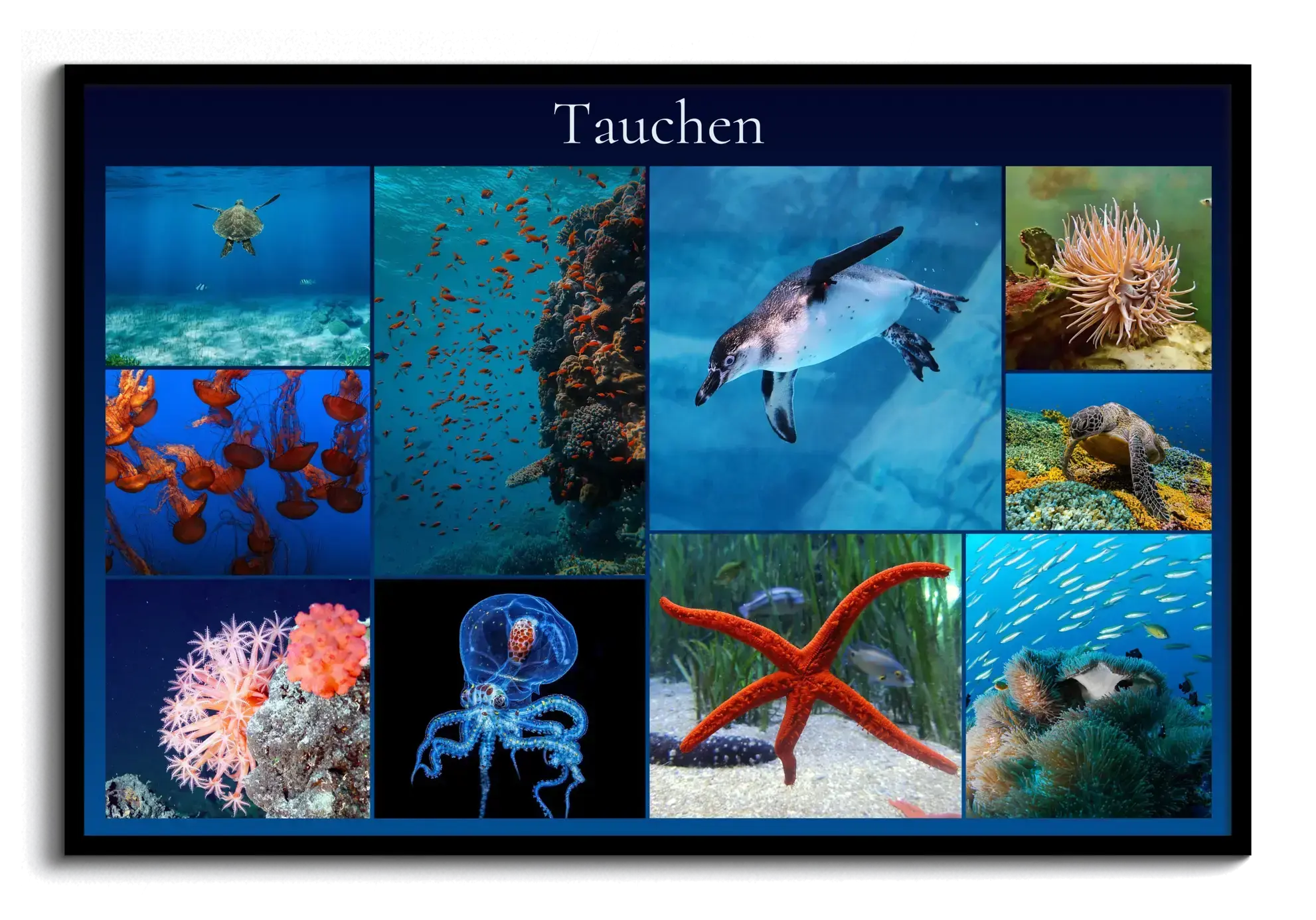 Unterwasser-Collagen im Premium-Druck: Tauchen, Fische, Korallen, Quallen, Schildkröten, Delfine.