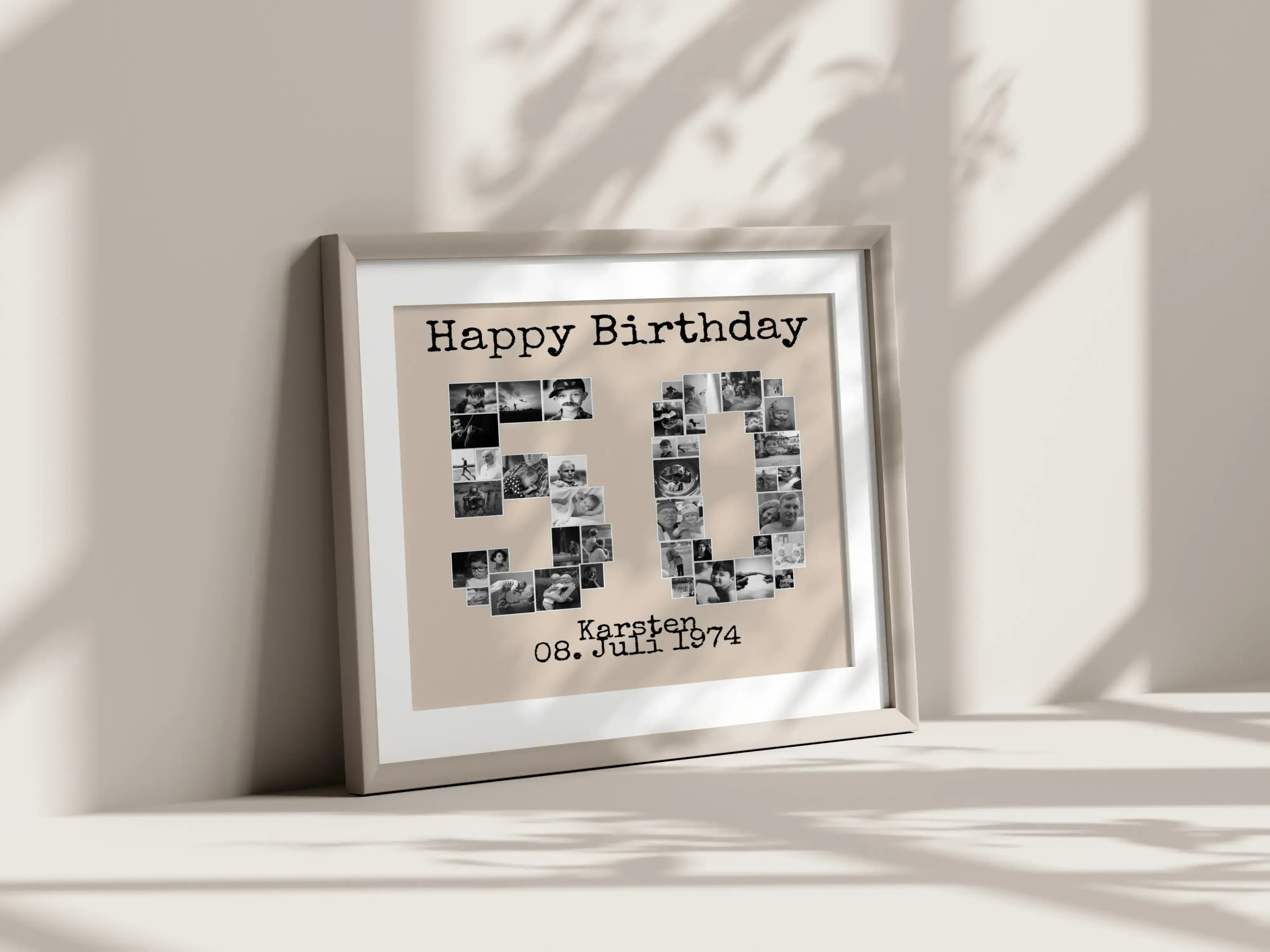 Gestalte deine ganz persönliche Fotocollage in Form deiner Wunschzahl und verleihe besonderen Momenten eine individuelle Note. Diese Zahlencollage eignet sich perfekt für Geburtstage, Jubiläen oder bedeutende Meilensteine und ist in diversen Grössen und Formaten erhältlich, darunter als Poster, gerahmtes Bild, Leinwand, Acryl oder Alu-Dibond. Jedes Detail lässt sich anpassen, von der Zahl selbst über die Fotos bis hin zu Text und Hintergrund.