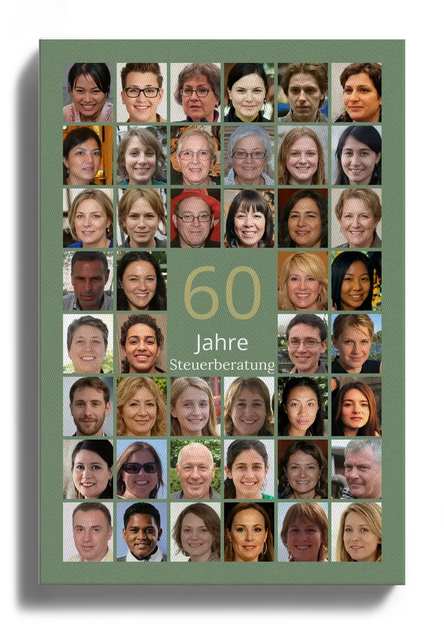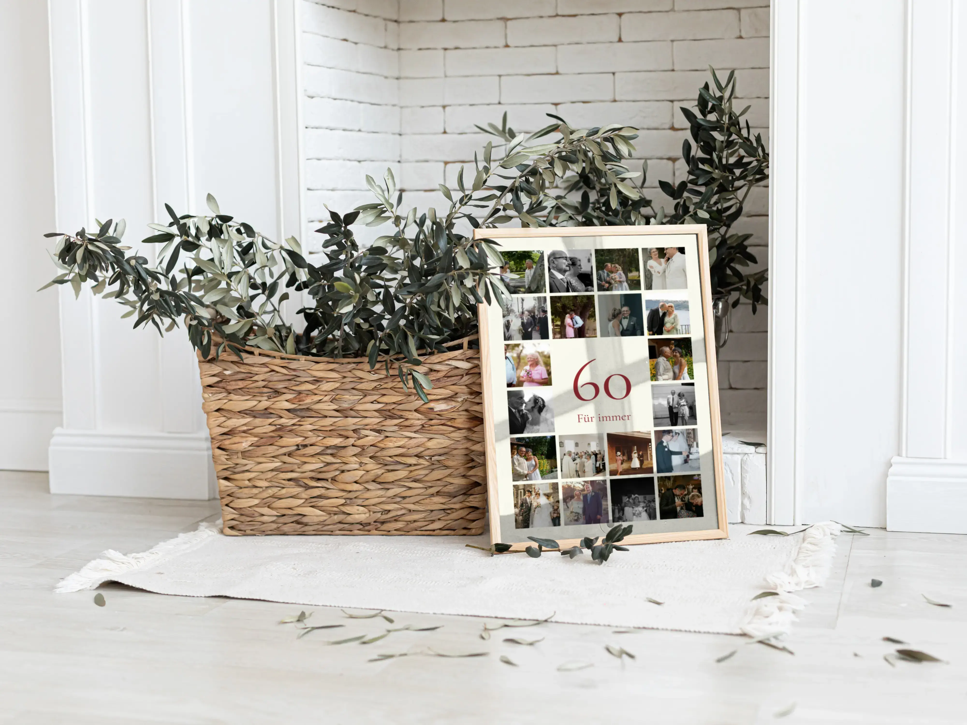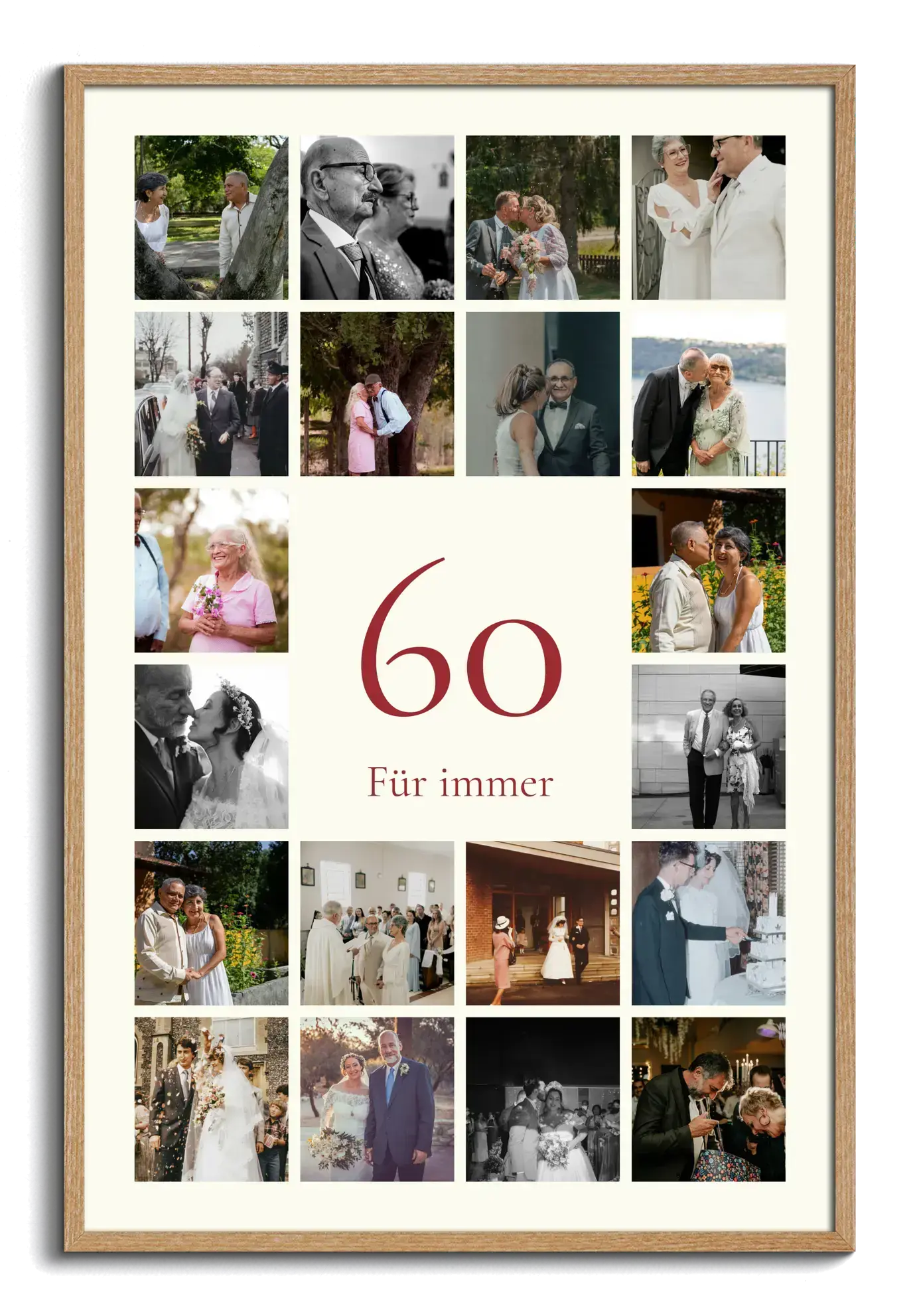 Jetzt deine Jubiläums-Zahl Collage 60 gestalten. Im Zentrum steht eine grosse 60, darüber ergänzt du den Namen, darunter einen Gruss. Ein Raster aus 20–80 deiner Fotos rahmt die Zahl ein. Zahl, Name, Gruss, Bildanzahl, Hintergrund, Farben und Hoch- oder Querformat passt du frei an. Perfekt als Geschenk zum 60. Geburtstag, zur Diamantenen Hochzeit oder zum 60-jährigen Jubiläum.