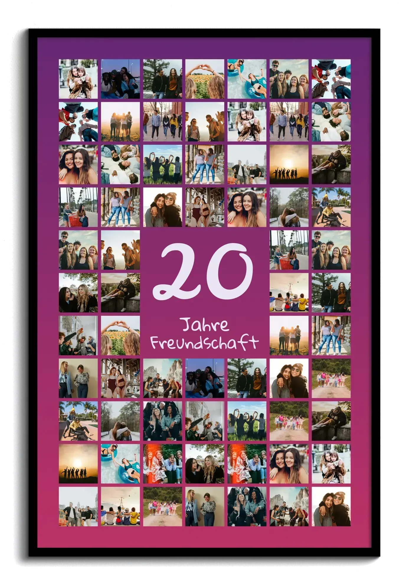 Starte jetzt und gestalte deine Jubiläums-Zahl Collage 20. Die grosse 20 steht im Zentrum, oben der Name, unten dein Gruss – umrahmt von 20–80 Fotos im klaren Raster. Zahl, Name, Text, Bildanzahl, Hintergrund, Farben sowie Hoch- oder Querformat sind frei wählbar. Ideal als Geschenk zum 20. Geburtstag, 20. Hochzeitstag, 20 Jahre Freundschaft oder ein 20-jähriges Firmenjubiläum.