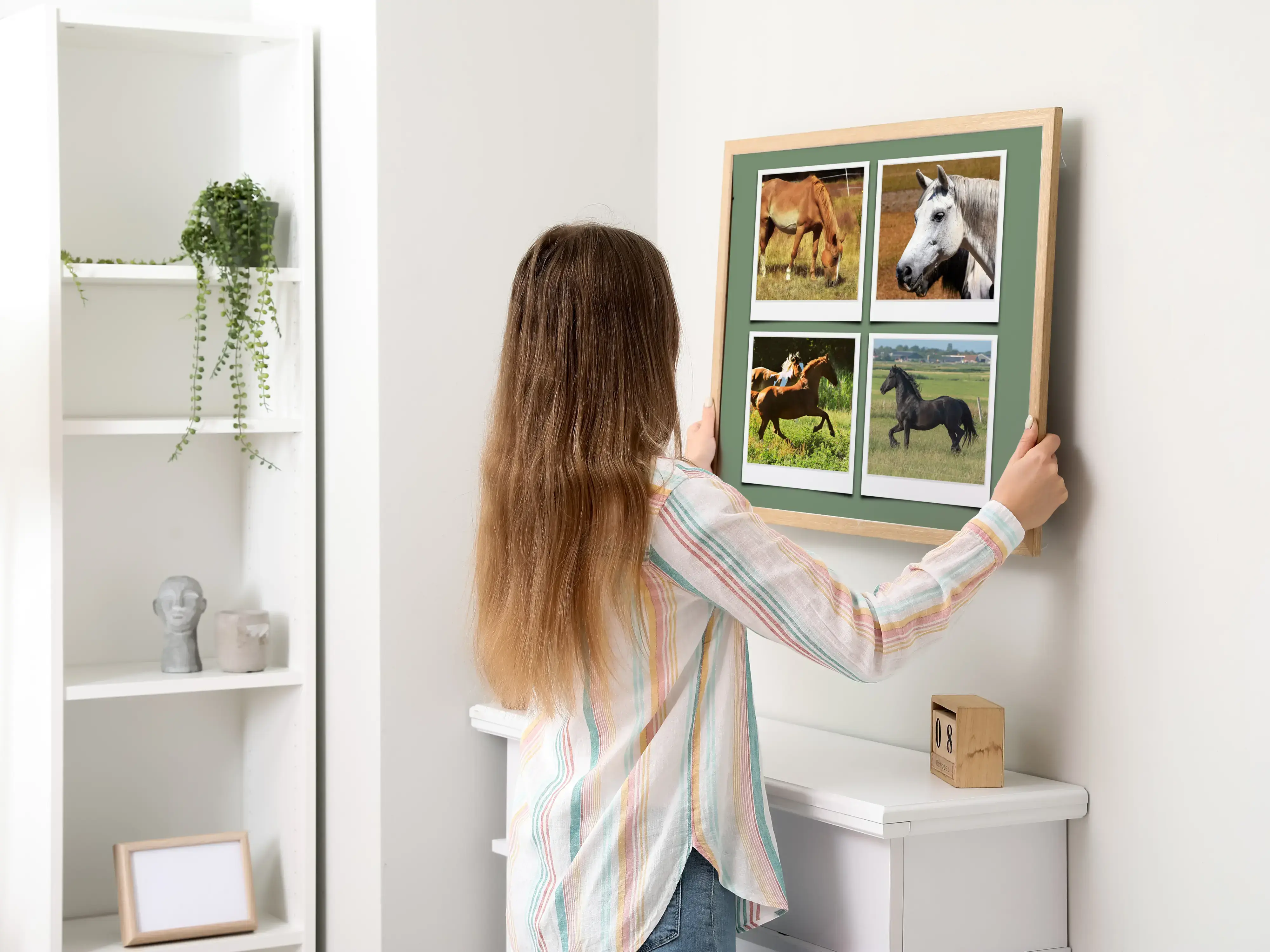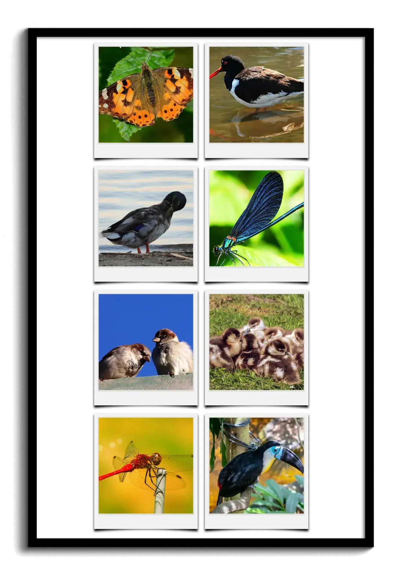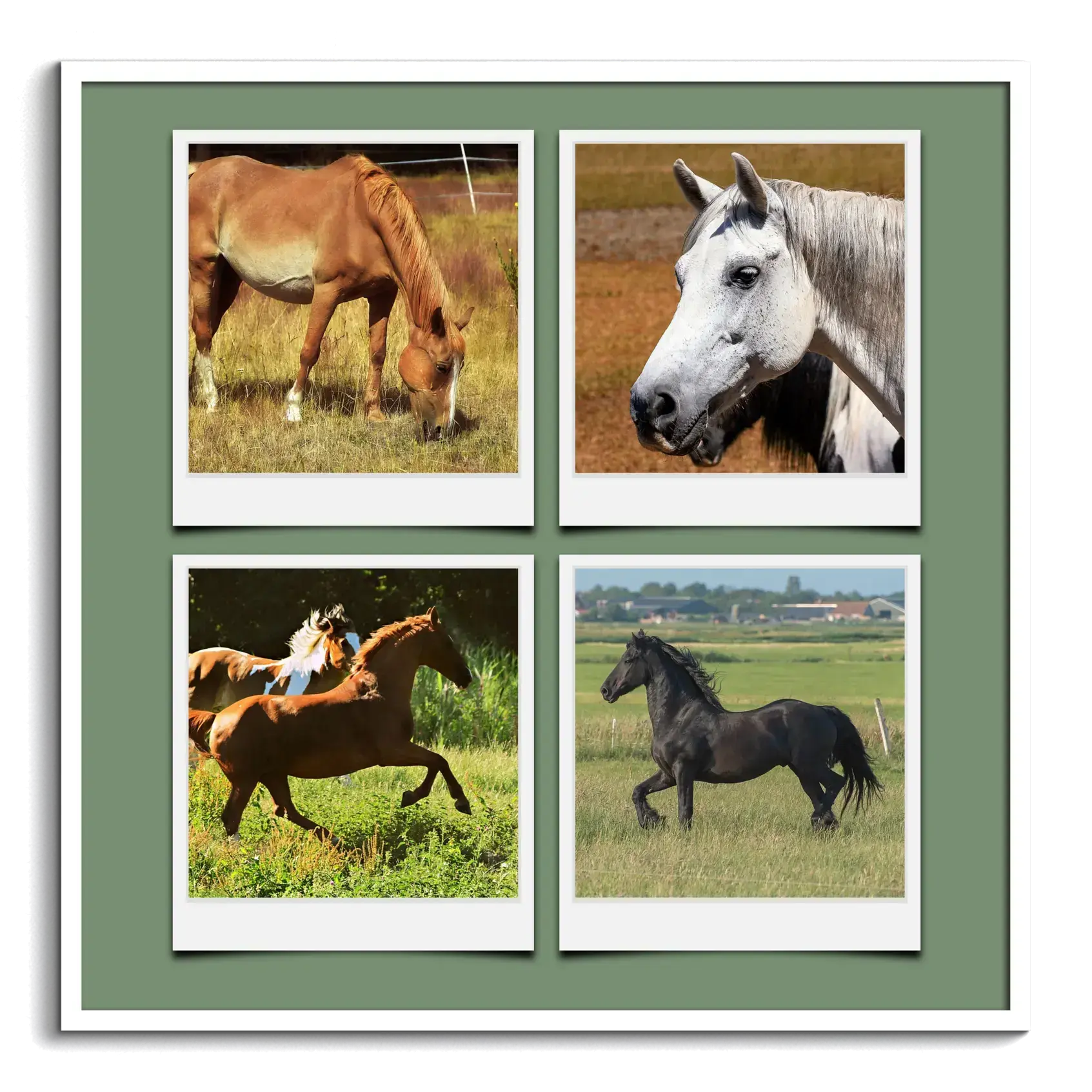 Créez votre propre pièce d'art visuel grâce à nos collages photo personnalisés. Imaginez une collection d'images de créatures majestueuses comme des lions en safari, des chevaux en galop, des oiseaux en vol ou des chats en pleine contemplation, le tout disposé de manière élégante dans un format Polaroid. Ajoutez une touche personnelle avec un texte comme "Wildnis", pour capturer l'essence de la nature.