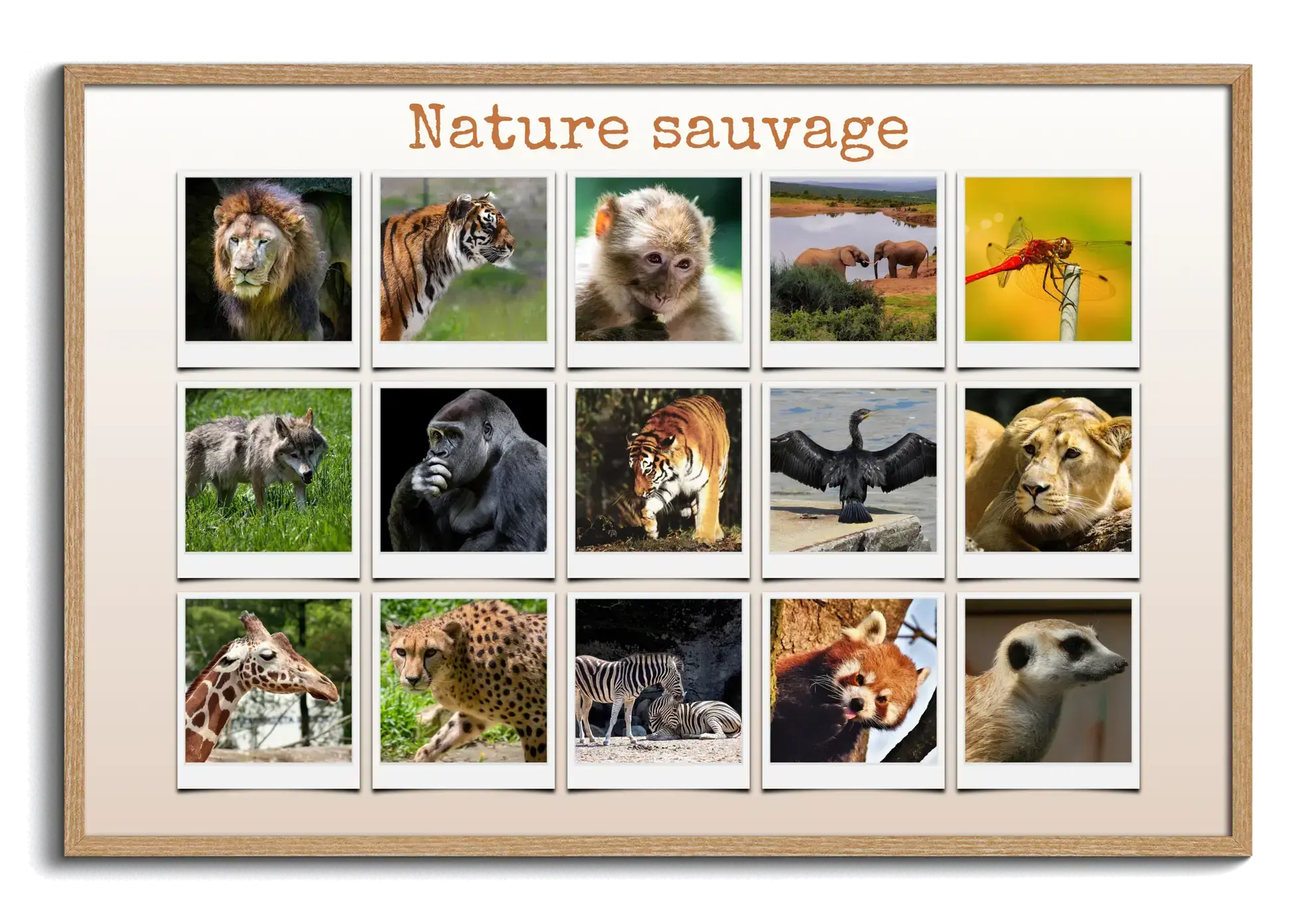 Animaux sauvages en Polaroid : safari, chevaux, oiseaux, chats. Texte unique : "Nature Sauvage".