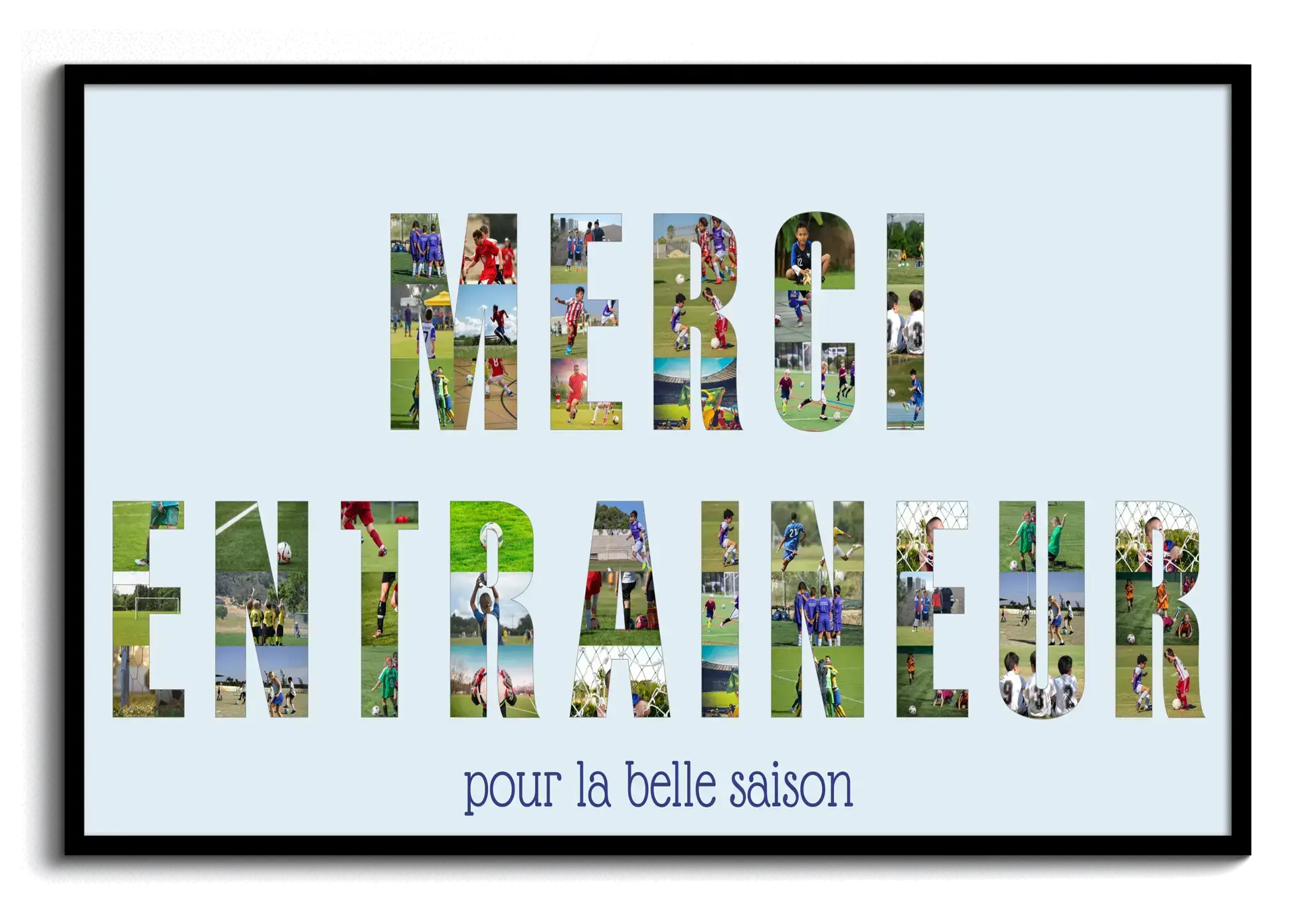 Créez une œuvre d'art personnalisée avec notre option de collage photo. Imaginez des mots comme "MERCI ENTRAÎNEUR" façonnés par vos propres photos, complétés par un message dédié comme "pour cette belle saison", que vous pouvez personnaliser selon votre désir. Idéal pour un cadeau spécial en fin de saison sportive ou pour immortaliser un moment précieux avec votre équipe.