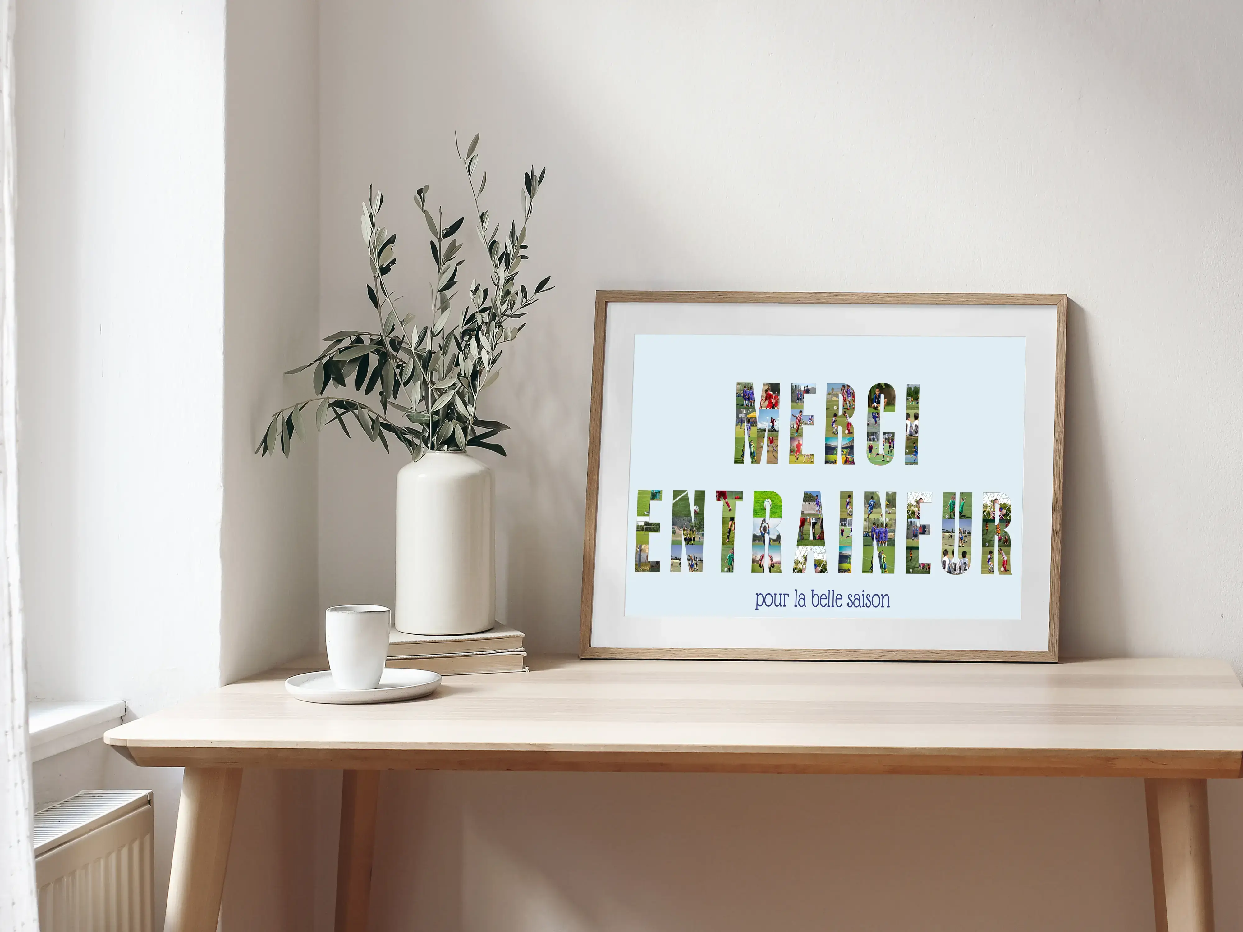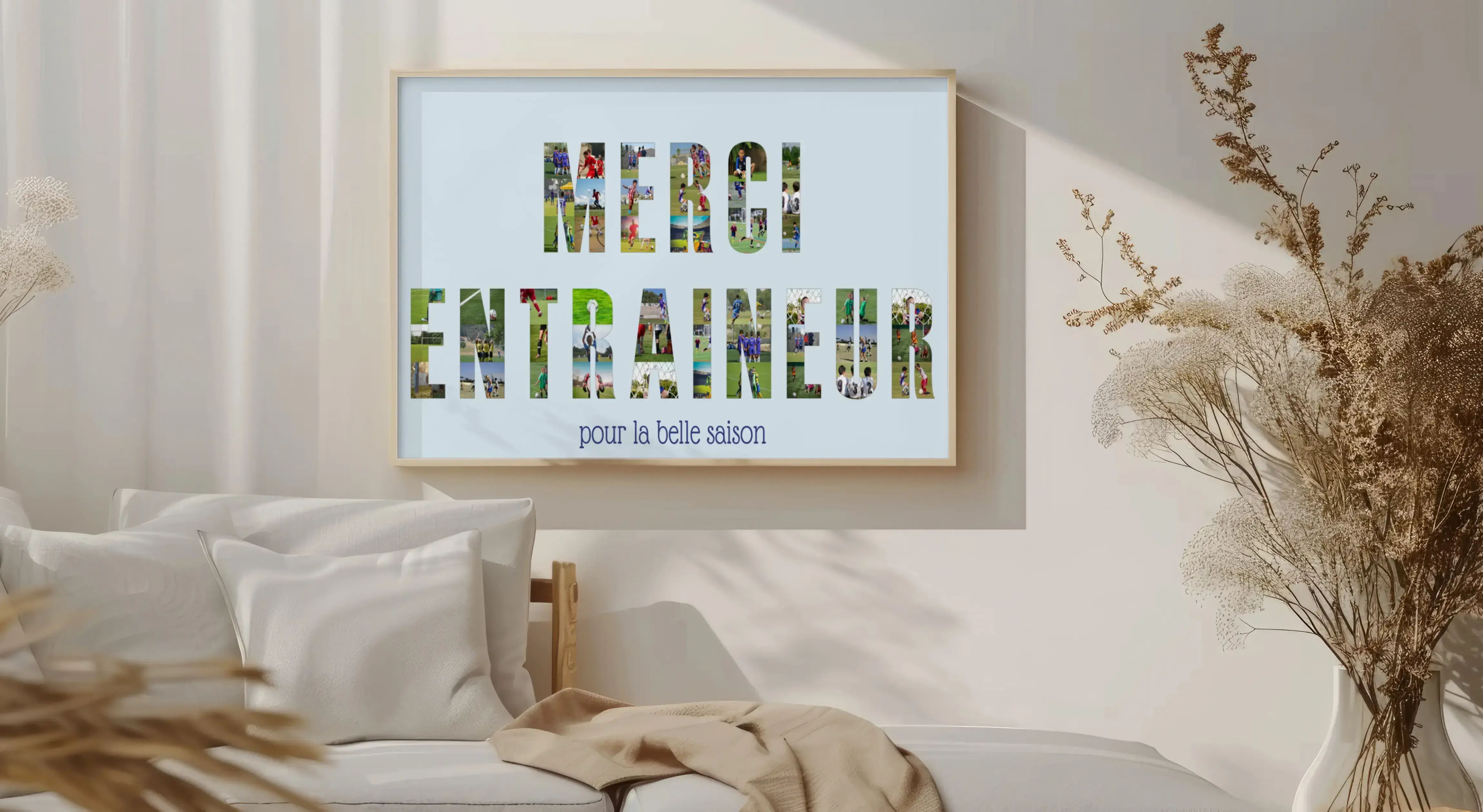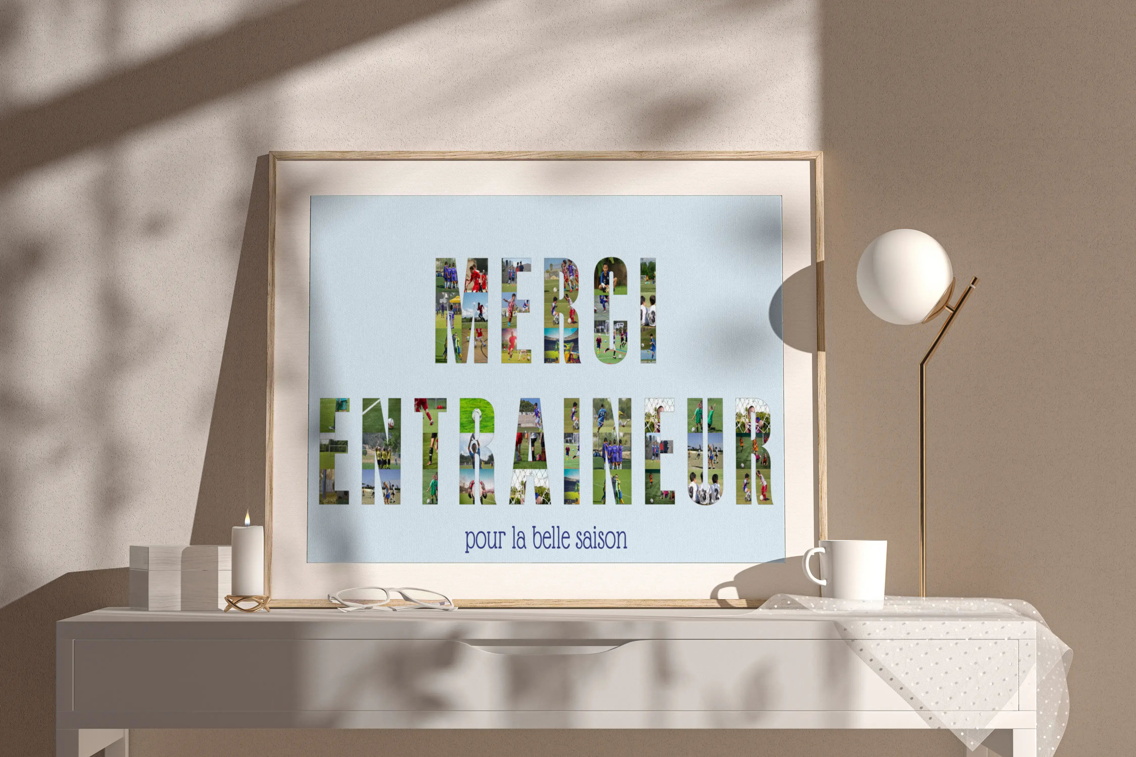 Créez une œuvre d'art personnalisée avec notre option de collage photo. Imaginez des mots comme "MERCI ENTRAÎNEUR" façonnés par vos propres photos, complétés par un message dédié comme "pour cette belle saison", que vous pouvez personnaliser selon votre désir. Idéal pour un cadeau spécial en fin de saison sportive ou pour immortaliser un moment précieux avec votre équipe.