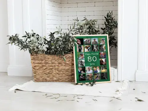 Créez maintenant une affiche anniversaire 80 personnalisée: une grande 80 au centre, le prénom en haut et un message en bas, entourés de 20 à 80 photos en grille. Modifiez le chiffre, le nom, les mots, la quantité d’images, le fond, les couleurs et l’orientation pour un souvenir unique.
