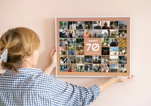Créez maintenant une affiche anniversaire 70 personnalisée. La grande 70 trône au centre, le prénom au-dessus, un message en dessous, entourés de 20 à 80 photos en grille. Modifiez le chiffre, le nom, le texte, les couleurs, le fond et l’orientation pour un cadeau de 70 ans, noces de platine ou départ à la retraite.