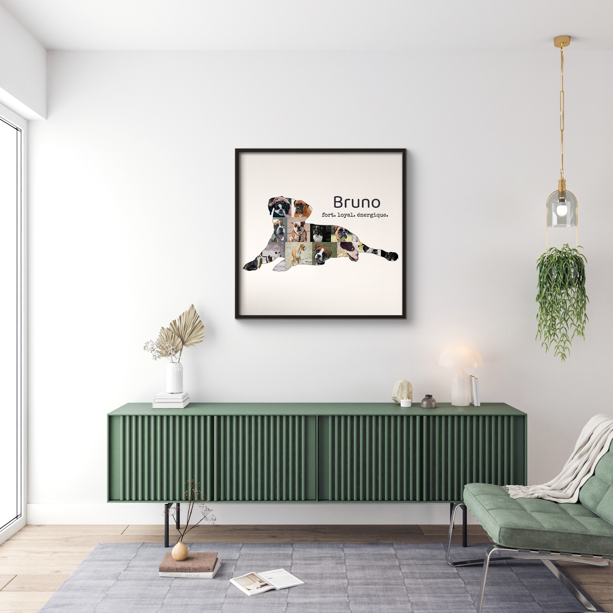 Designez votre propre collage personnalisé en rendant hommage à votre fidèle compagnon à quatre pattes. Cette incroyable silhouette de boxer peut être remplie avec 15 à 20 de vos photos préférées, créant une œuvre d'art unique. Ajoutez une touche personnelle avec un texte tel que fort, loyal, énergique. Parfait pour tout amoureux de chiens.