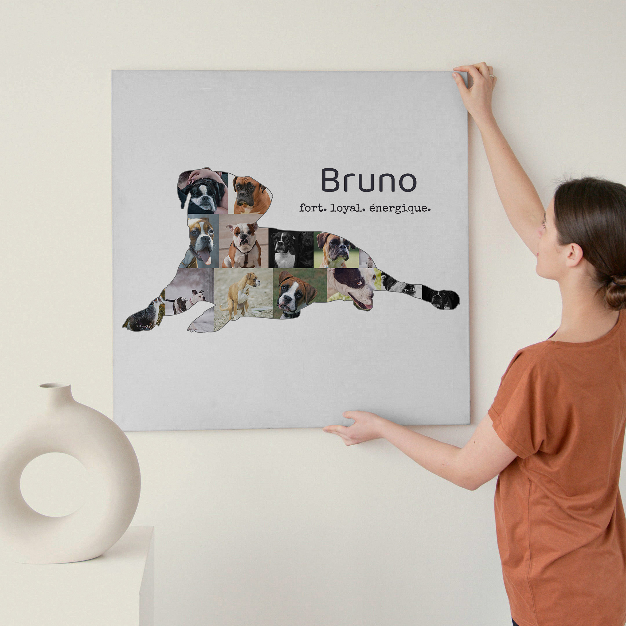 Collage photo personnalisée pour boxer, parfaite pour les amoureux des chiens et souvenirs uniques.