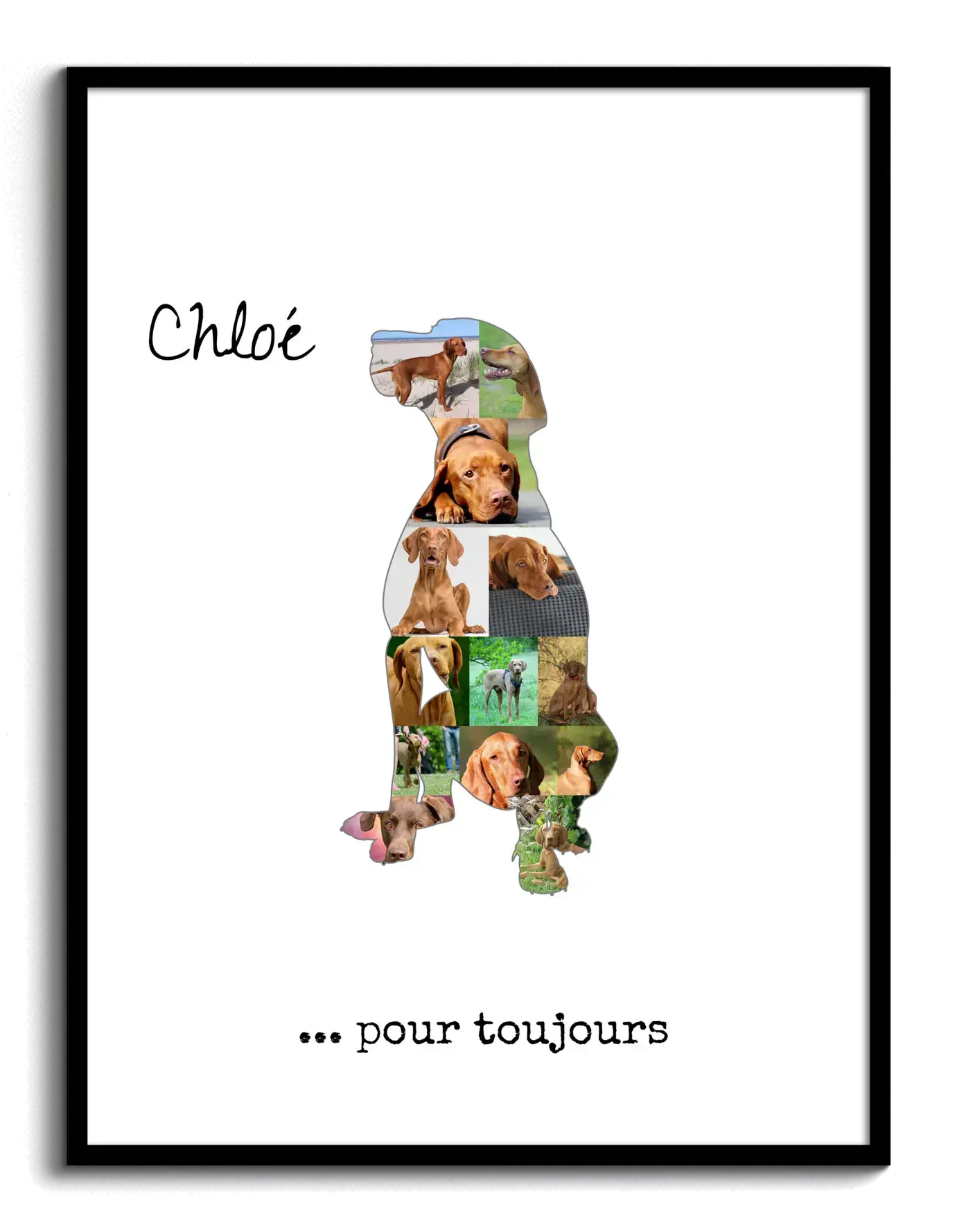 Créez votre propre collage photo personnalisé pour honorer votre fidèle compagnon à quatre pattes ! Avec notre modèle spécial pour les propriétaires de chiens, vous pourrez remplir la silhouette d'un Vizsla, assis ou debout, avec 15 à 20 de vos propres photos. Ajoutez une touche personnelle avec un texte comme "pour toujours" ou "amour". Ce produit s'adresse à tous les amoureux des chiens qui souhaitent créer un souvenir unique.