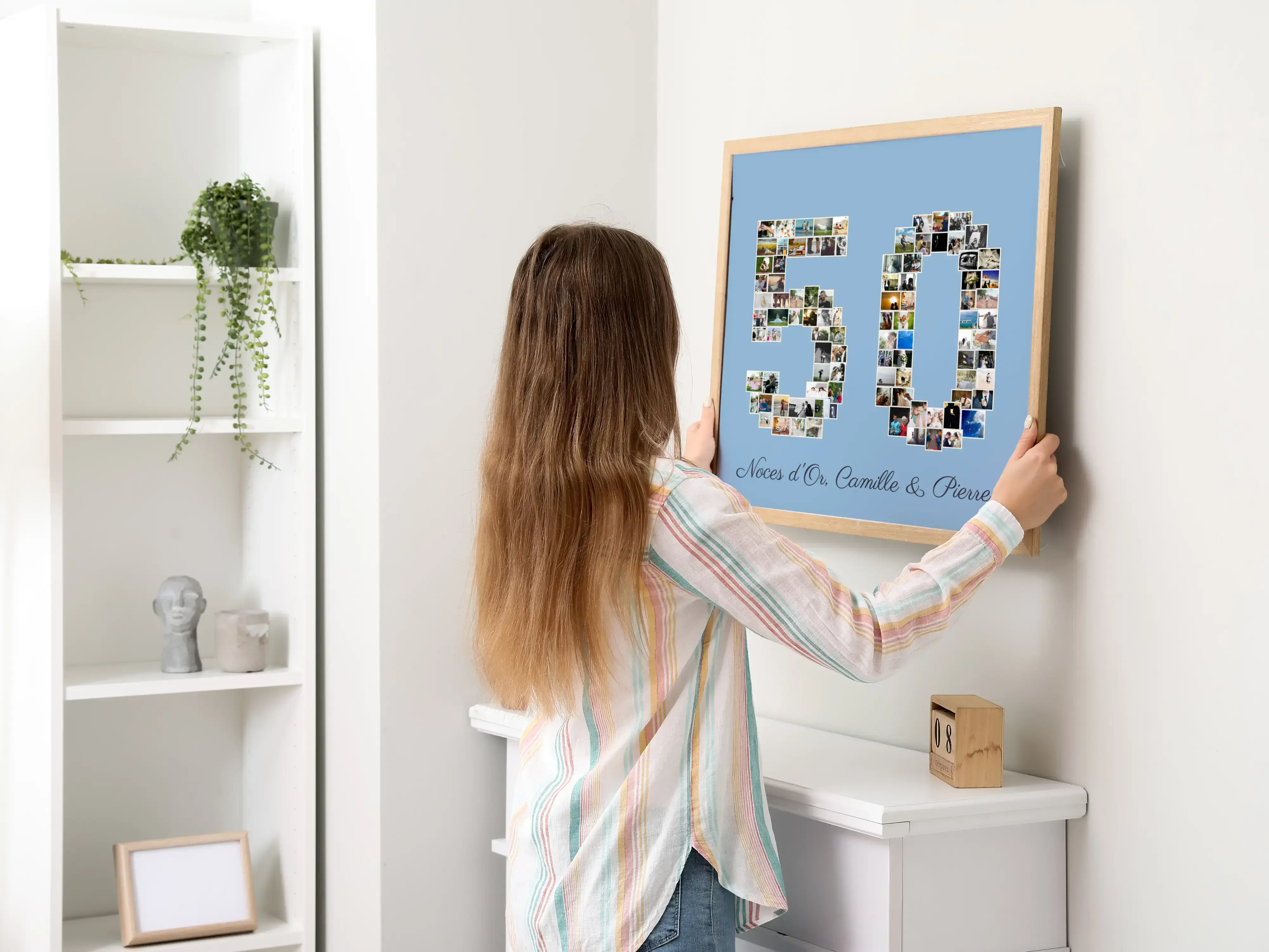Créez facilement votre propre collage photo personnalisée et faites briller les moments importants de votre vie ! Grâce à notre modèle unique, concevez un magnifique collage en forme de nombre, tel que "50", en utilisant jusqu'à 100 photos de votre choix. Idéal pour célébrer un anniversaire mémorable ou des noces d'or.