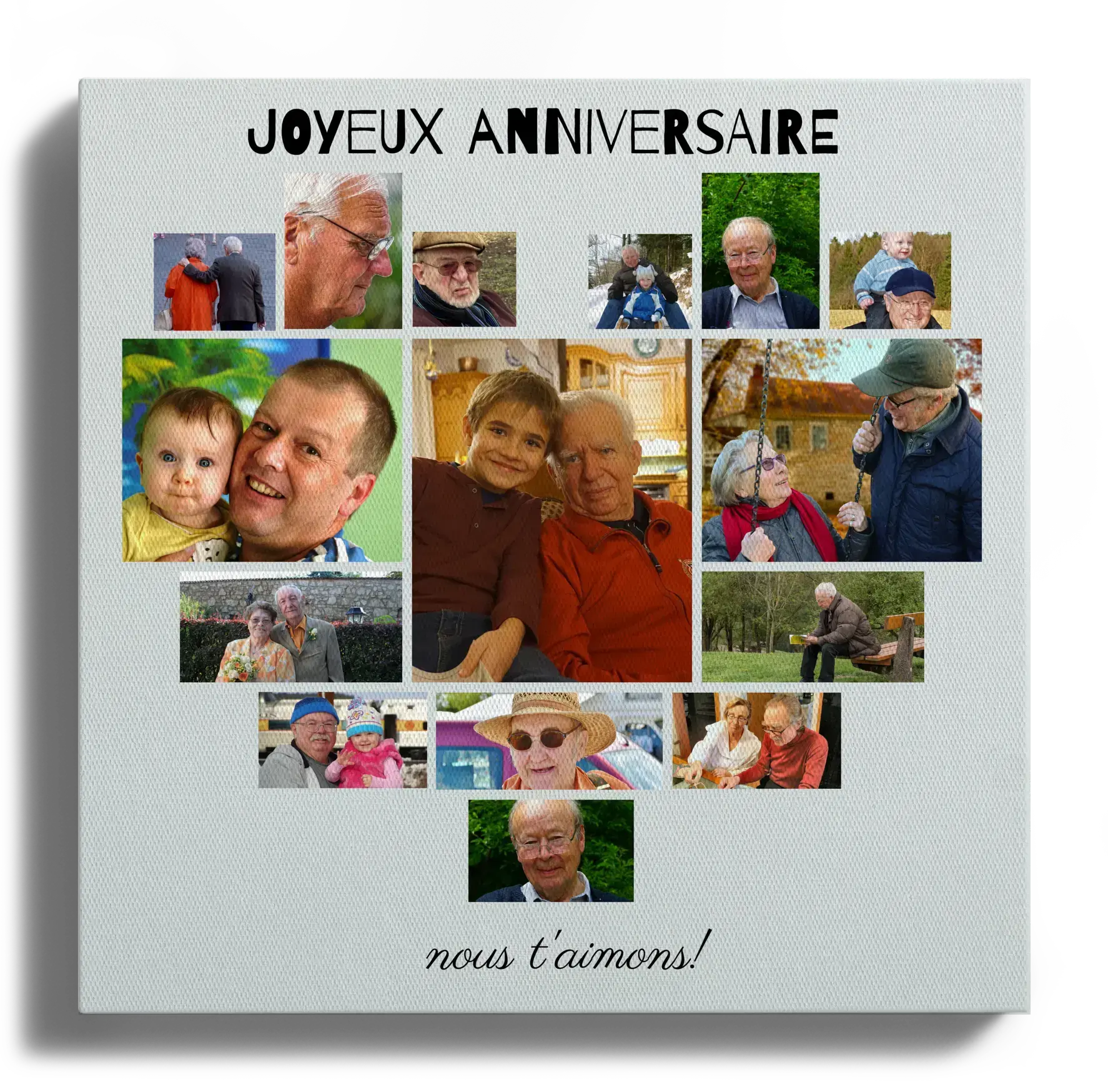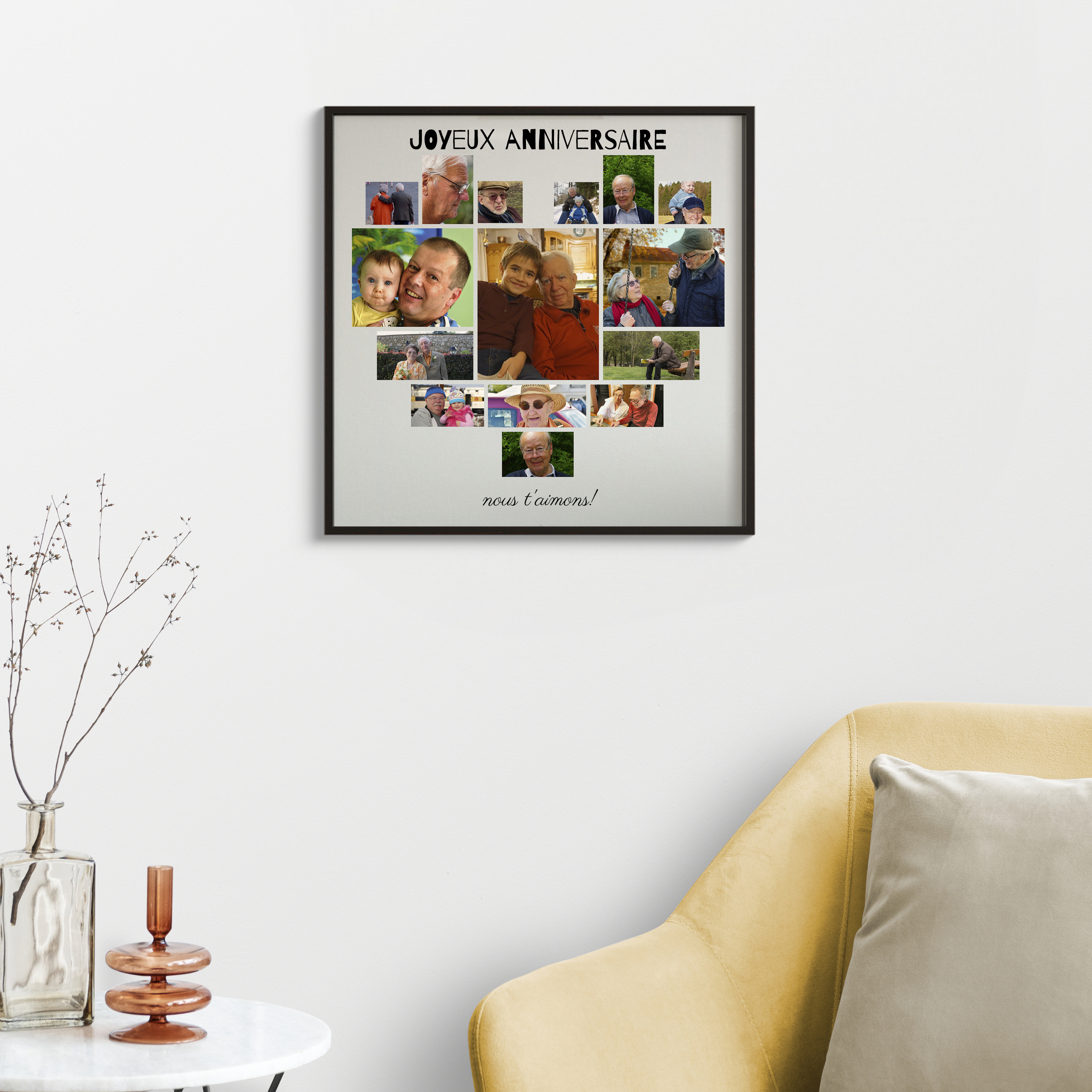 Créez une œuvre unique avec votre propre collage photo personnalisé. Imaginez un cœur magnifique composé de vos photos préférées, imprimé en un poster éclatant. Offrez-le comme un cadeau émouvant pour un anniversaire, complété par le message "Happy Birthday, nous t'aimons". C’est une façon créative de montrer votre affection.