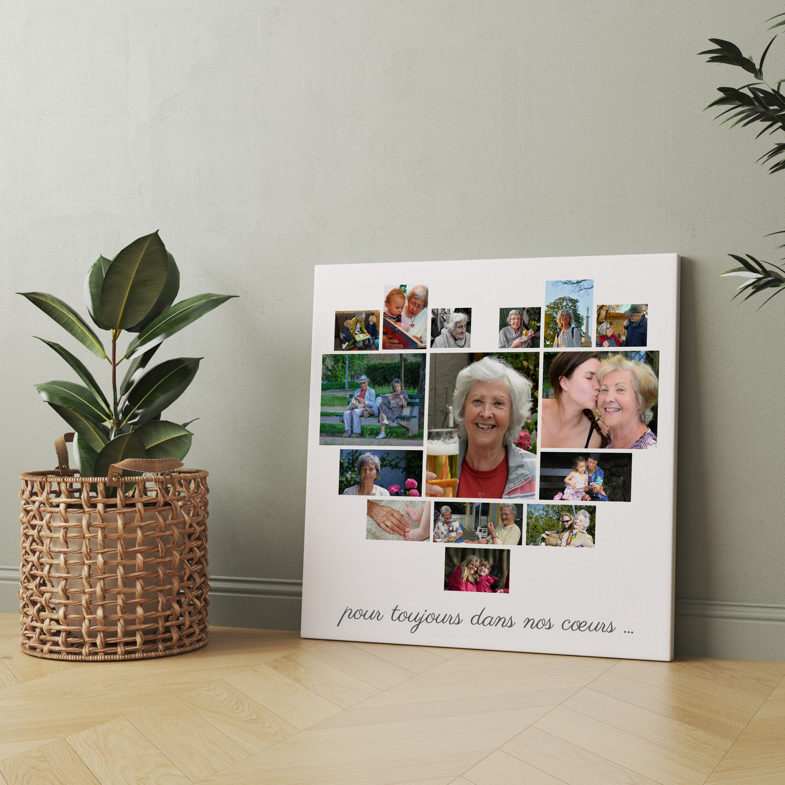Créez votre propre collage photo personnalisé et offrez un cadeau mémorable. Imaginez une magnifique photomosaïque en forme de cœur, où de nombreux clichés de votre grand-mère prennent vie dans un élégant poster. Au centre, une photo plus grande est mise en valeur, accompagnée d'une pensée touchante : pour toujours dans notre cœur. Idéal pour célébrer un anniversaire, une cérémonie de commémoration ou simplement pour montrer votre affection. Personnalisez les photos, le texte, les couleurs de fond, la police et la mise en page selon vos envies.
