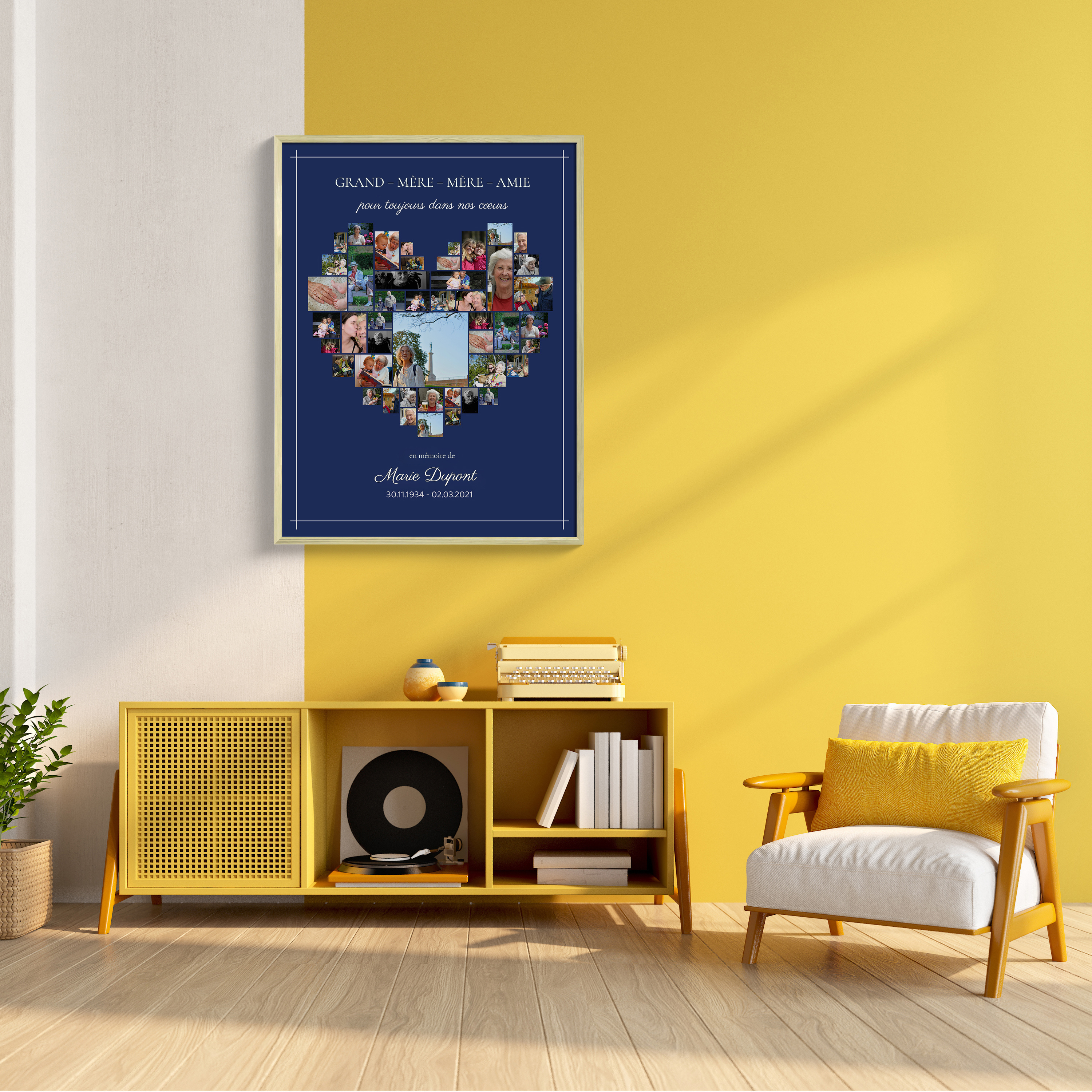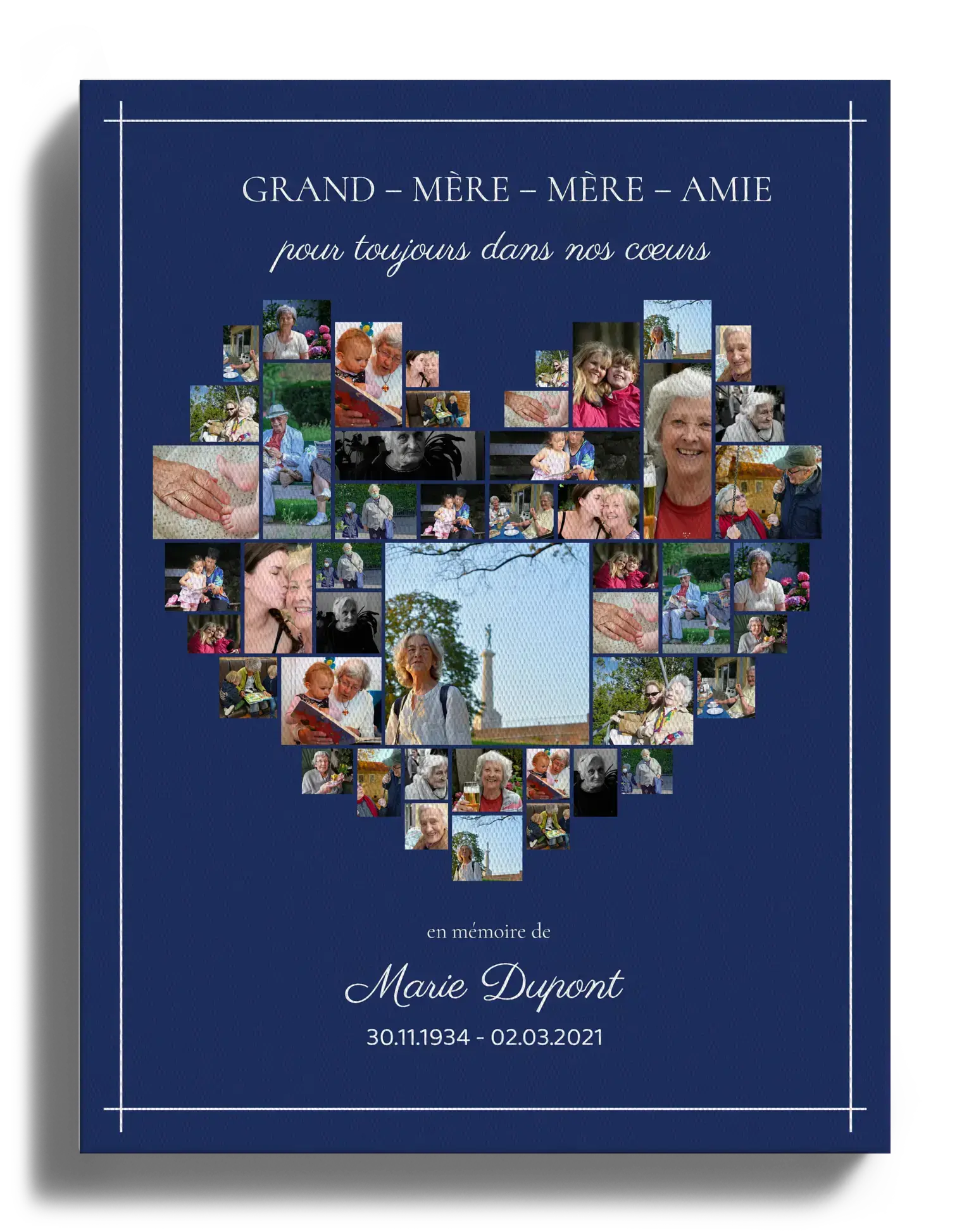 Collage souvenir en forme de cœur, hommage personnalisé sur toile premium.