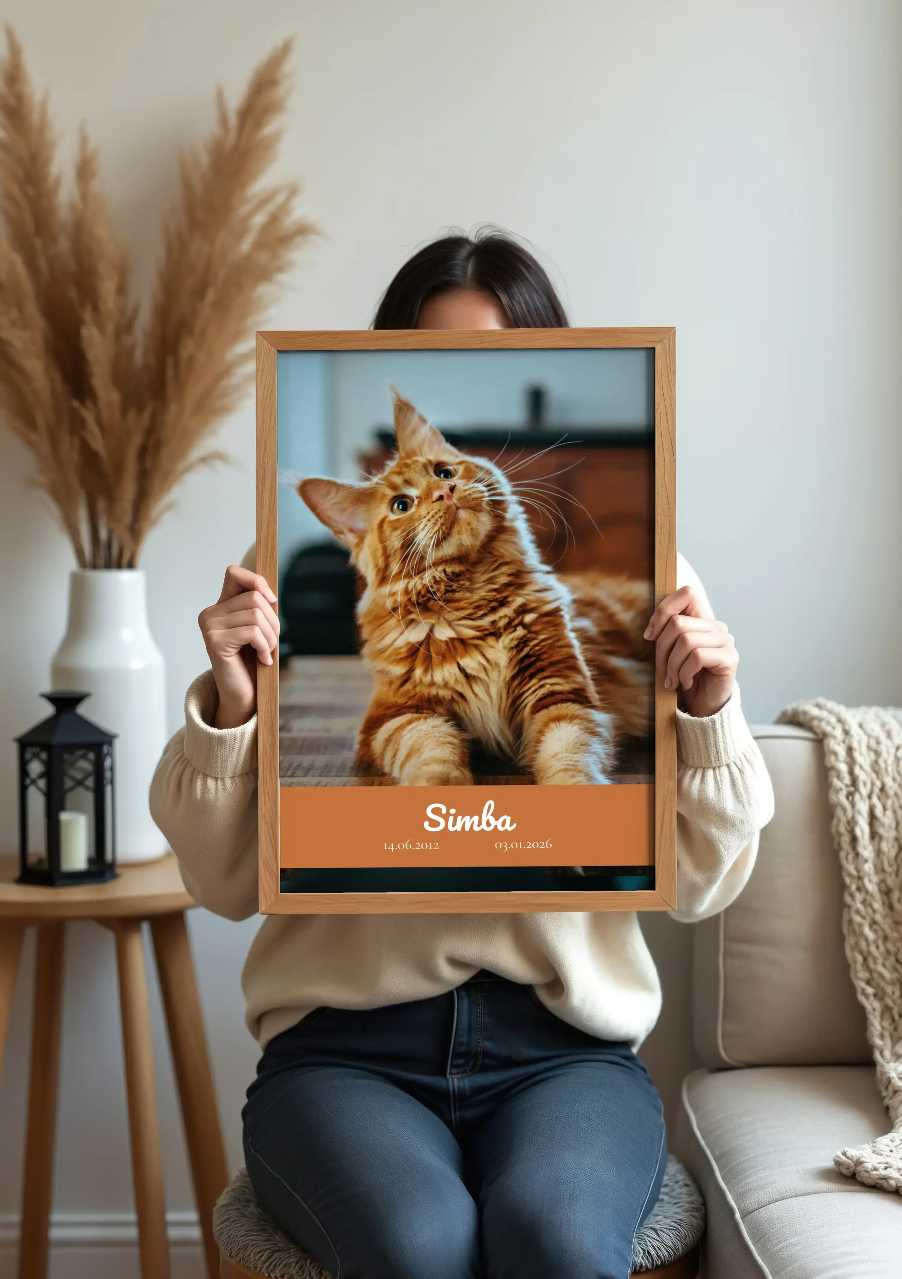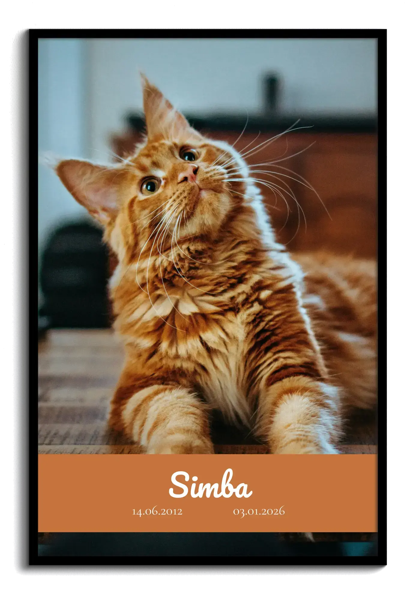 Créez et commandez maintenant. Exemple présenté: une affiche hommage pour un chat disparu, avec une grande photo et un bandeau coloré en bas pour afficher le nom et les dates de vie. Modèle de la catégorie Deuil – image unique, entièrement personnalisable avec votre photo, le nom, les dates et un court message souvenir.
