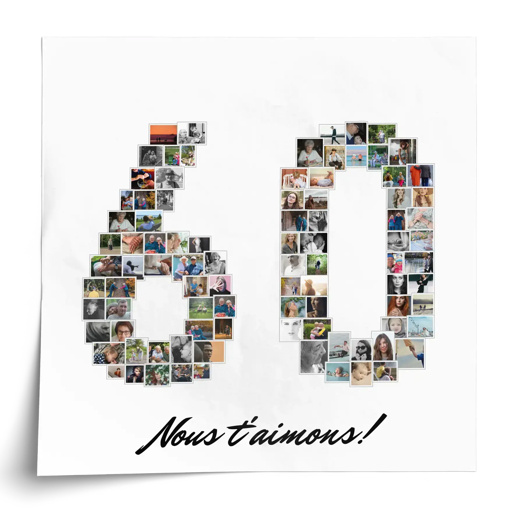 Créez une œuvre d'art unique et personnalisée avec notre produit de collage photo spécialement conçu pour les anniversaires mémorables ou les départs à la retraite. Imaginez la silhouette du nombre 60 formée par vos moments les plus précieux. Avec la possibilité d'utiliser entre 1 et 100 photos, offrez un cadeau vraiment significatif pour marquer cette étape importante.
