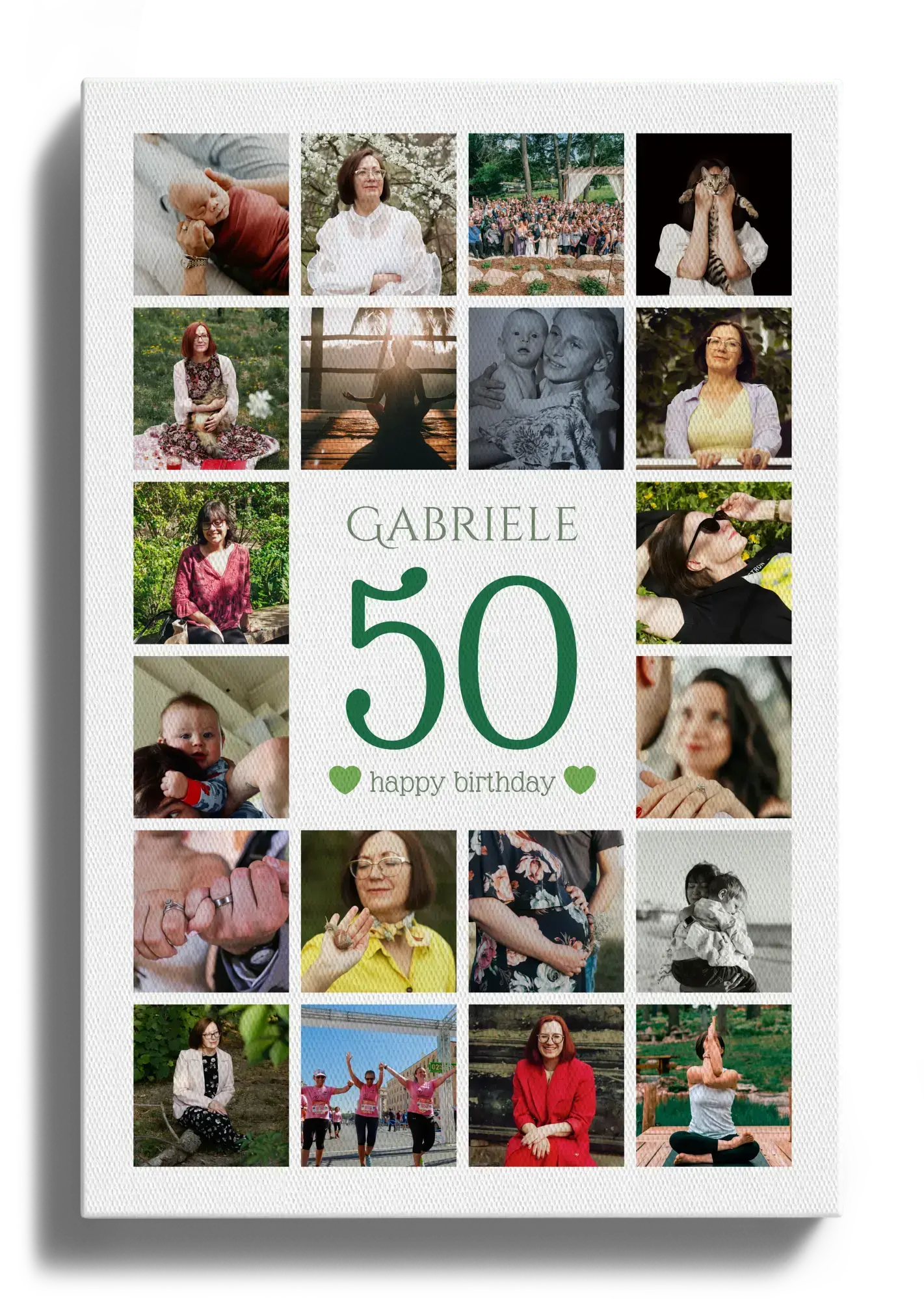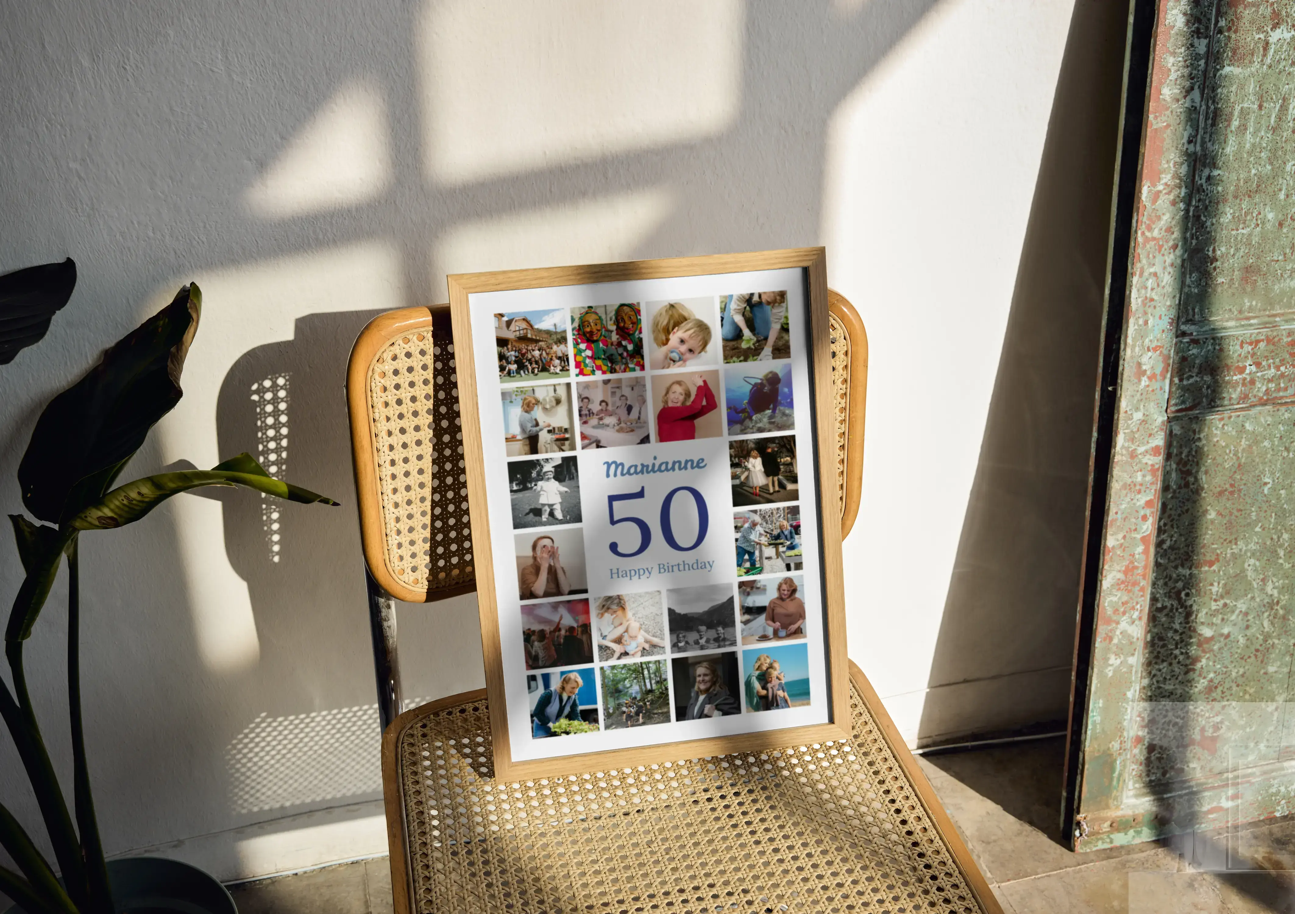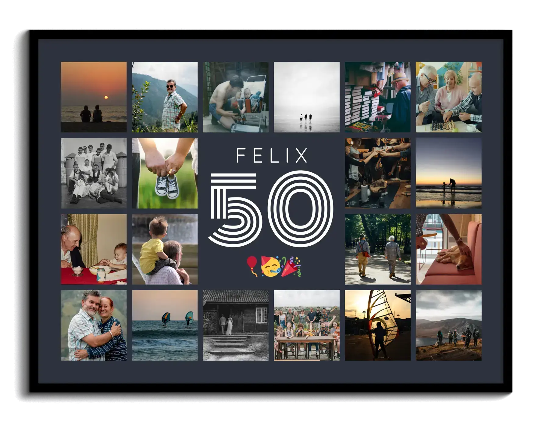 Collage anniversaire 50: grand chiffre centré, nom, message et 20–80 photos, personnalisable.